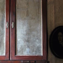 The piece is in good clean overall structural condition and there are no issues with stability. She has been polished at some point over the last decade or so with a very healthy rich patina and colour. The original keys aren’t present but they some replacements will be provided on sale. There are no problems with the drawers or shelves with the bevelled mercury glass mirrored doors shimmering beautifully in the light showing foxing and spotting.