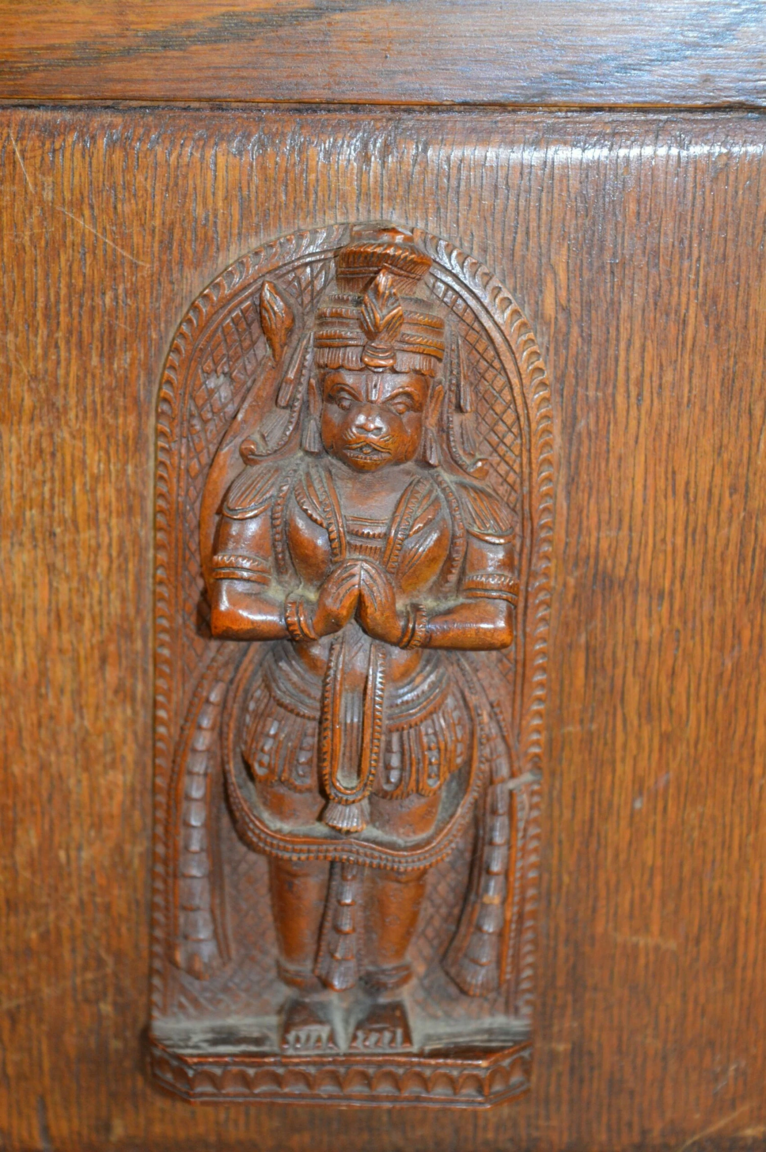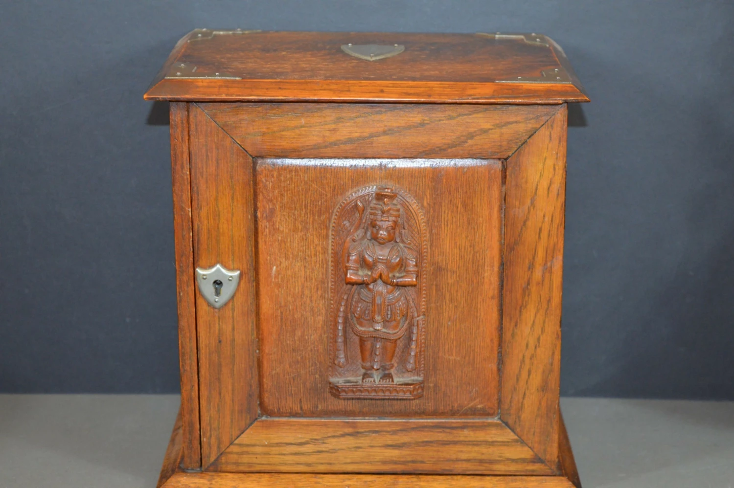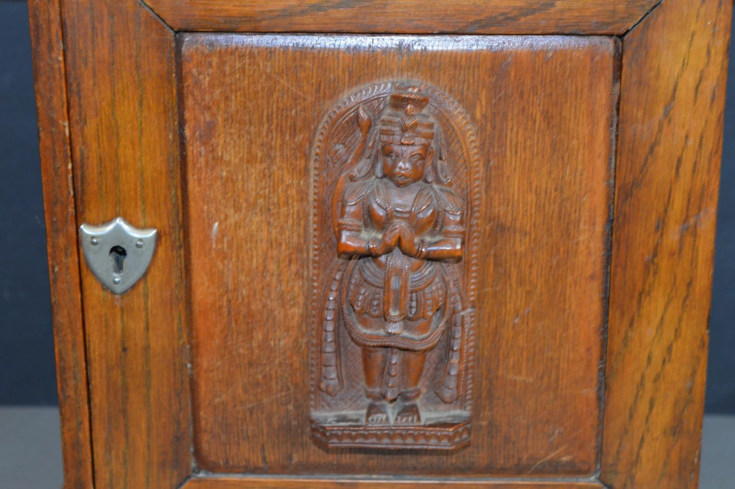 edging to the top. The door is decorated with a carved central figure which appears to be a Hindu deity. The interior has a shelf and brackets, presumably for holding