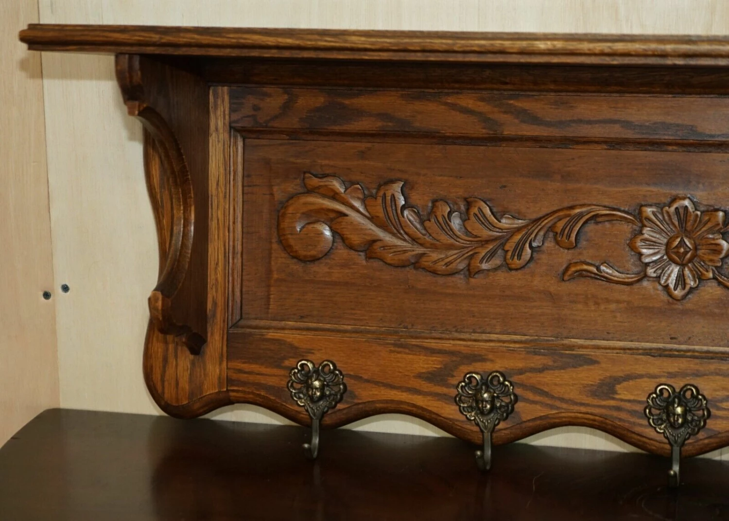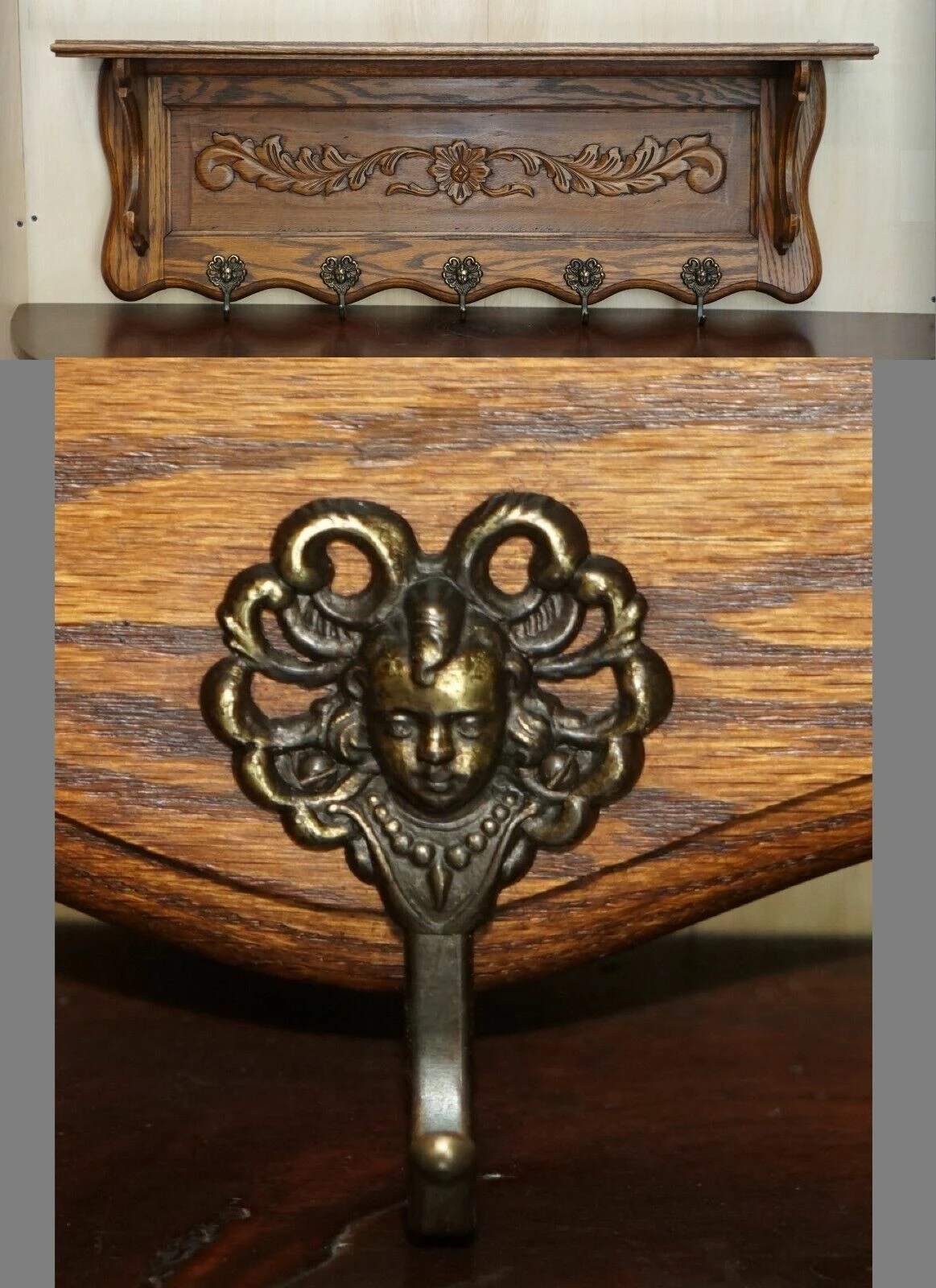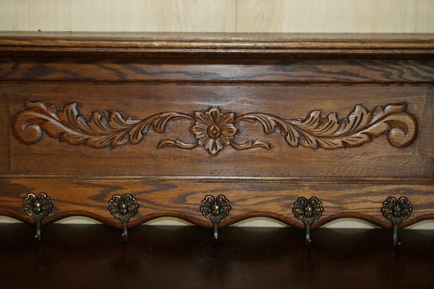 Royal House Antiques is delighted to offer for sale this lovely, heavily carved Dutch oak wall hanging coat hat and scarf rack with French Royalty head gold gilt brass hooks