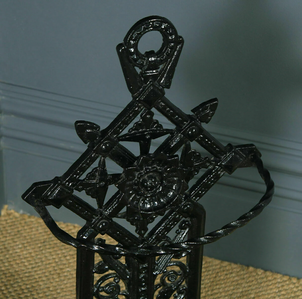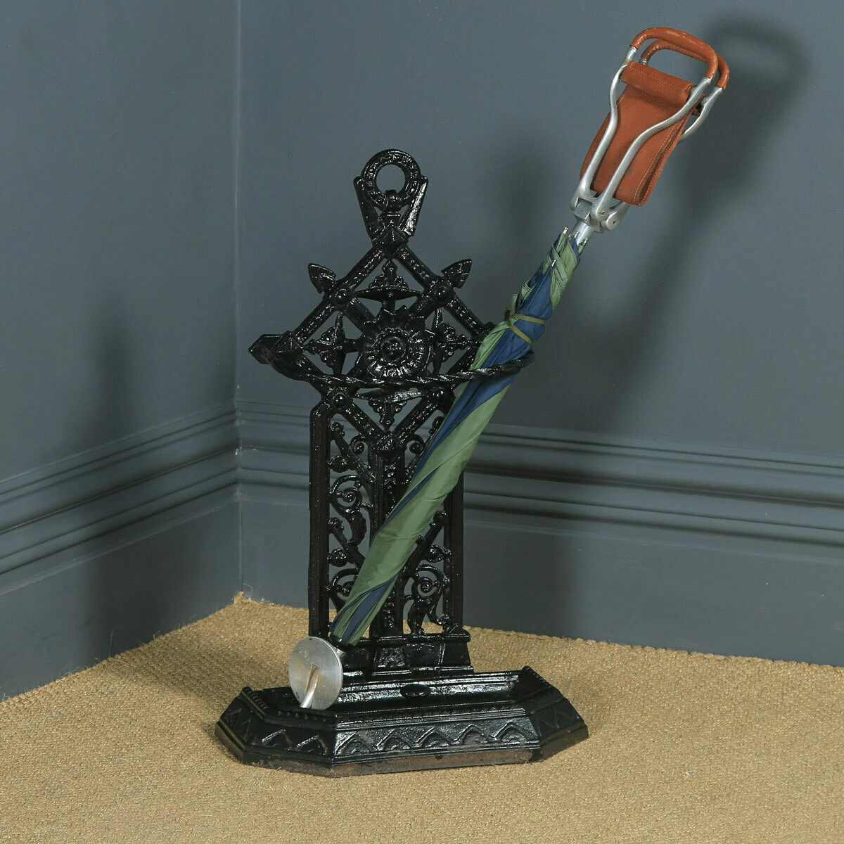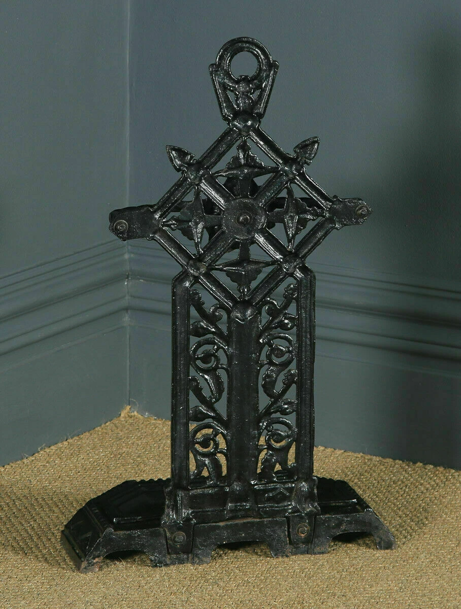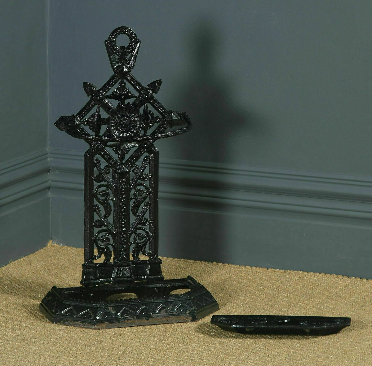 This is a fine quality antique English Victorian painted cast iron stick & umbrella hallstand, circa 1890, in good original condition. The stand comprises a cast ring sat atop a diamond shape upper frame, which also features protruding spear tips, a large central cast flower and is connected to a twist ring umbrella support. Below, the diamond shaped upper frame joins to a vertical lower frame. Both sections of the upright frame display profuse cast iron floral open fretwork. The triangular pediment with clover leaf shaped top and carved face & leaves, above two carved panels depicting mythological creatures, intersected by a gadroon carved support bar. The upright frame connects to the rear of a floral and geometric design moulded base, which retains the original drip tray. The item is solid in joint and ready to use.