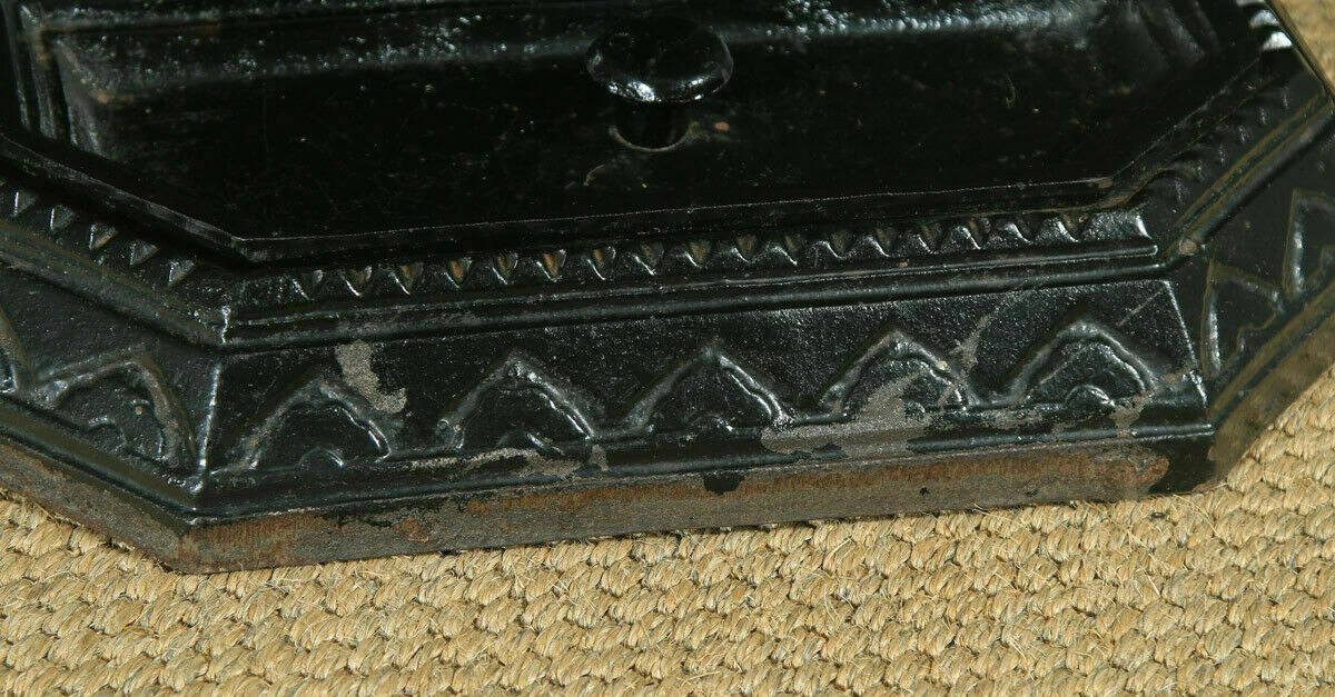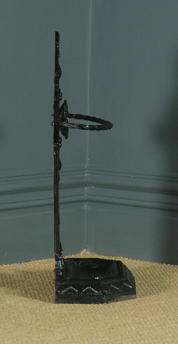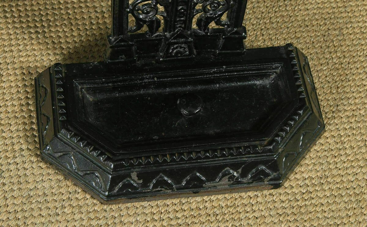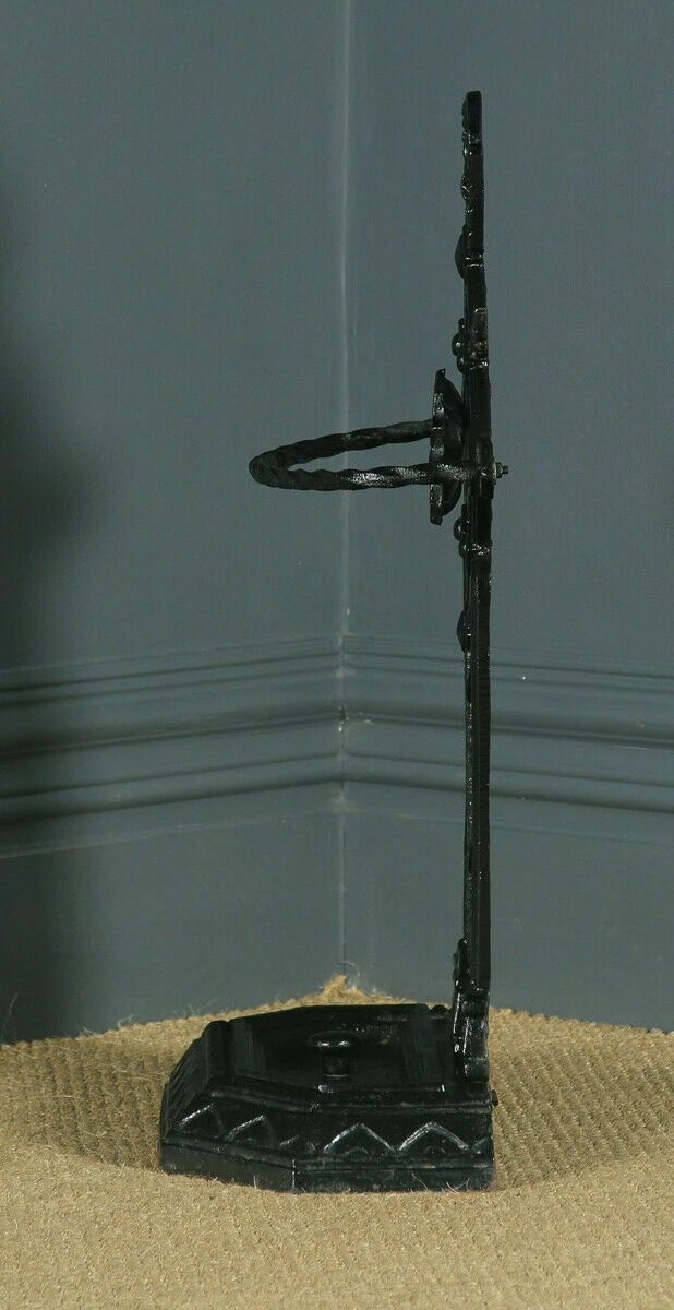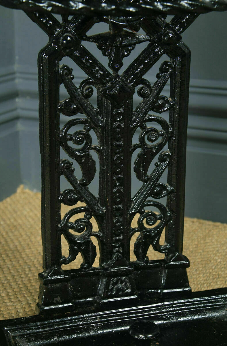 This Victorian cast iron umbrella hall stand is in good and original condition. Nominal old use marks to the leading edges, but nothing significant considering the age of the item. The black paint is in good overall condition, with some small amounts missing around the base (see photo). There are no missing pieces or breaks to the cast iron. This item is solid in joint and ready to use.