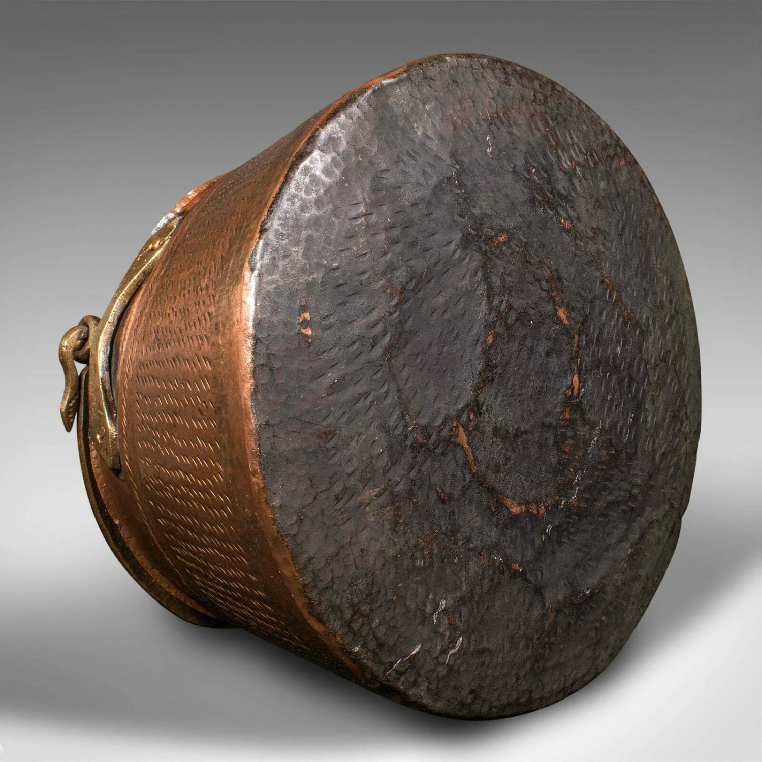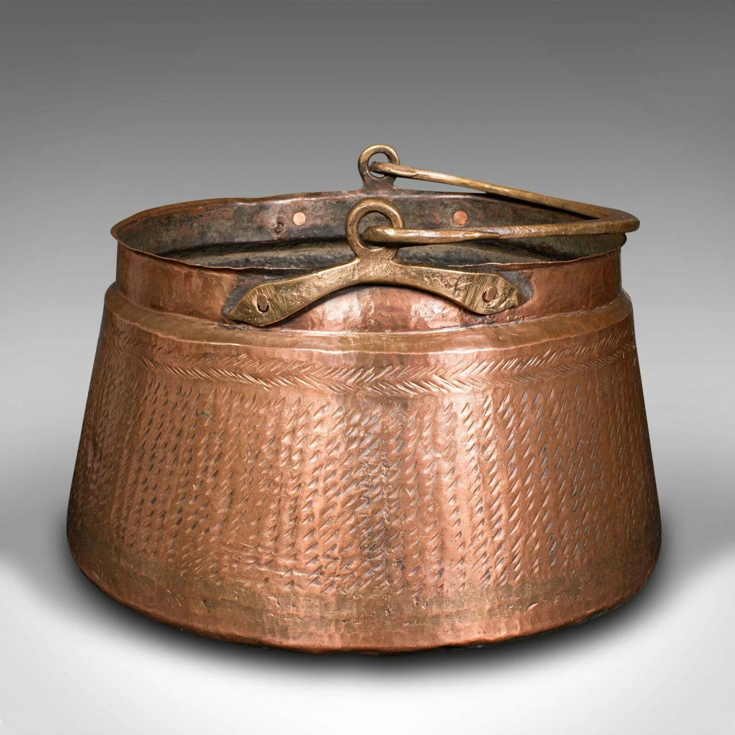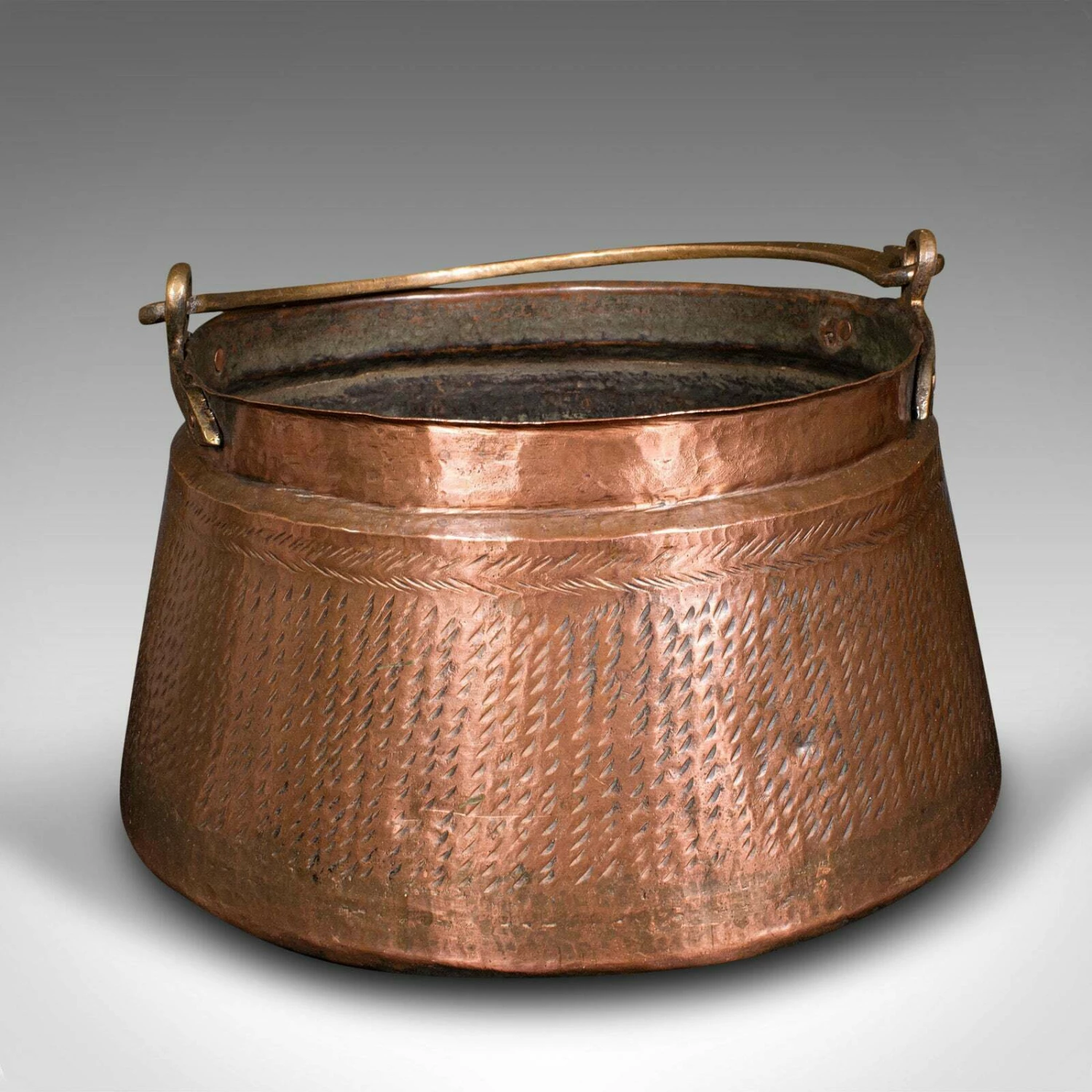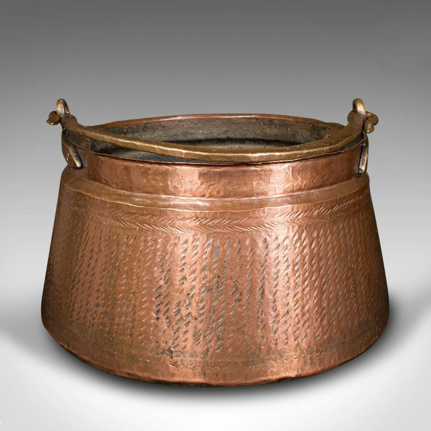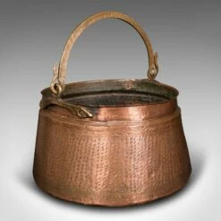 This is an antique fireside fuel basket. An Indian, copper and bronze handled daal pot, dating to the early Victorian period, circa 1850.