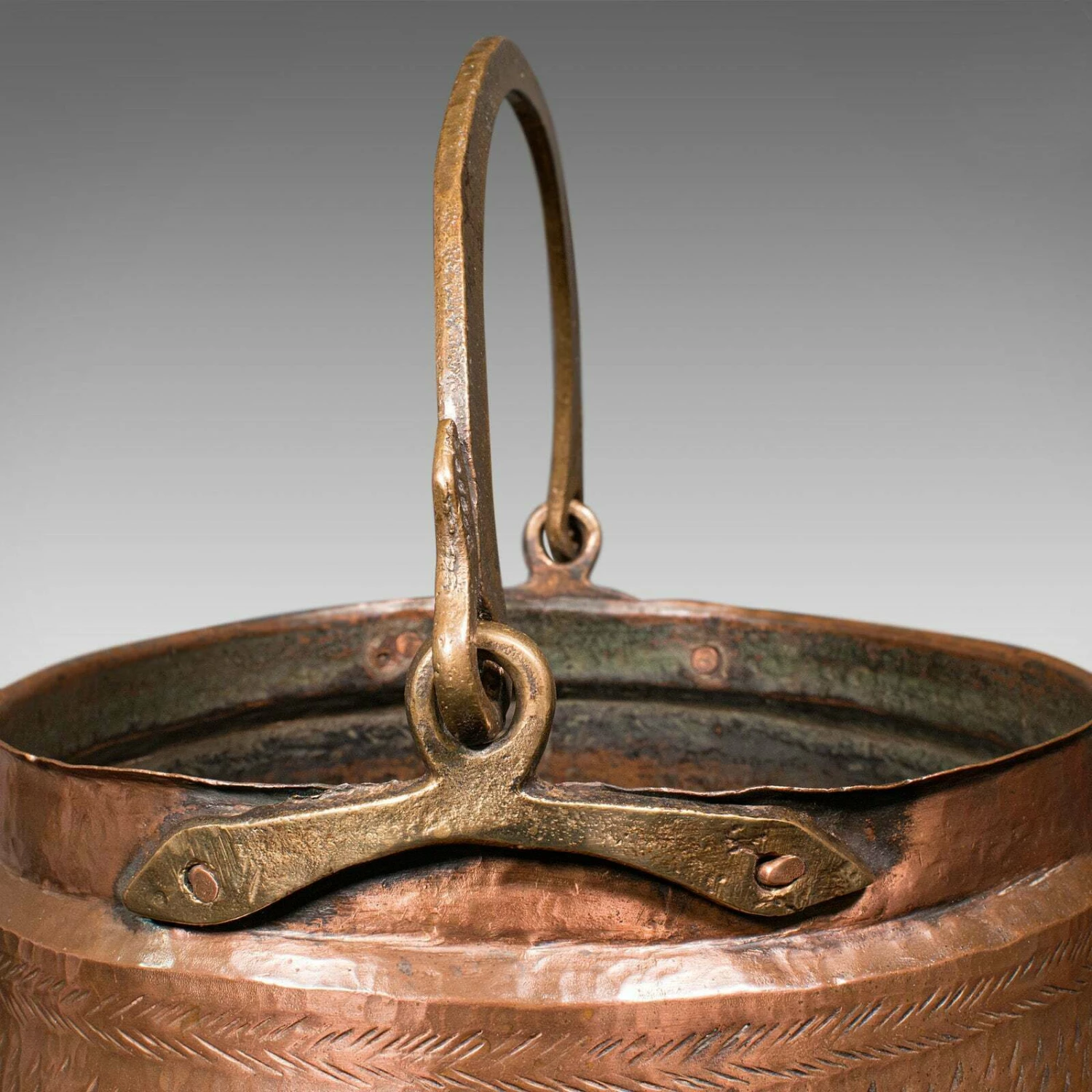 Distinctive naive hatched pattern accentuates the copper body