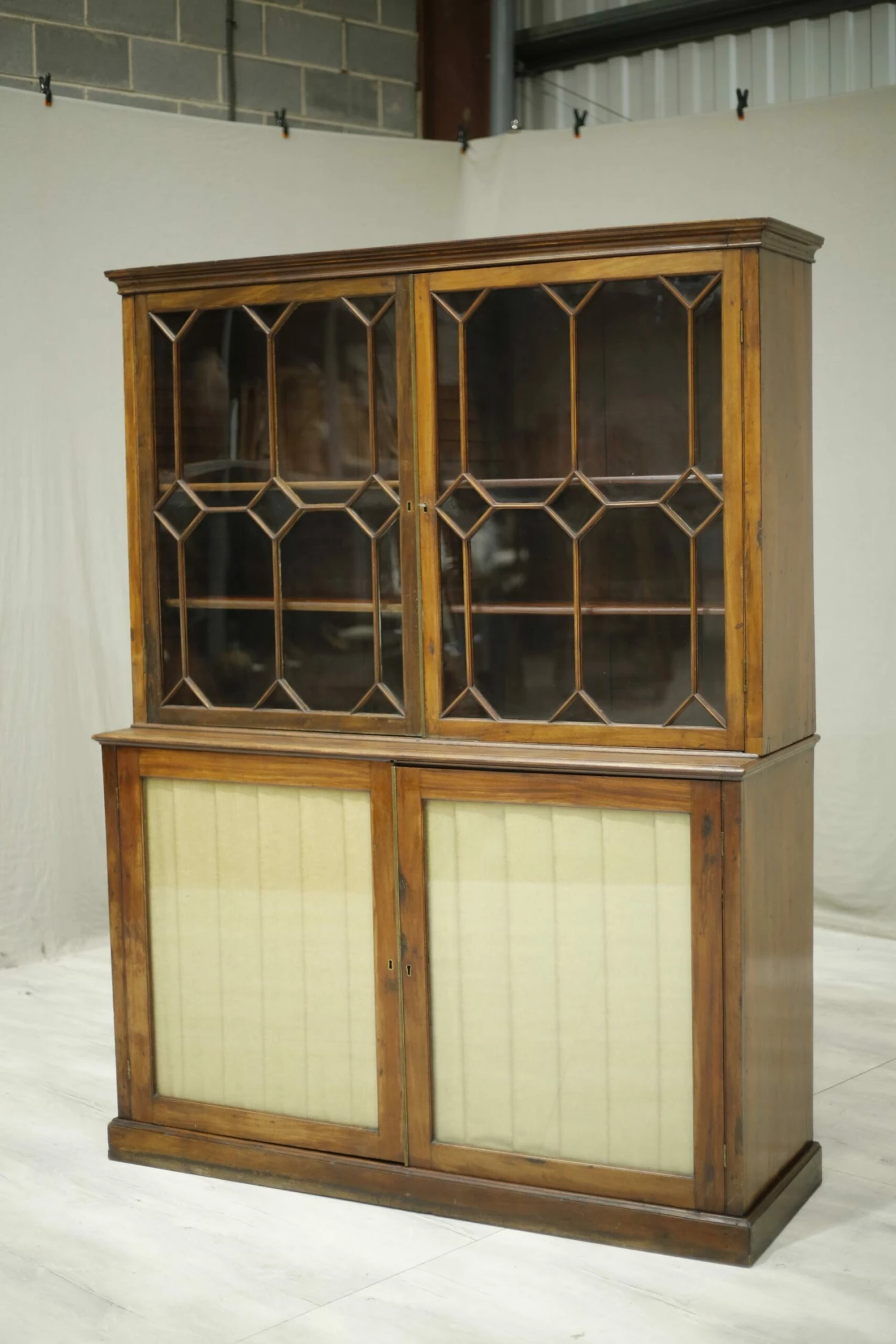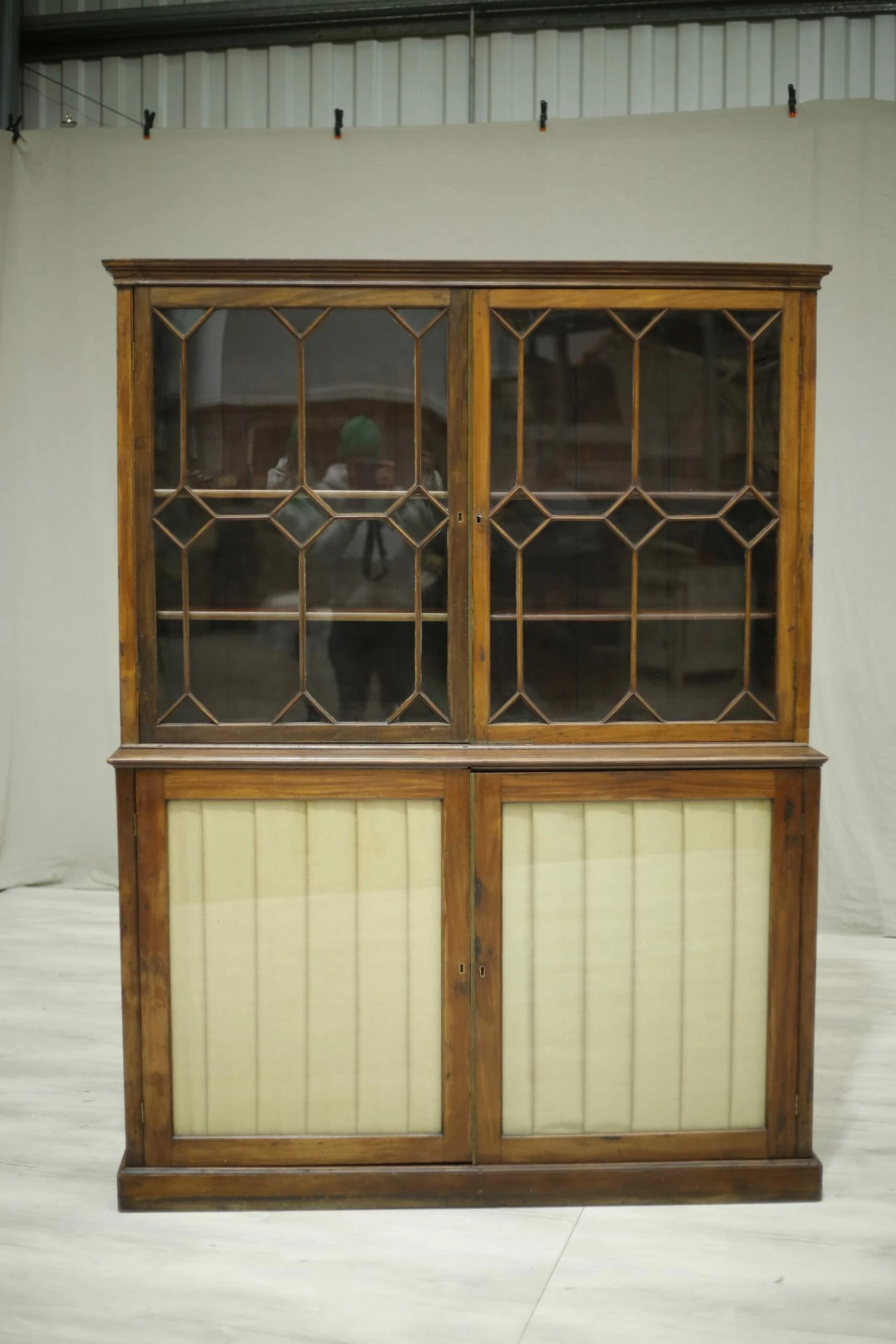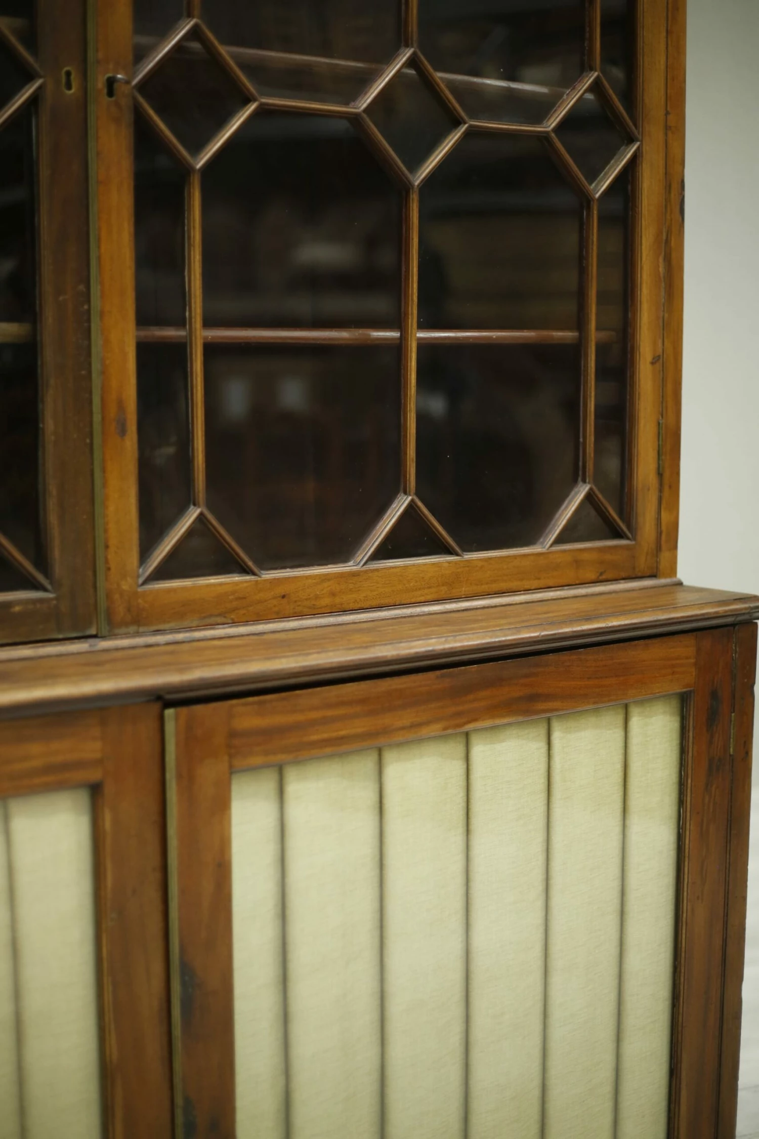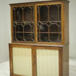 This is a very nicely made Georgian library cabinet. Made from mahogany and in nice original condition. The only modern change is the silk pleats but you can’t tell this unless viewed from inside. The design over the glass is fabulous and gives this piece a real country house elegance. There are adjustable shelves in both sections of the cabinet making it a very practical piece of furniture. Overall a very high quality piece of antique furniture.