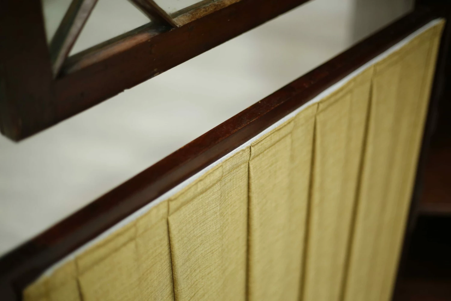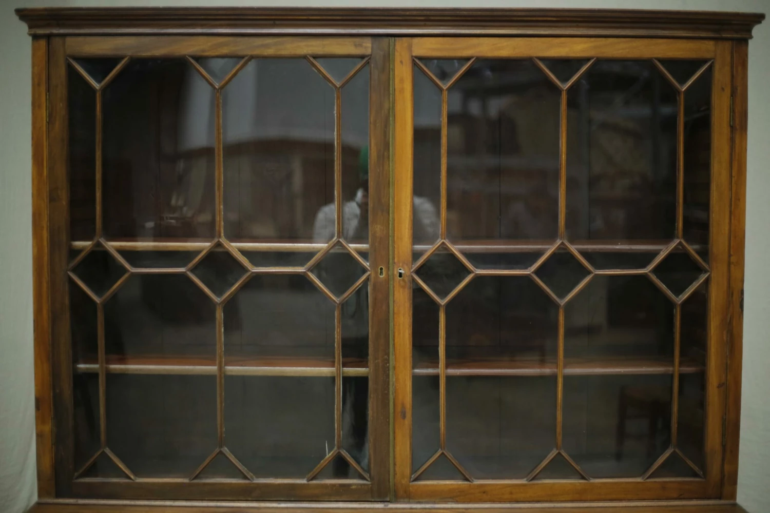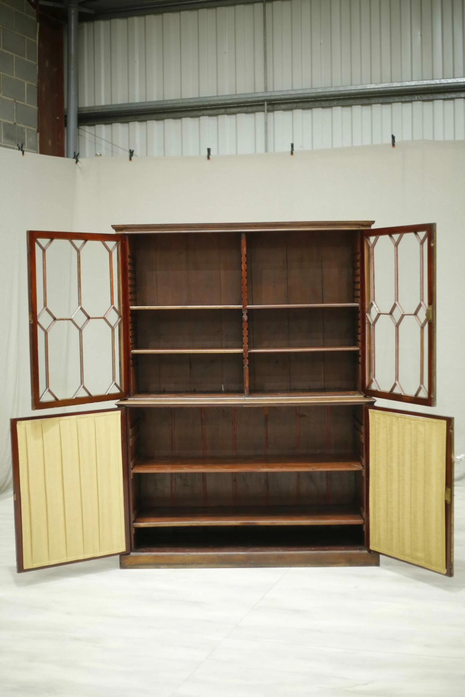 This is a very nicely made Georgian library cabinet. Made from mahogany and in nice original condition. The only modern change is the silk pleats but you can’t tell this unless viewed from inside. The design over the glass is fabulous and gives this piece a real country house elegance. There are adjustable shelves in both sections of the cabinet making it a very practical piece of furniture. Overall a very high quality piece of antique furniture.