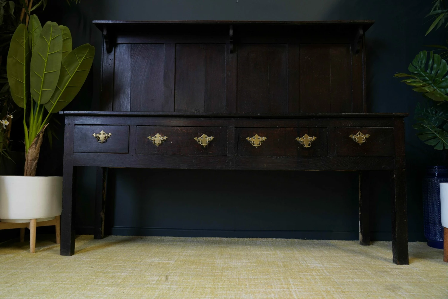 A simple design, with back panelling under a single shelf (which can be removed), over four drawers – the only decoration coming from the pretty brass bail pull handles.