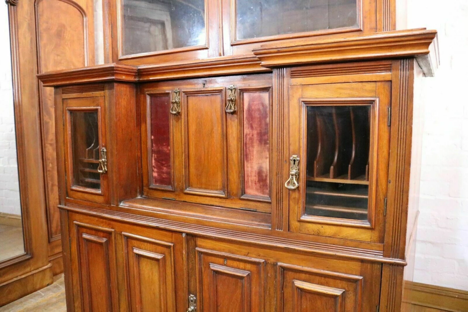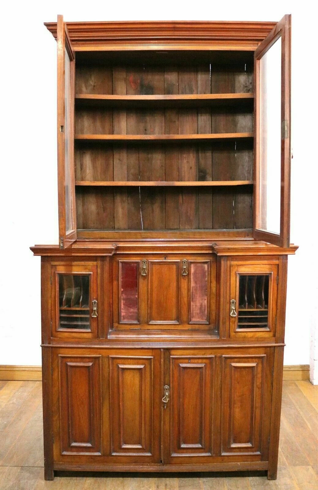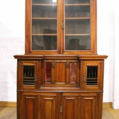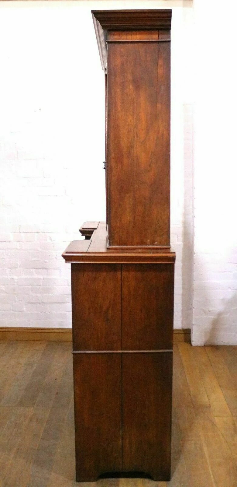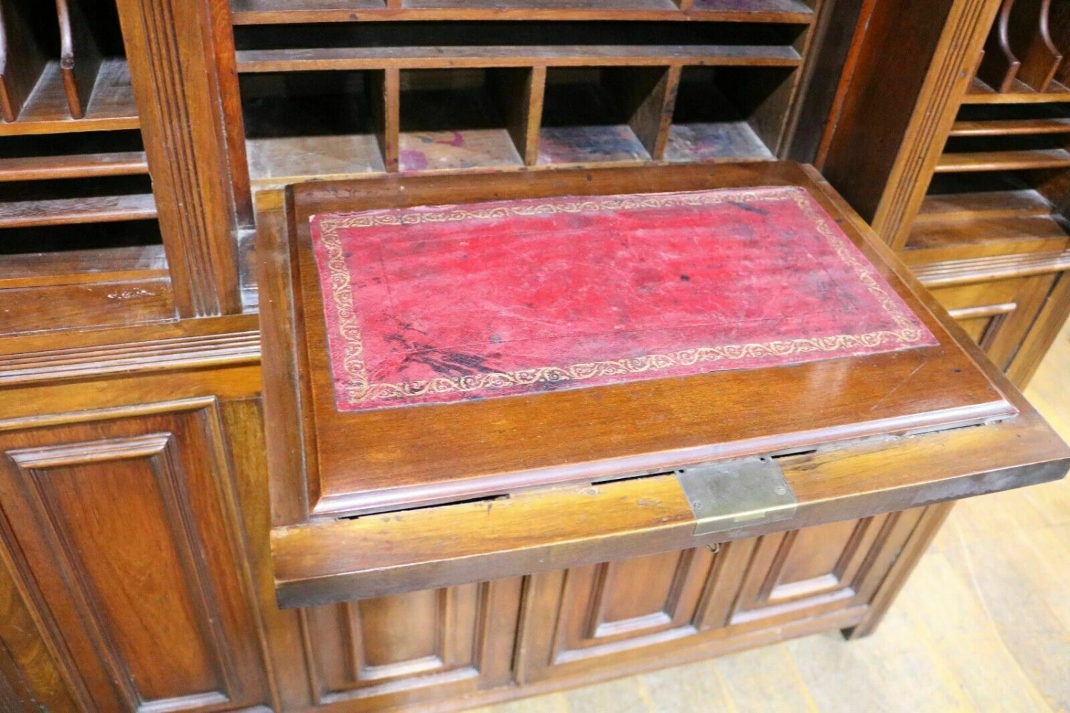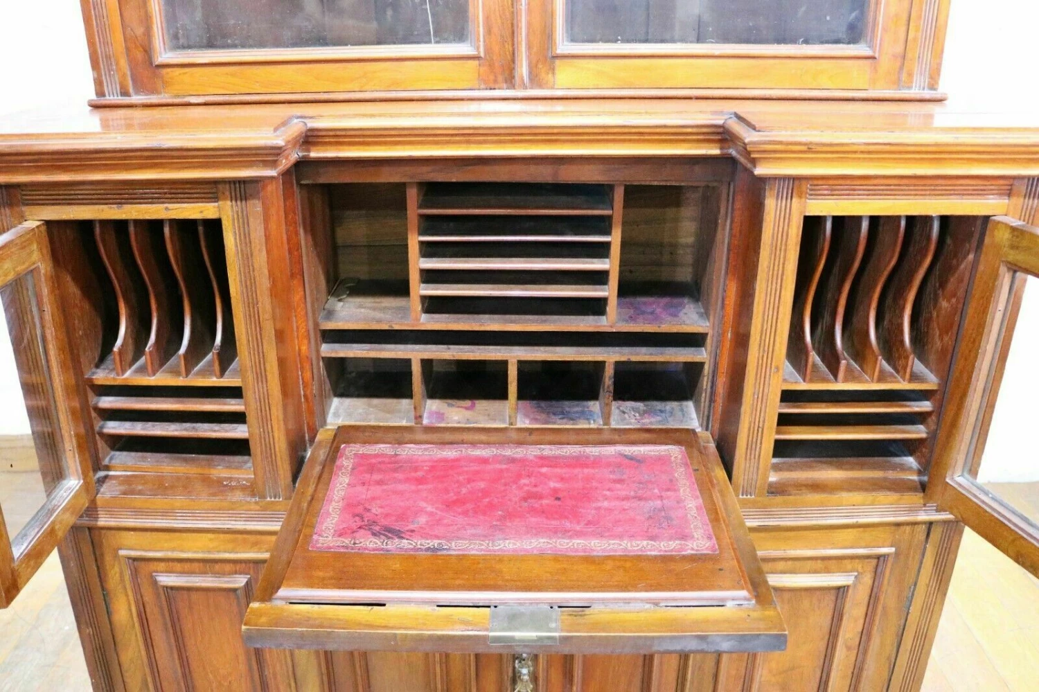 Doors open to reveal adjustable height shelving to the top, a shelved cupboard space below and cupboards either side of the bureau.