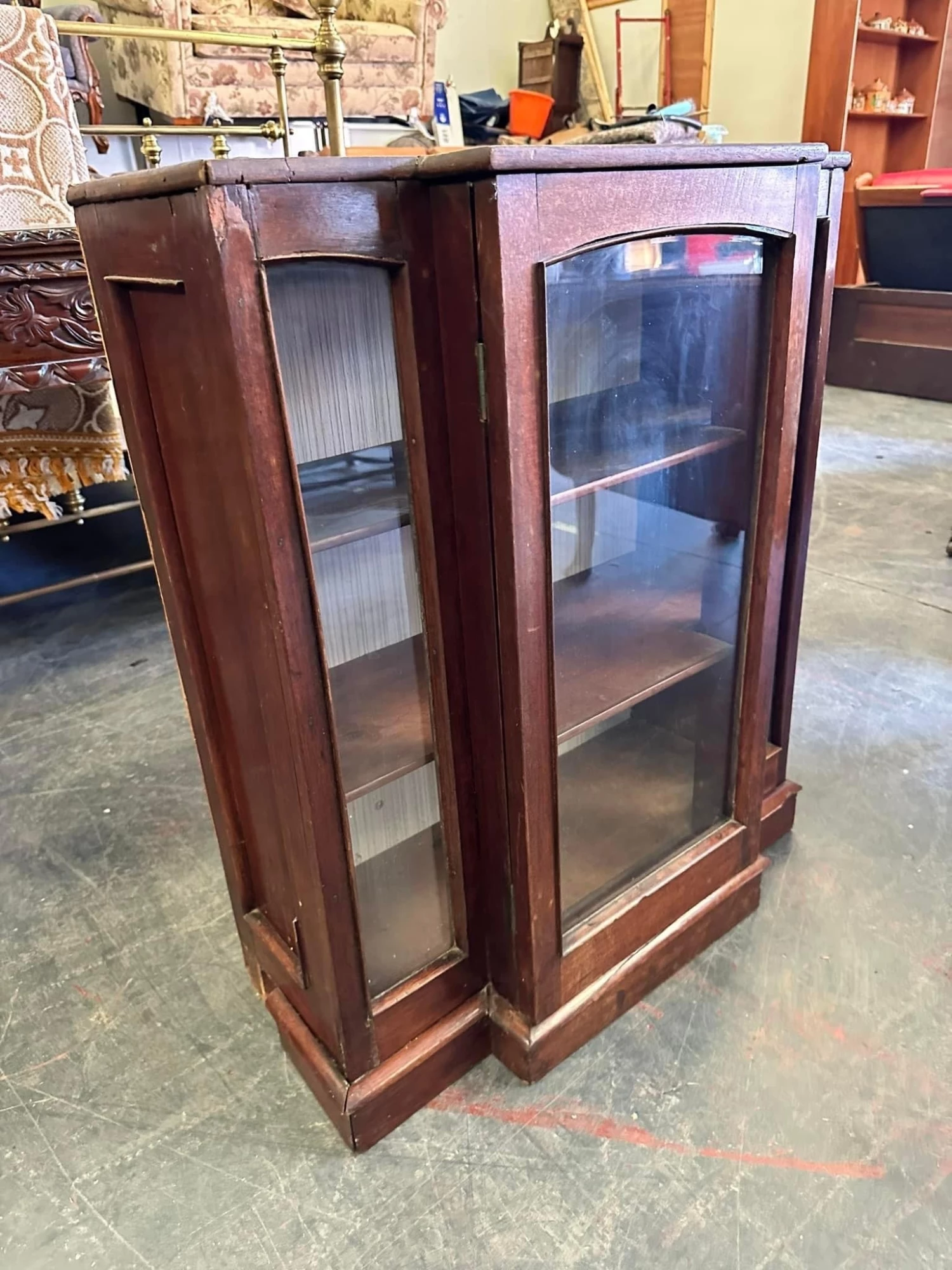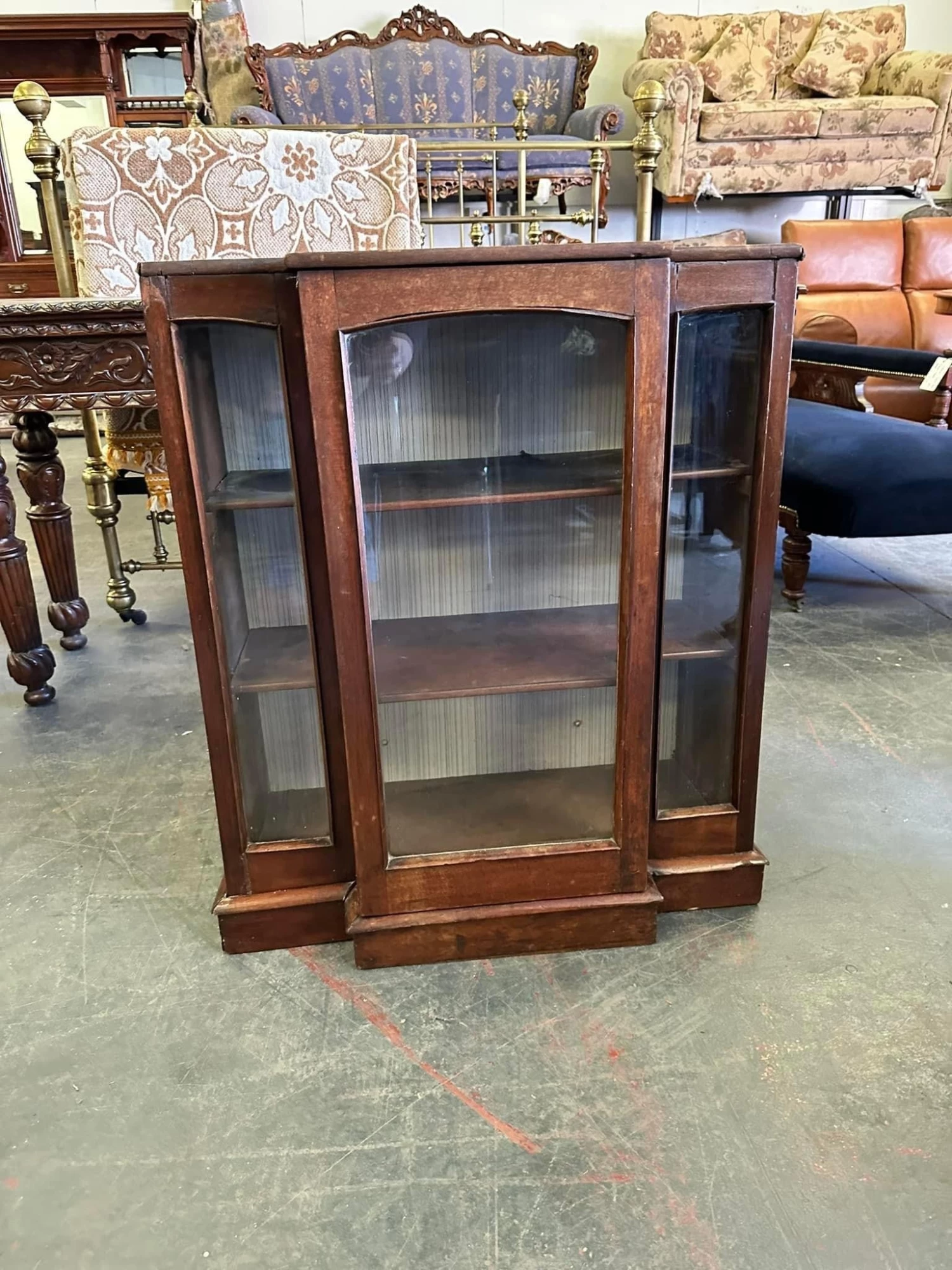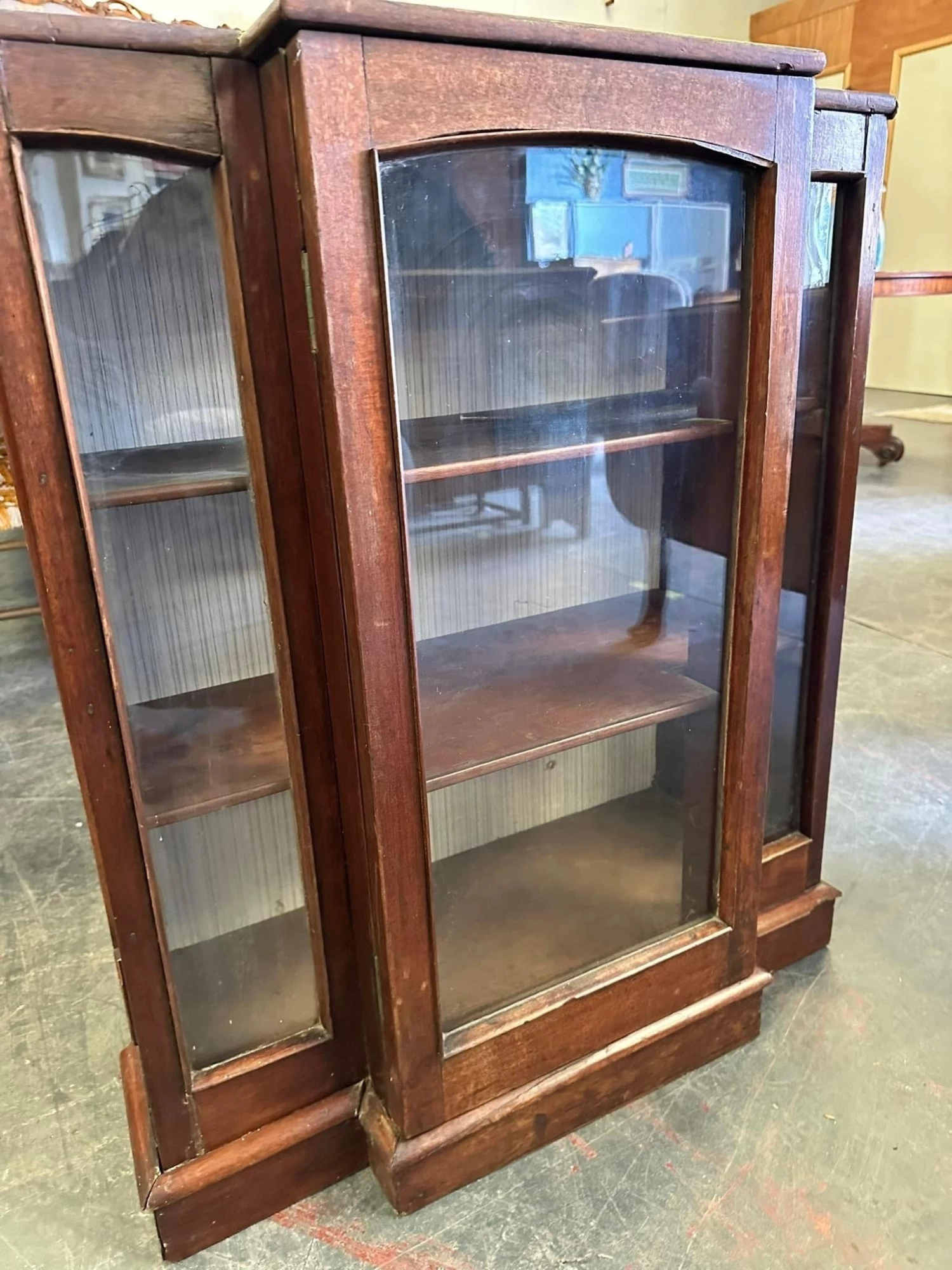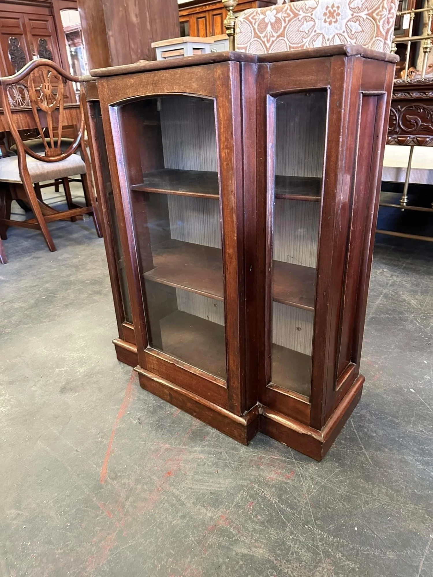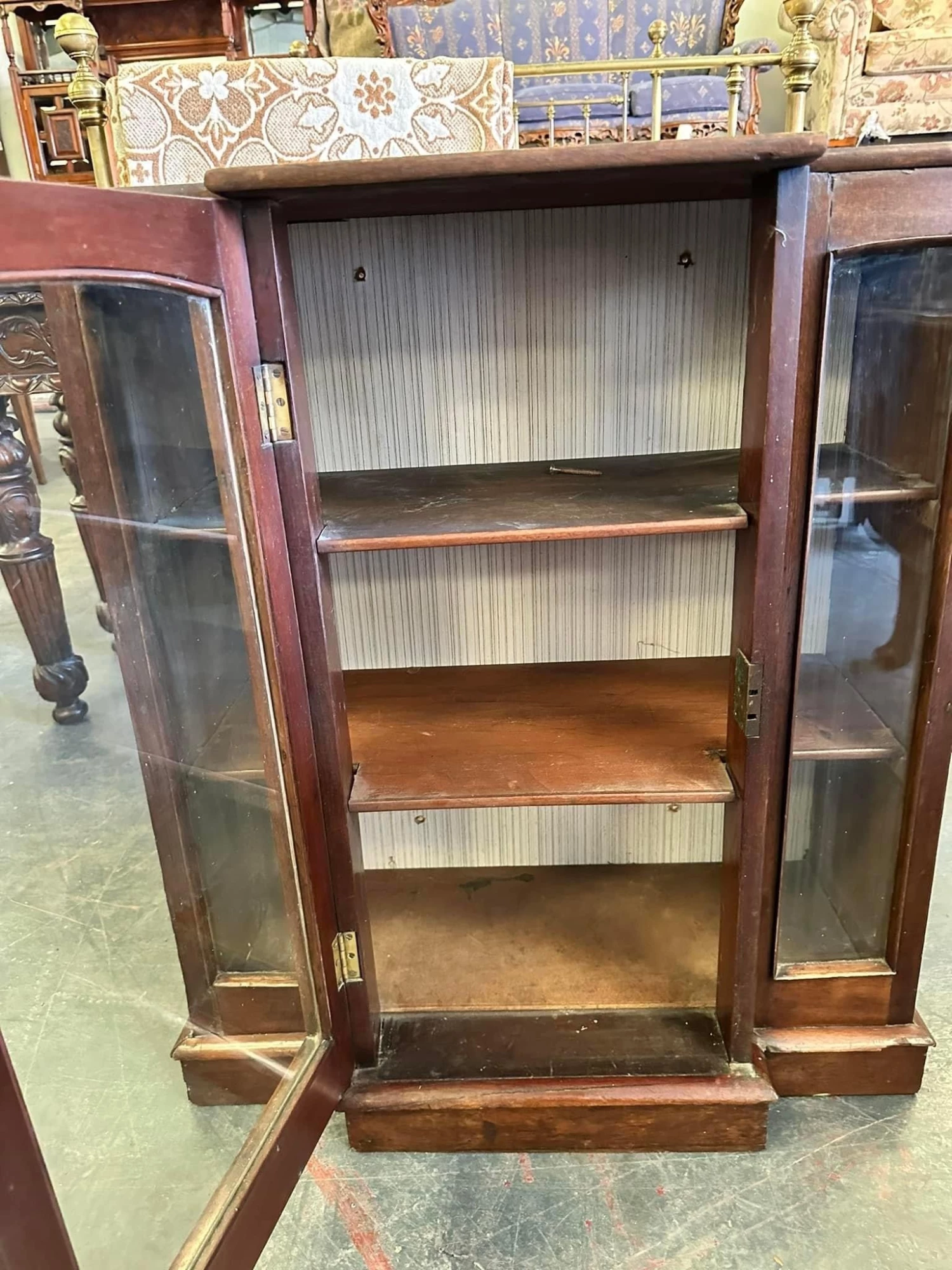 Antique mahogany breakfront glazed wall cupboard / display cabinet, having two fitted internal shelves and a central glazed door.