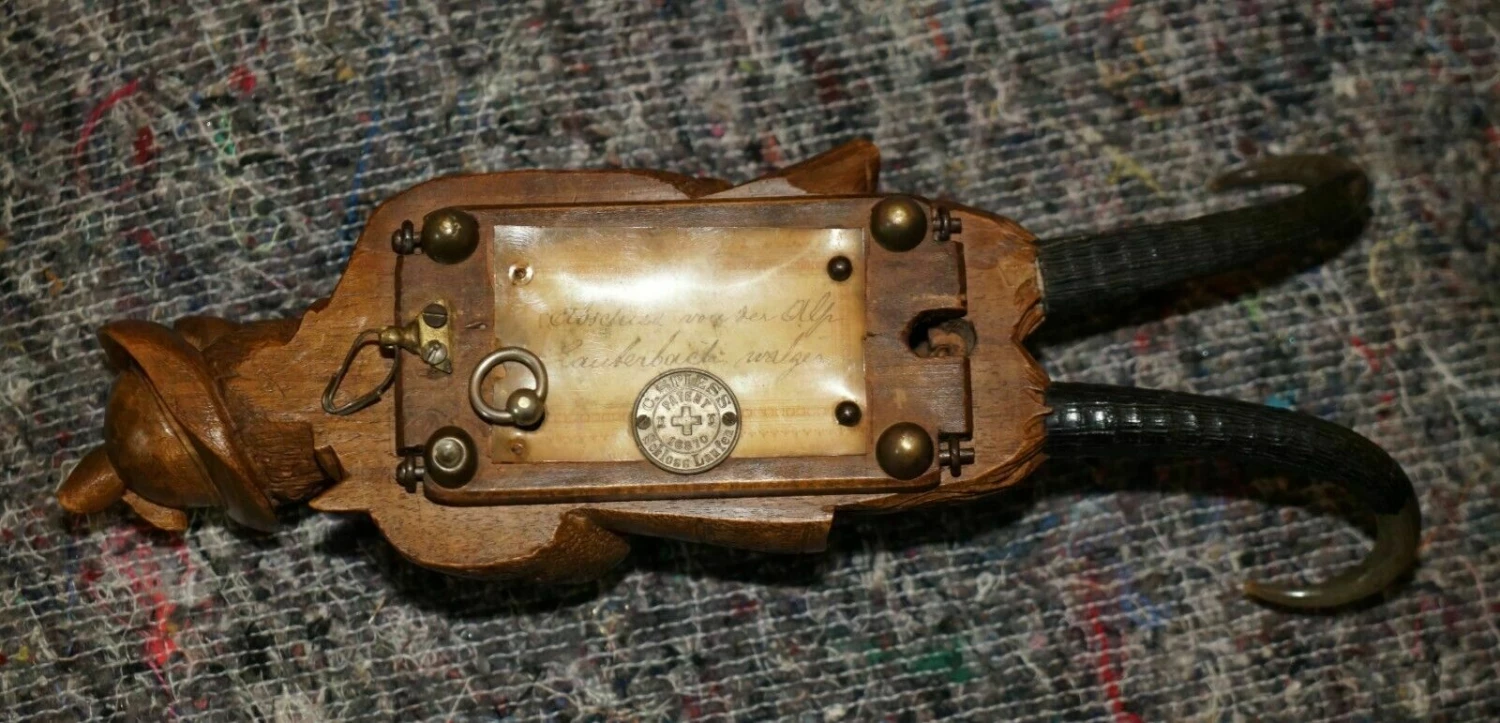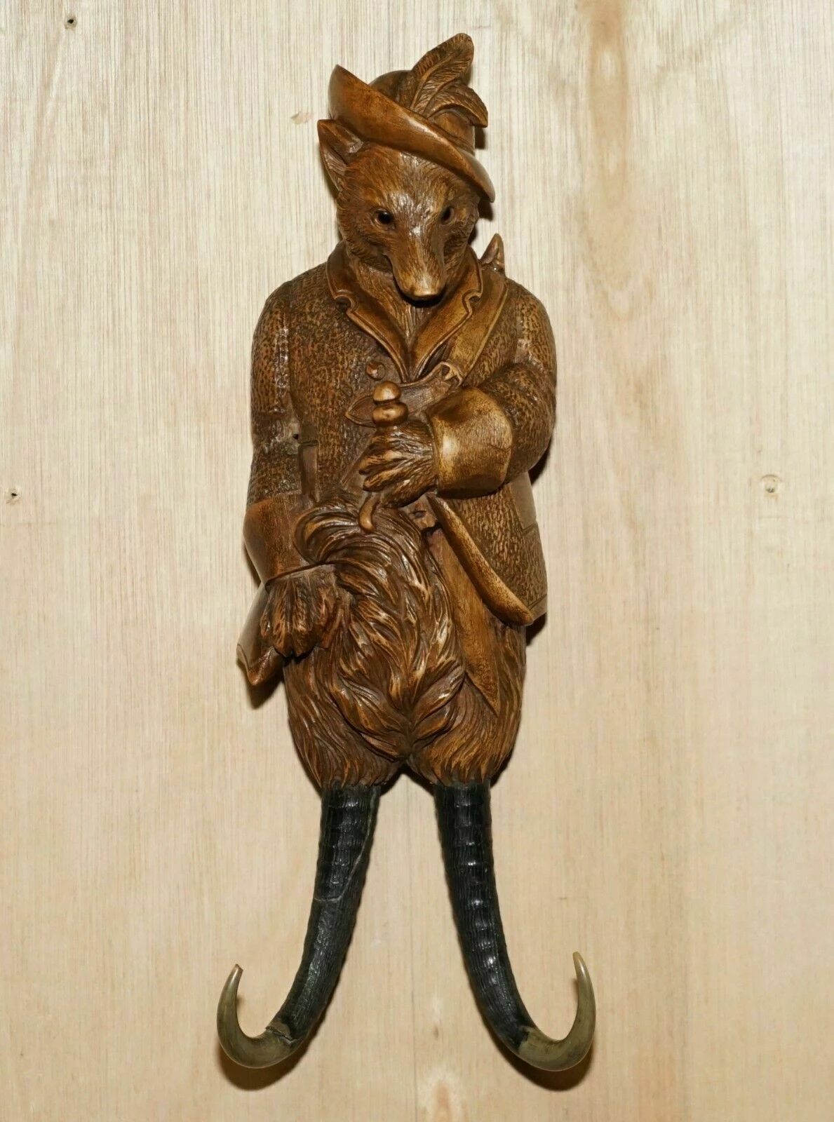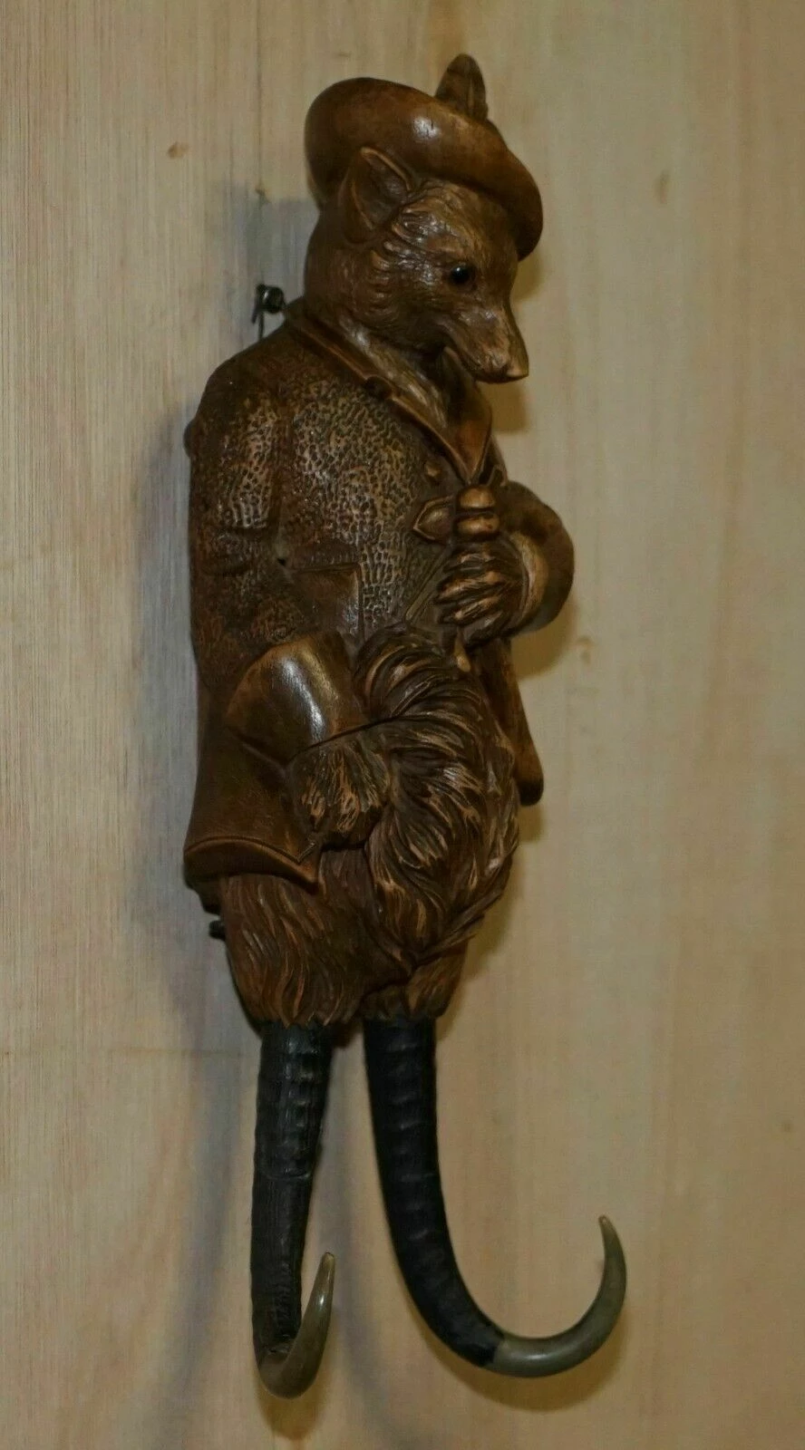 Royal House Antiques is delighted to offer for sale this exceptionally rare, Musical, original circa 1880 Swiss made Black Forest wood, Fox whip hook with glass eyes
