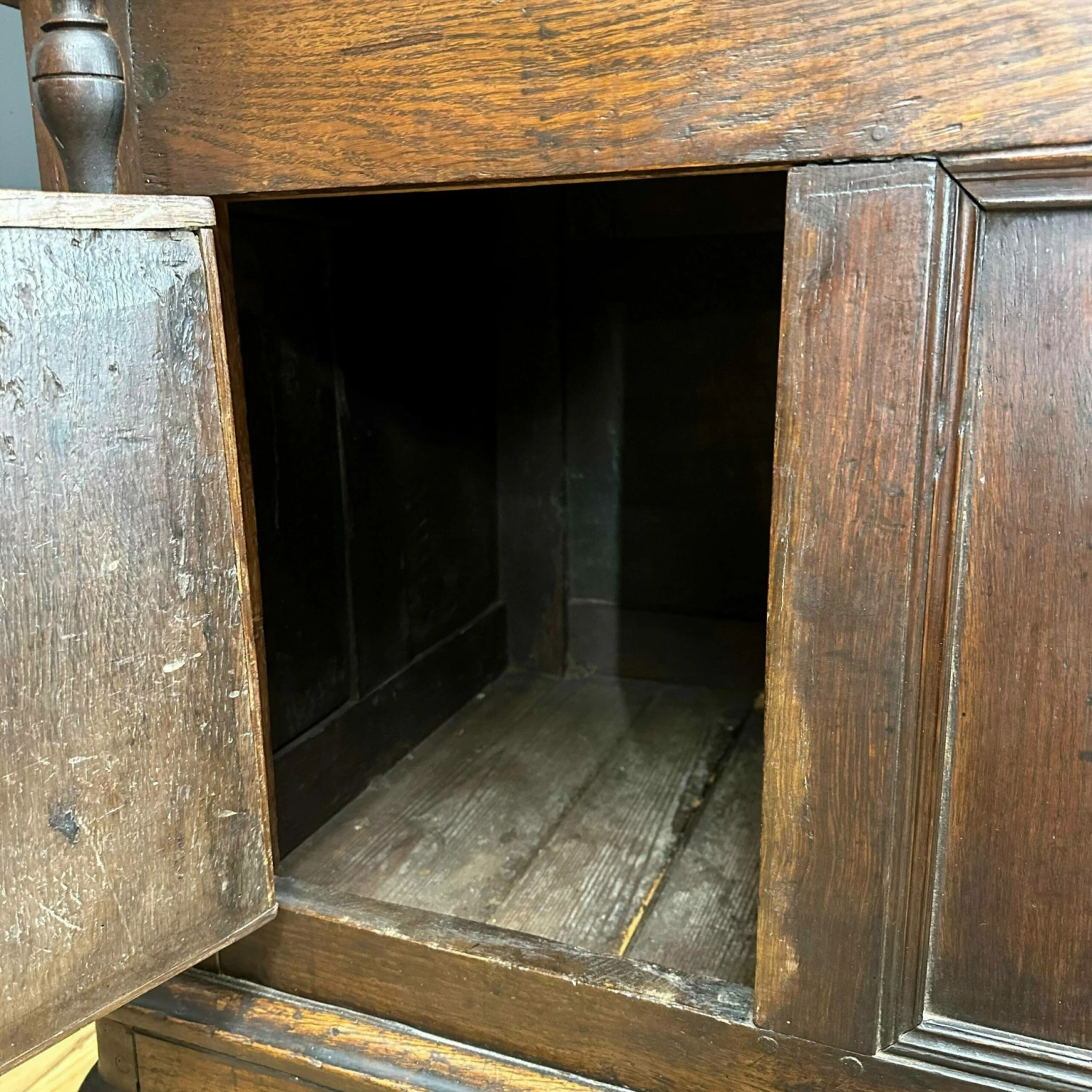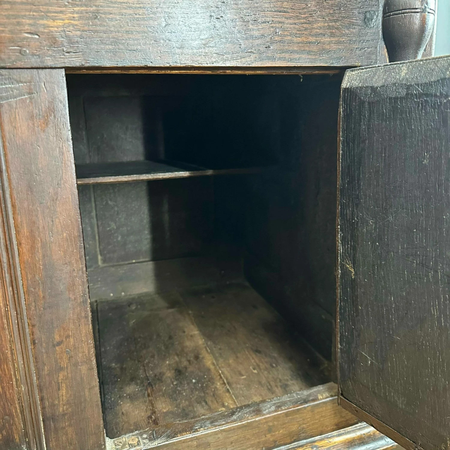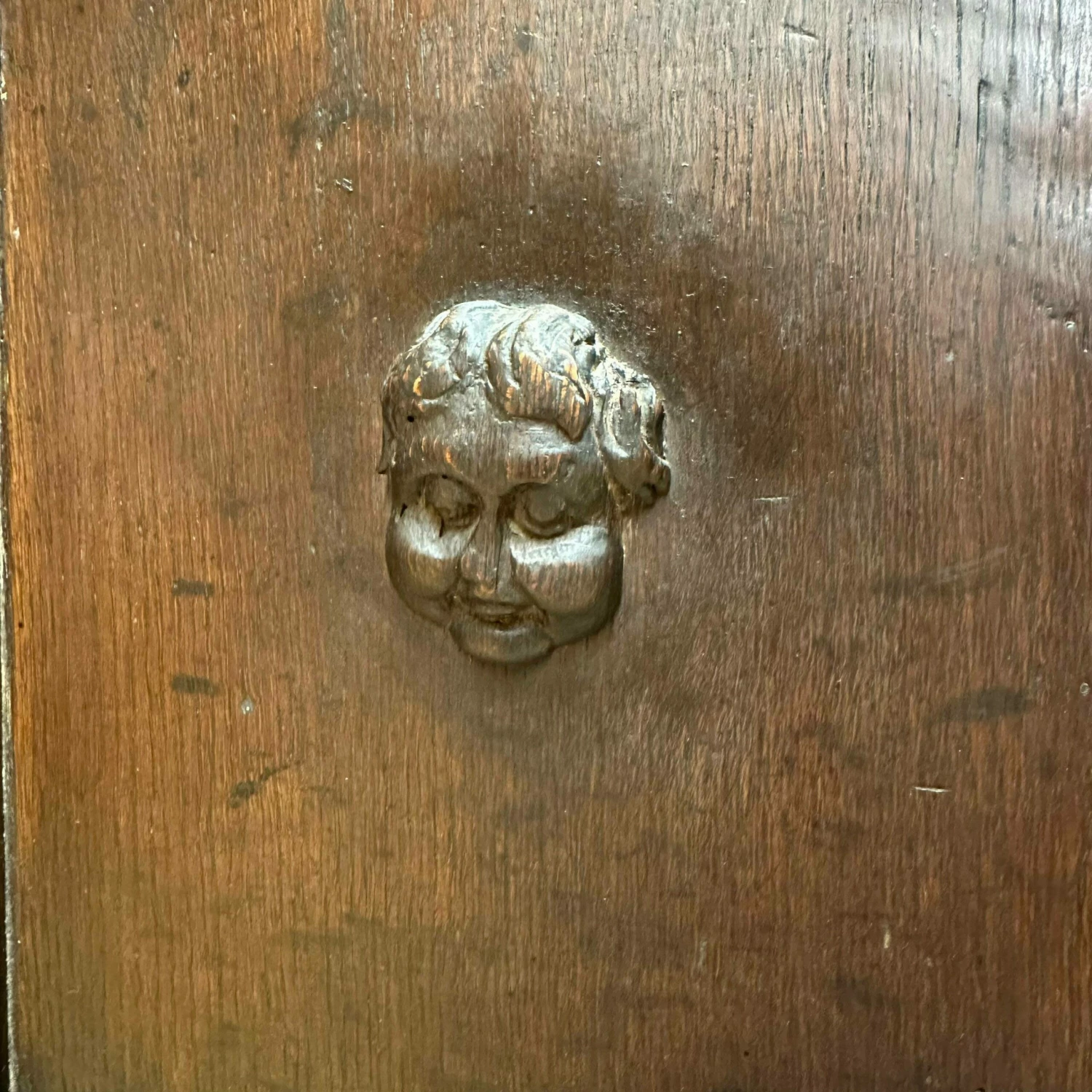 Made from oak. The top comes off for ease of delivery. A shelved top section with a double cupboard to the base. With original hand forged iron hardware and the sweetest carved cherub face to the base cupboard front.
