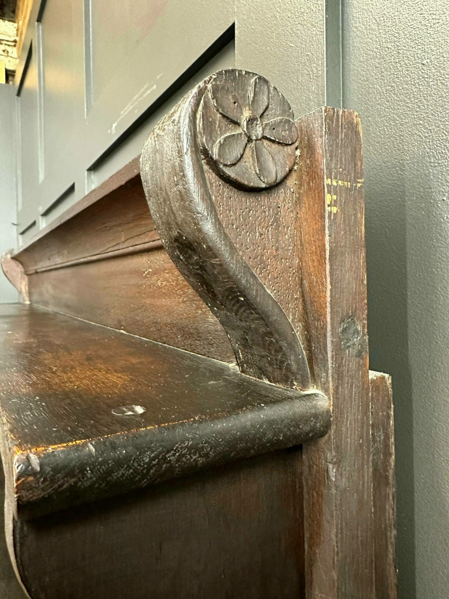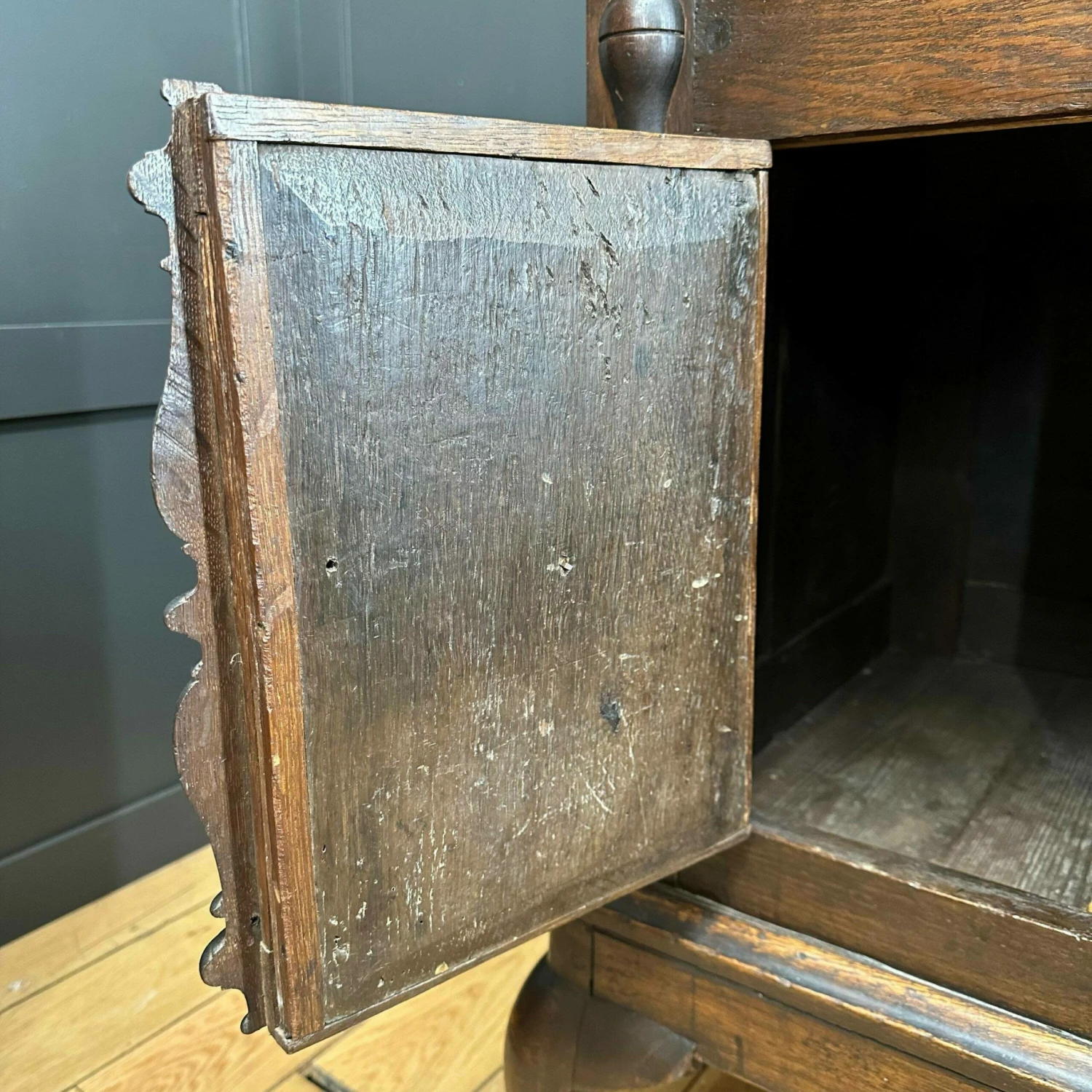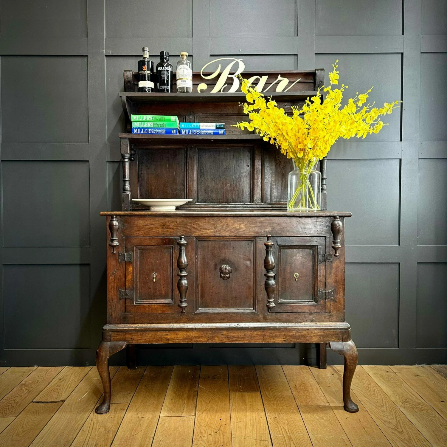 Made from oak. The top comes off for ease of delivery. A shelved top section with a double cupboard to the base. With original hand forged iron hardware and the sweetest carved cherub face to the base cupboard front.