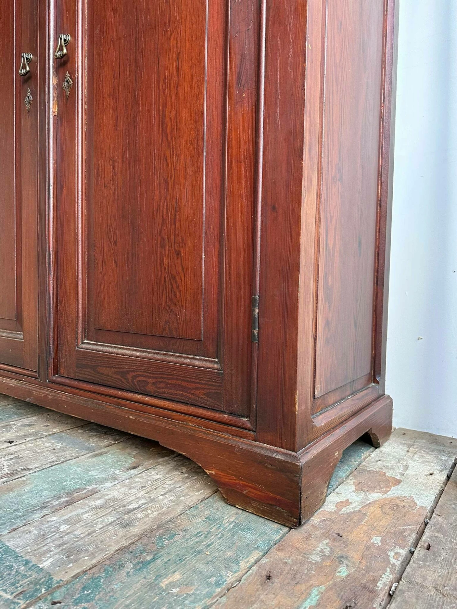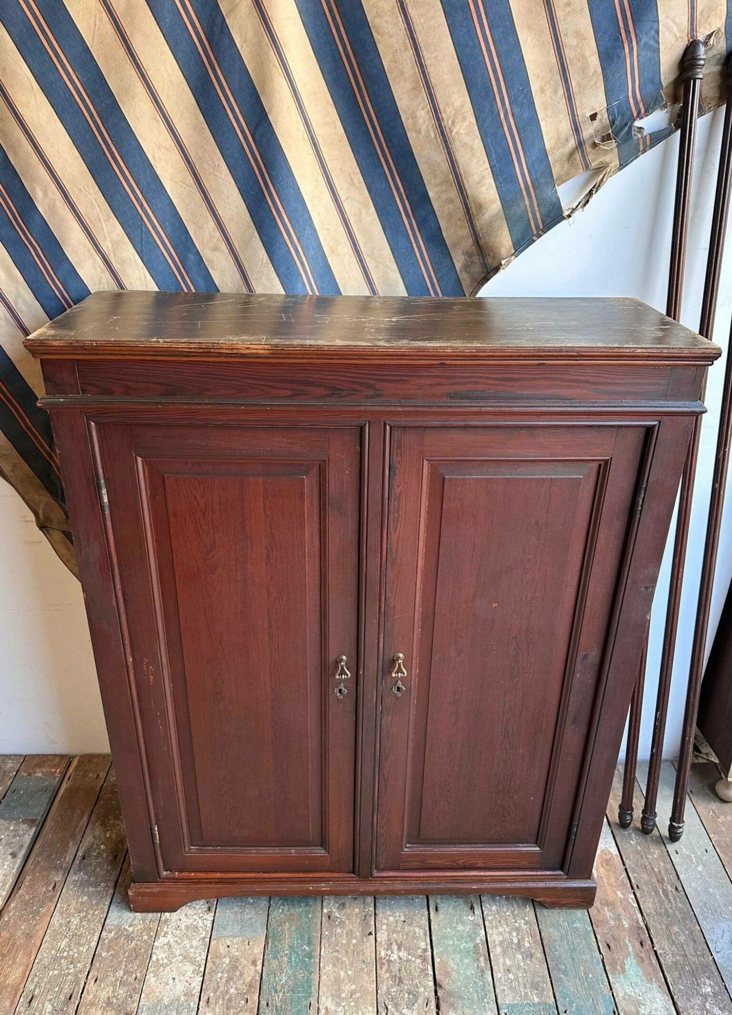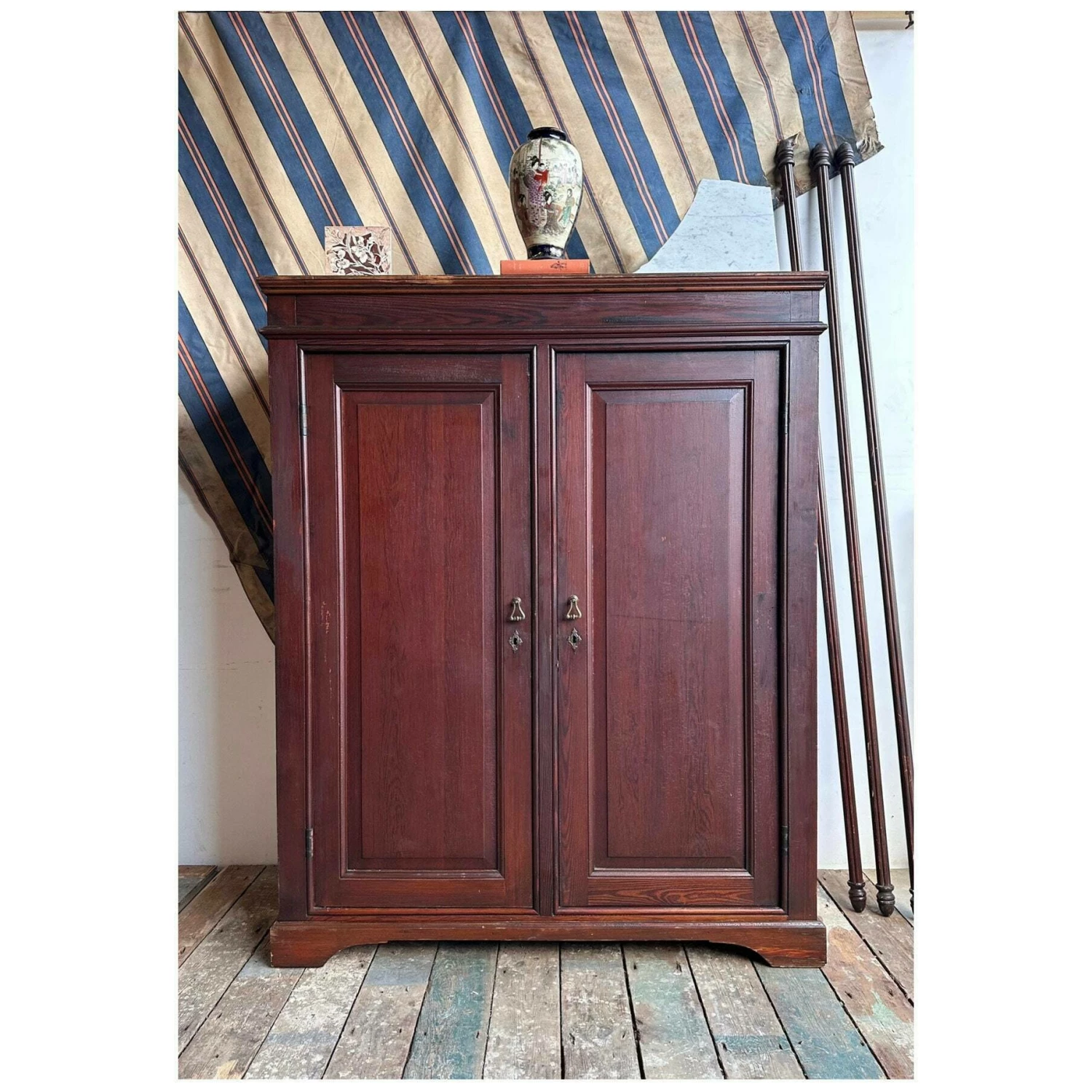 Pitch pine, two-door cupboard with slim proportions but a very heavy solid construction.