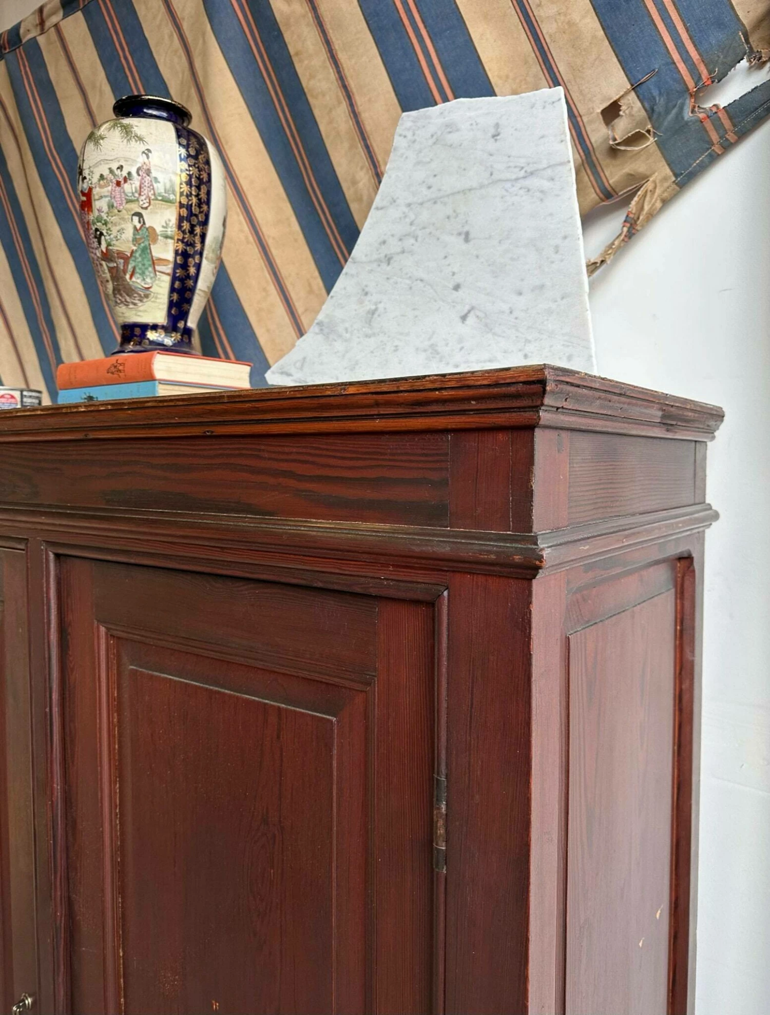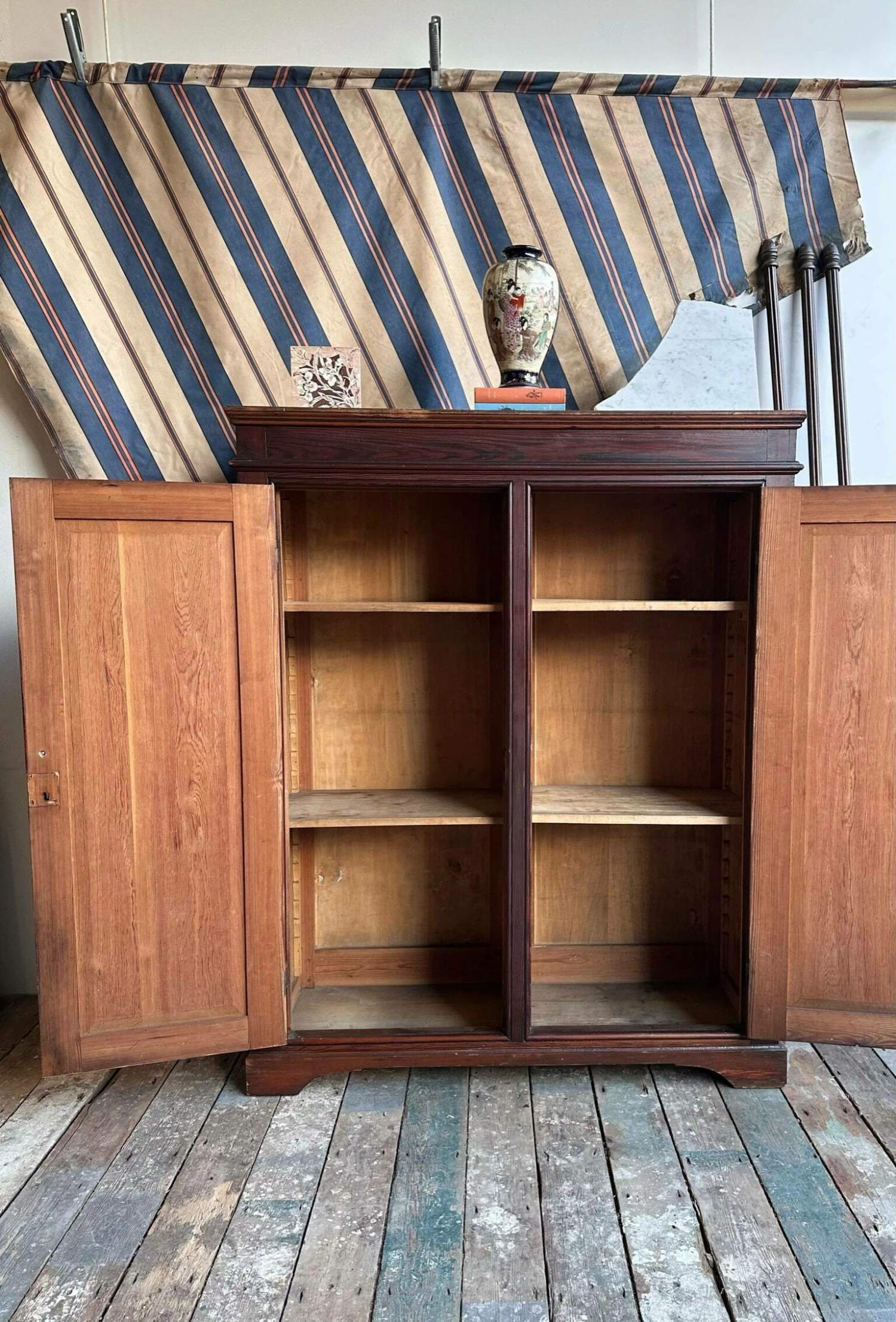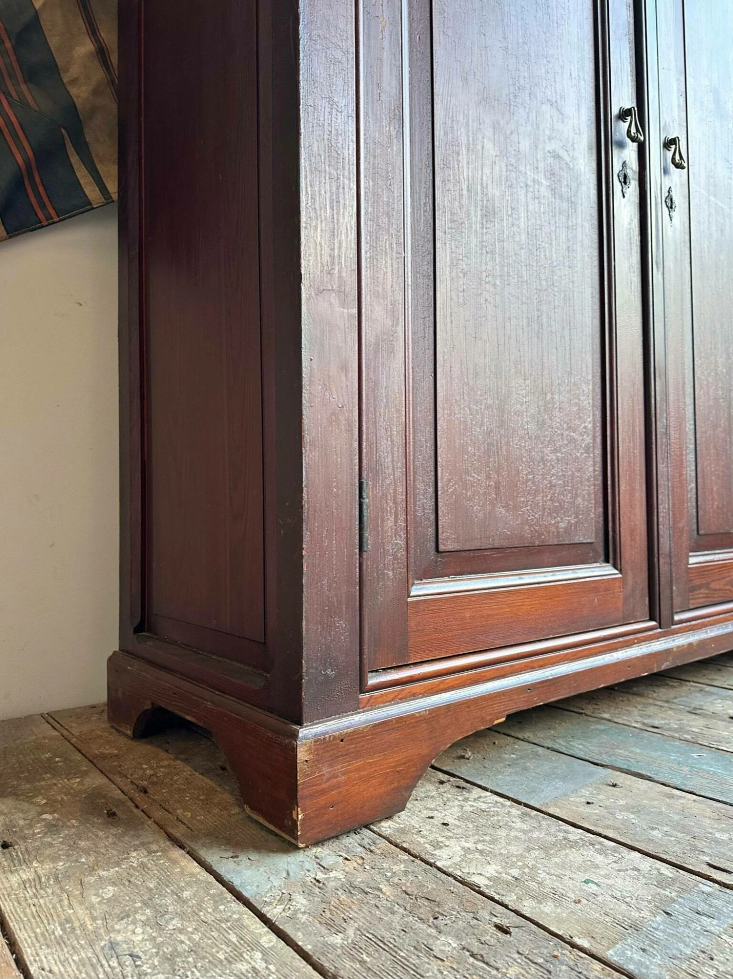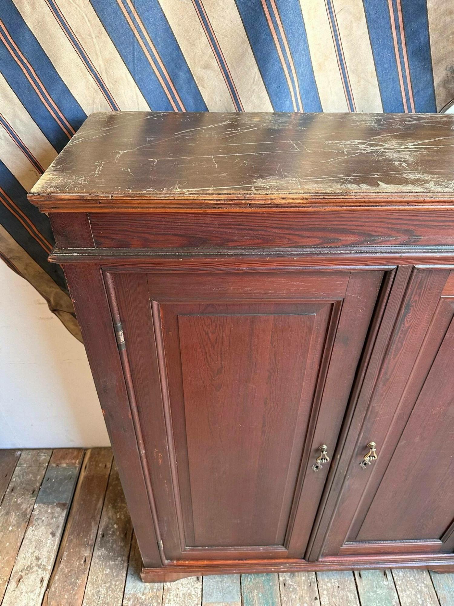 Pitch pine, two-door cupboard with slim proportions but a very heavy solid construction.
