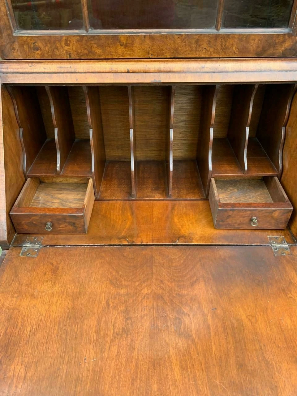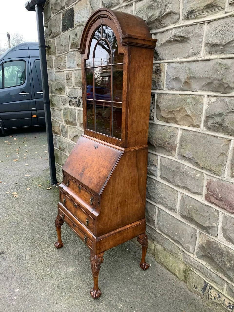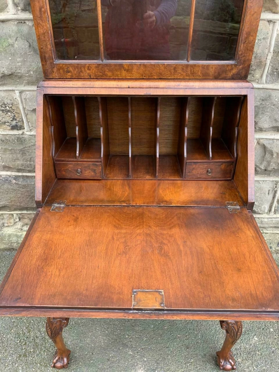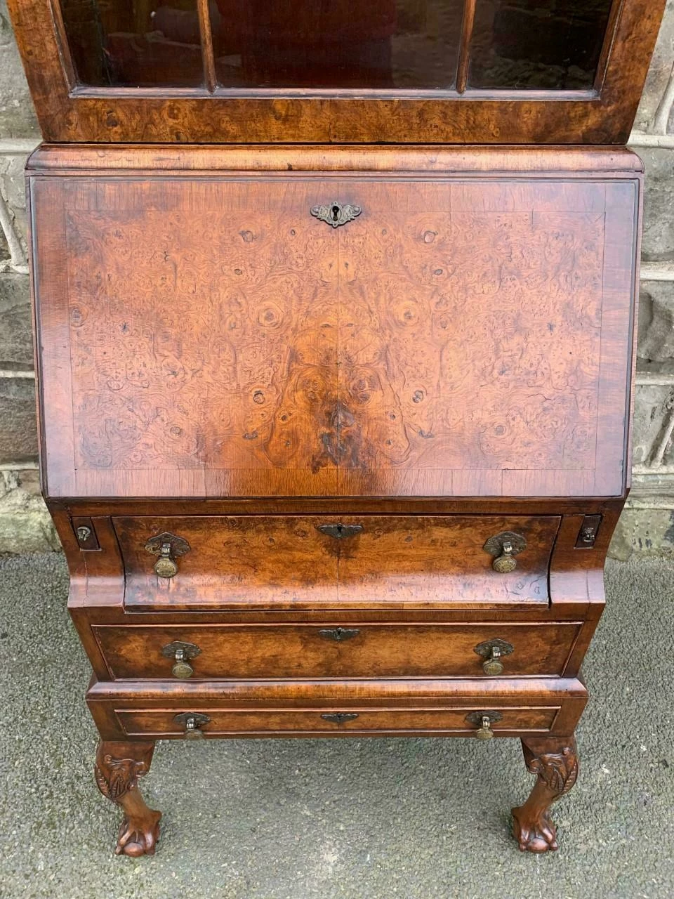 Offered for sale is this quality slim burr walnut bureaux bookcase of good slim proportions. In burr walnut walnut. Made in 2 parts. The bookcase having a domed top, glazed doors with 2 height adjustable shelves. Lock and key. The bureaux having fall front, inside pigeon holes & 2 drawers. It has pull out loafers to support the fall front, 3 graduated long draws with brass drop handles standing on slender well carved cabriole legs. It has a key to lock all the drawers, bookcase doors & bureau front.