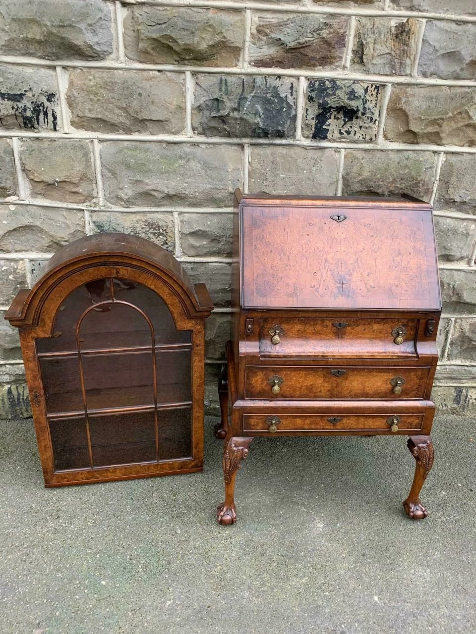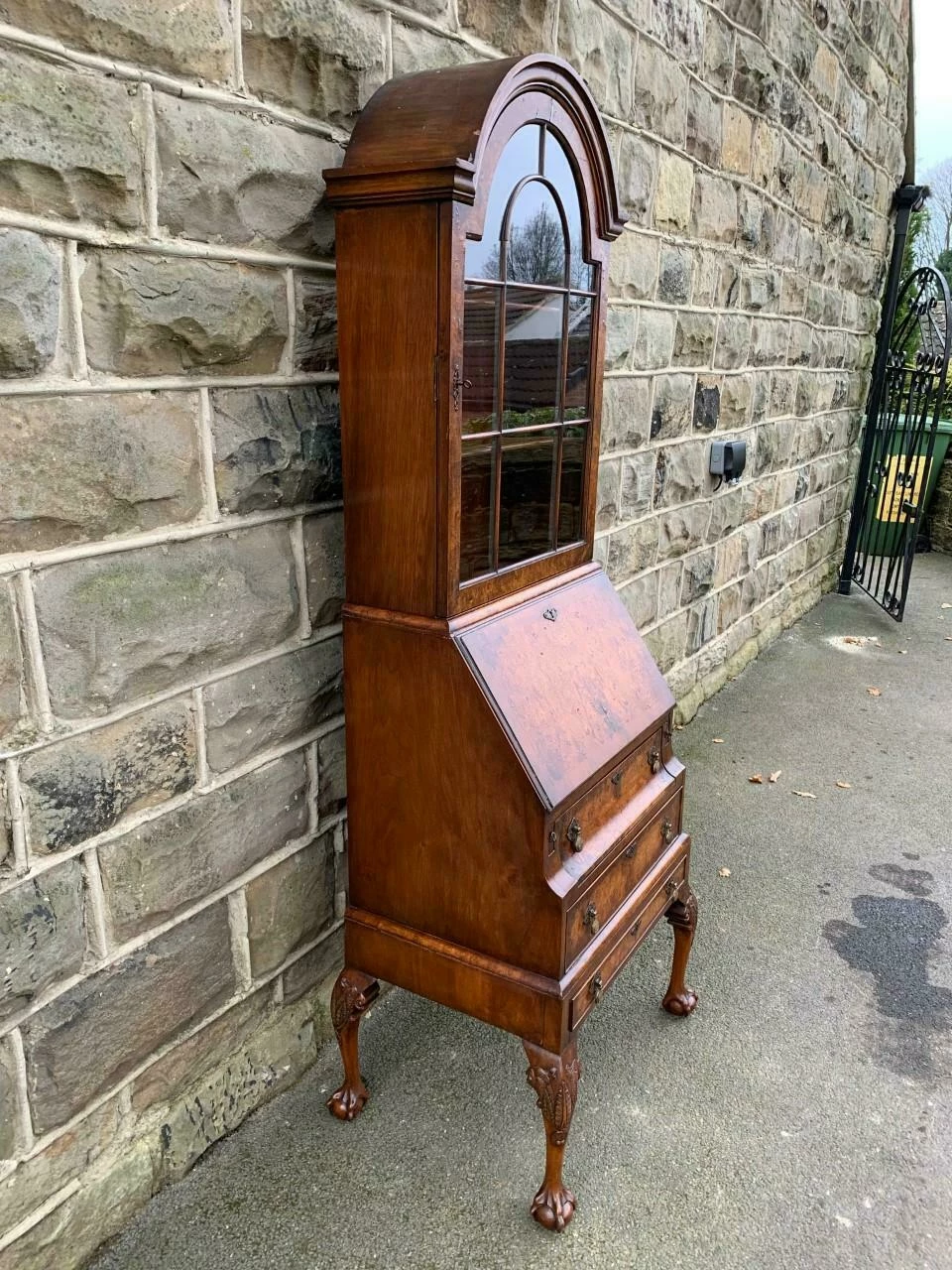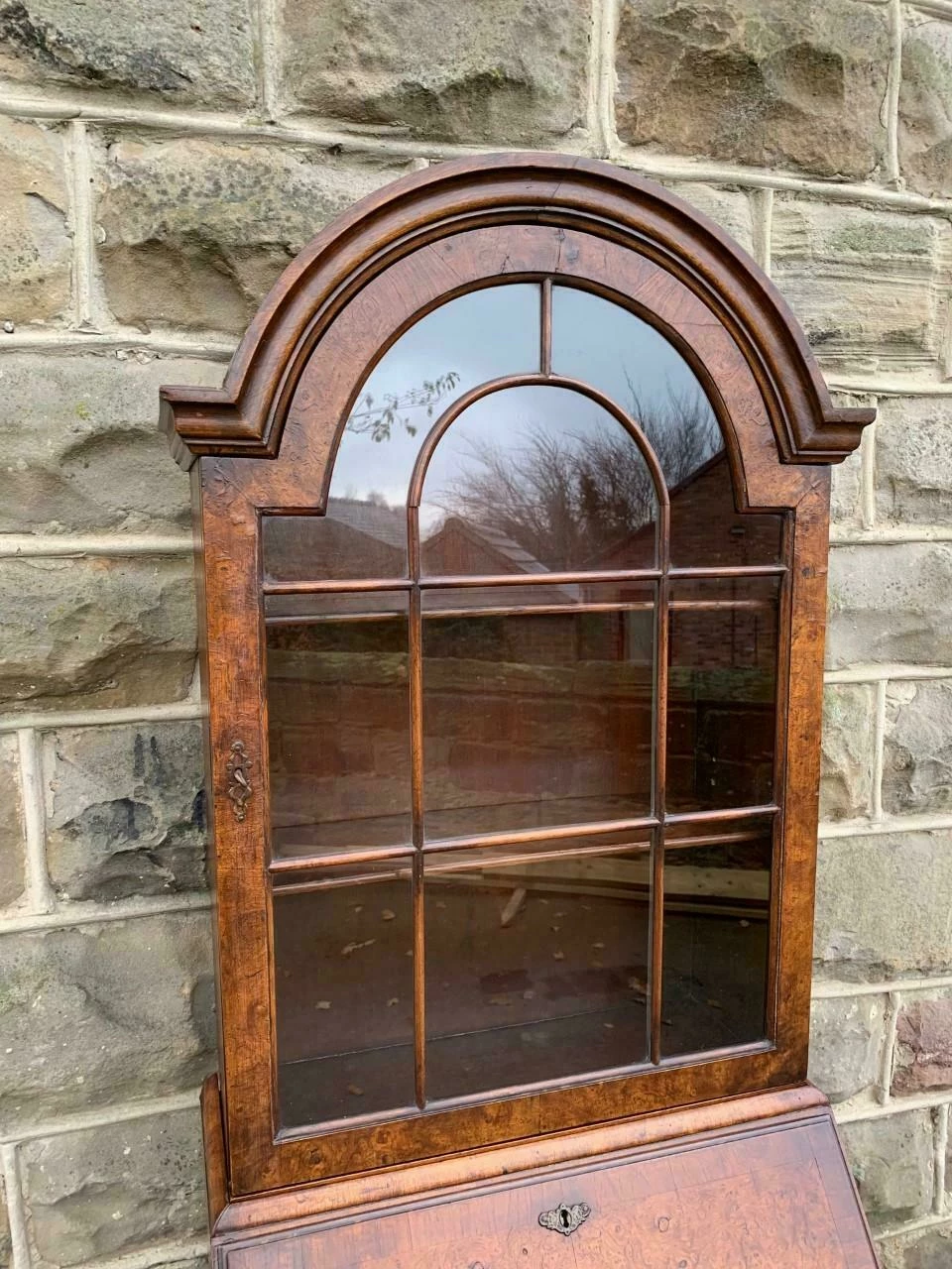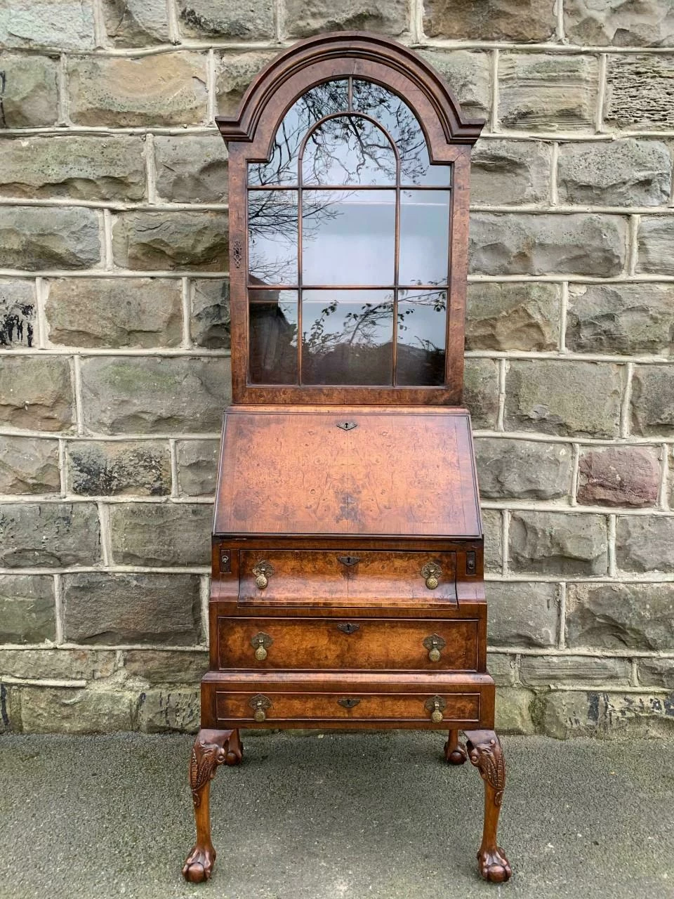 Offered for sale is this quality slim burr walnut bureaux bookcase of good slim proportions. In burr walnut walnut. Made in 2 parts. The bookcase having a domed top, glazed doors with 2 height adjustable shelves. Lock and key. The bureaux having fall front, inside pigeon holes & 2 drawers. It has pull out loafers to support the fall front, 3 graduated long draws with brass drop handles standing on slender well carved cabriole legs. It has a key to lock all the drawers, bookcase doors & bureau front.