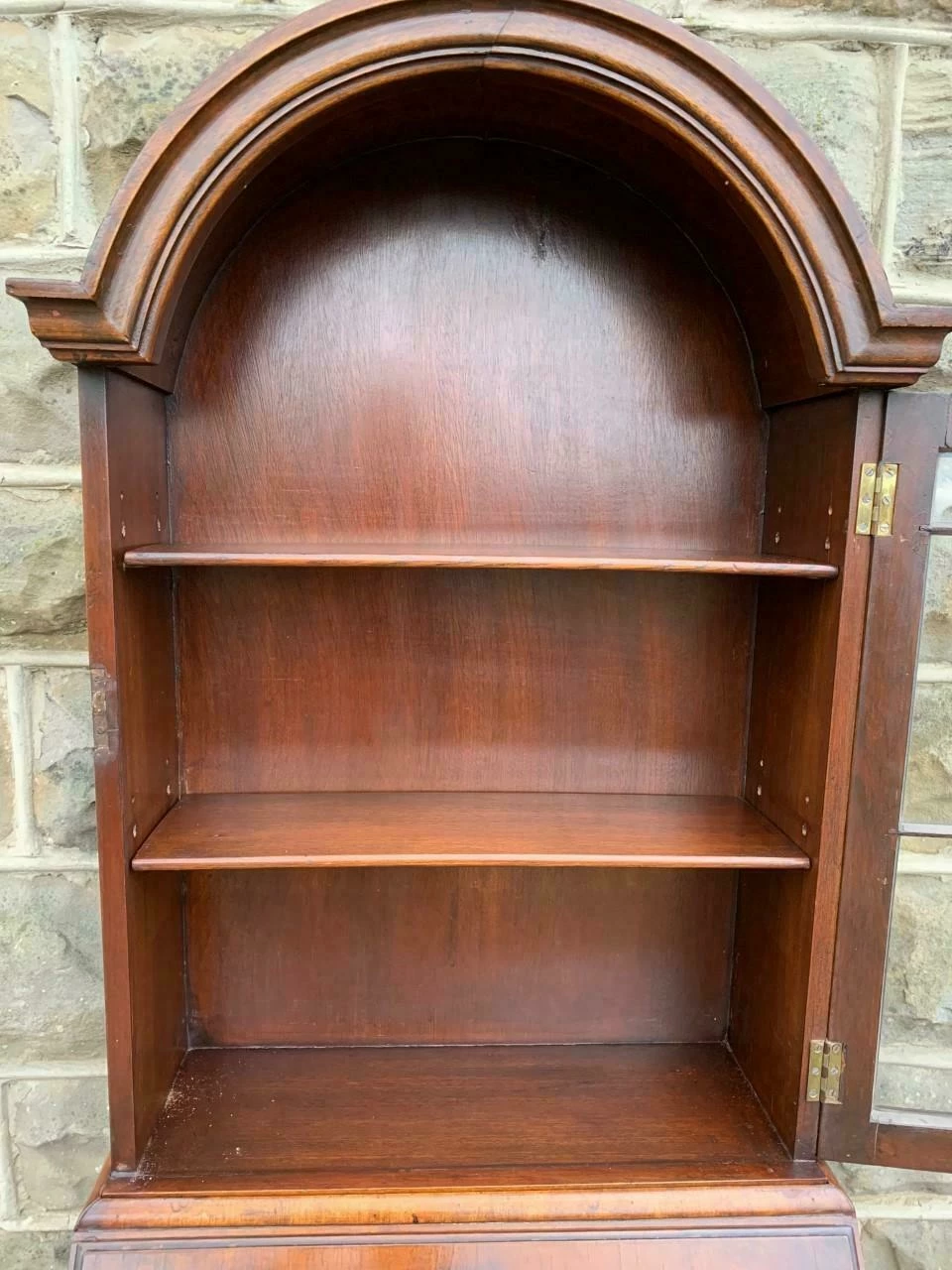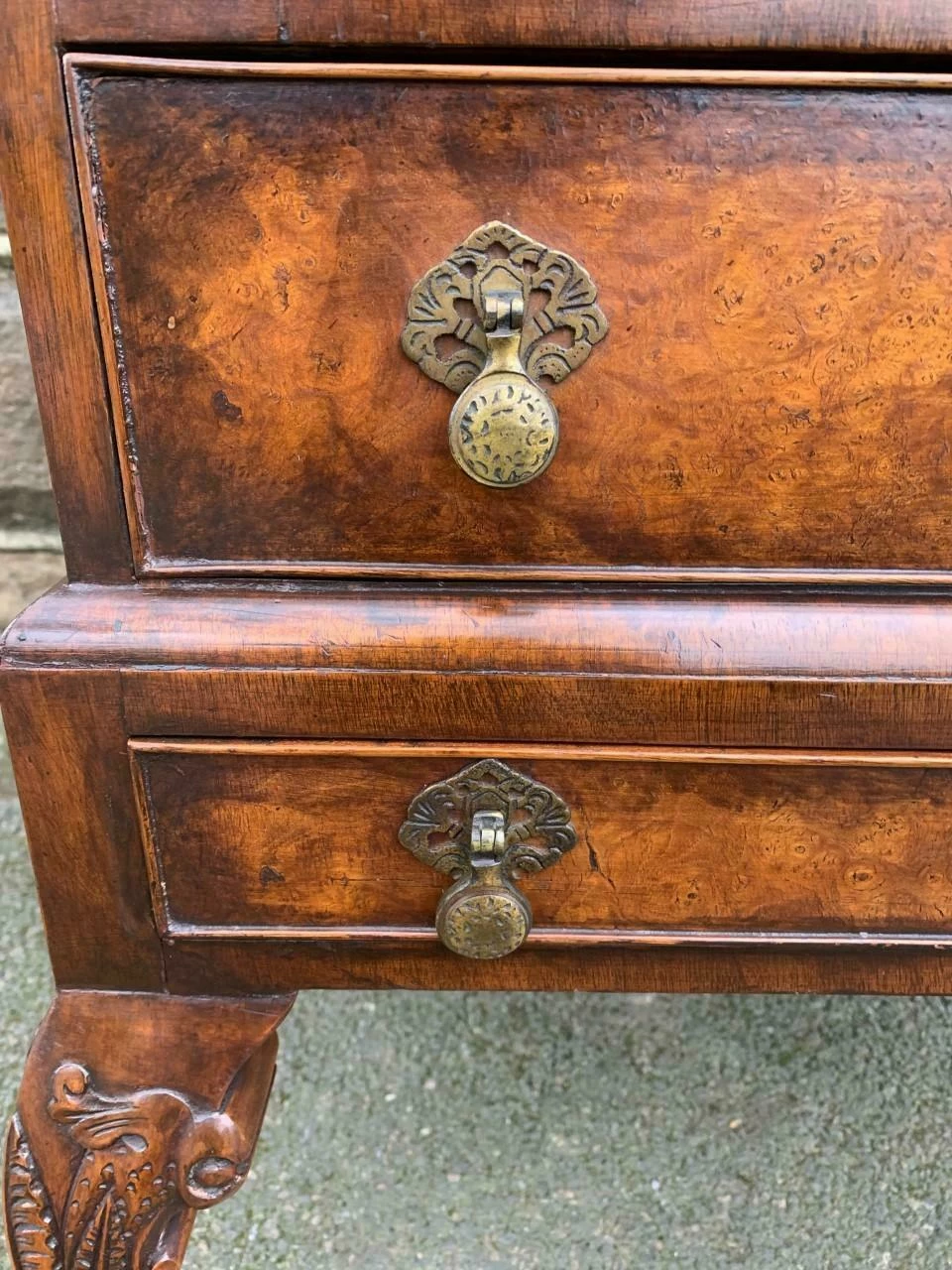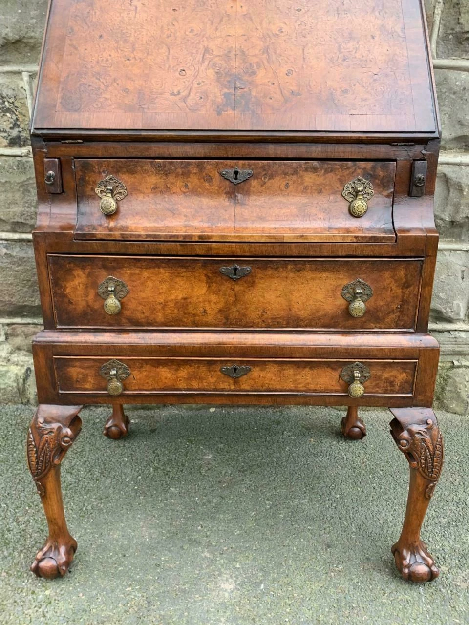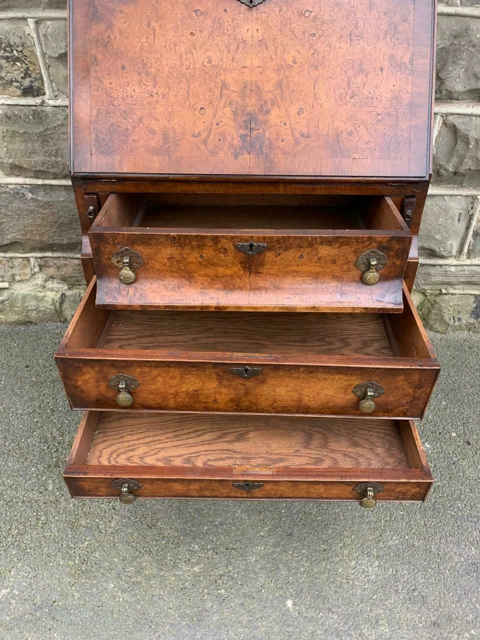 Offered for sale is this quality slim burr walnut bureaux bookcase of good slim proportions. In burr walnut walnut. Made in 2 parts. The bookcase having a domed top, glazed doors with 2 height adjustable shelves. Lock and key. The bureaux having fall front, inside pigeon holes & 2 drawers. It has pull out loafers to support the fall front, 3 graduated long draws with brass drop handles standing on slender well carved cabriole legs. It has a key to lock all the drawers, bookcase doors & bureau front.