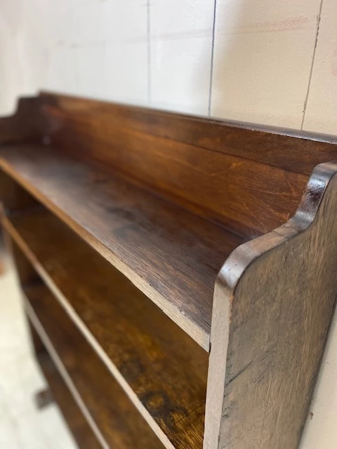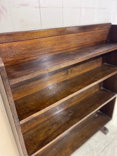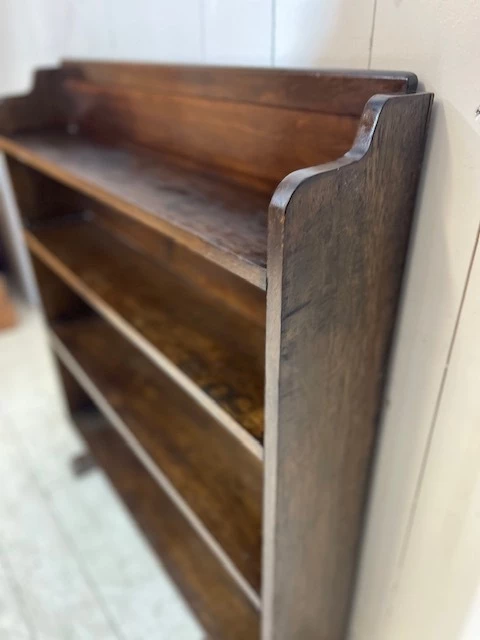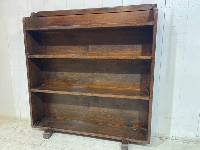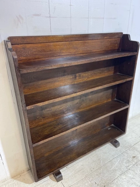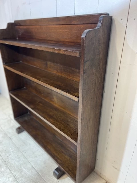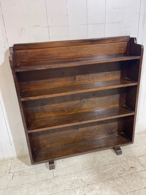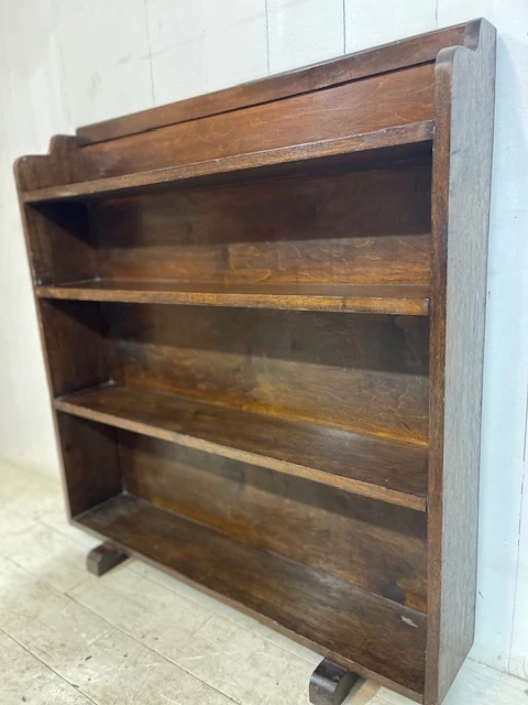 A lovely simple piece originally used for storing books and paperwork in a church office. Finished in solid oak the piece has a slightly distressed look and an aged patina. The design is typically art deco with a shaped and curved top and classic art deco feet. This particular bookcase is most useful due to its graduated shelf size, allowing for various book sizes to be stored. Finished in a dark varnish this is a great practical addition to any room.