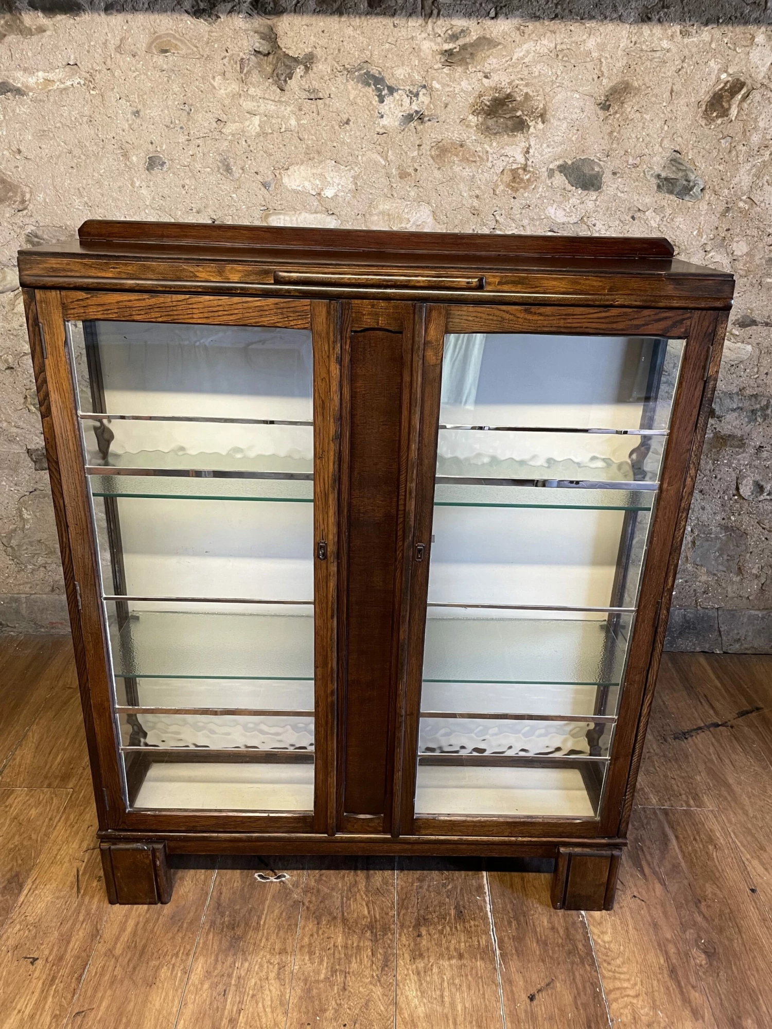 A vintage original art deco oak bookcase with key. It has glazed doors and sides with 2 glass shelves