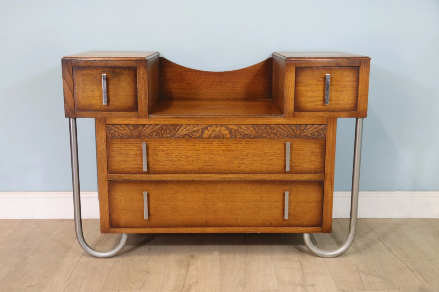 Art Deco Style! A wonderful & really rare Oak and chrome framed drop centre storage unit with floral carved decoration. This useful & stylish chest has two large and to small drawers fitted with chrome finish handles. This is a very unusual design of chest that is seldom seen for sale. Please see the matching side cabinet and other vintage furniture that we have for sale.