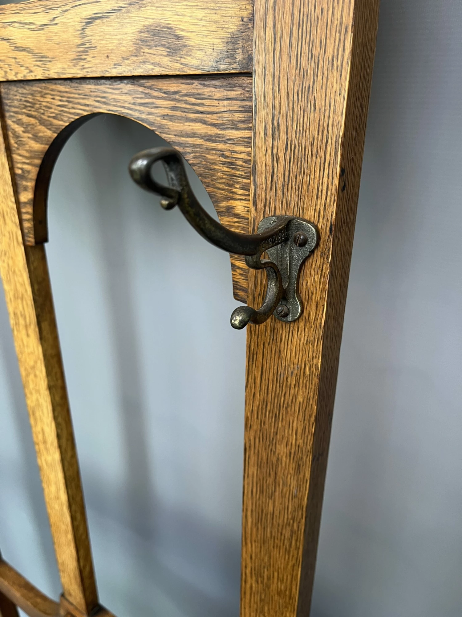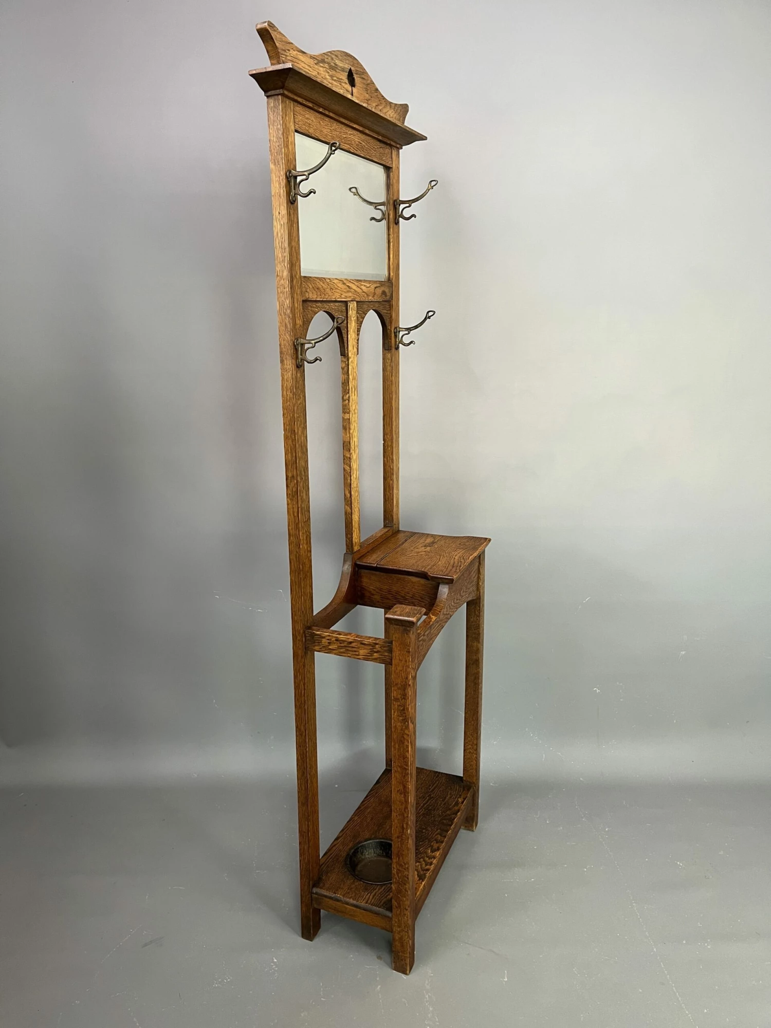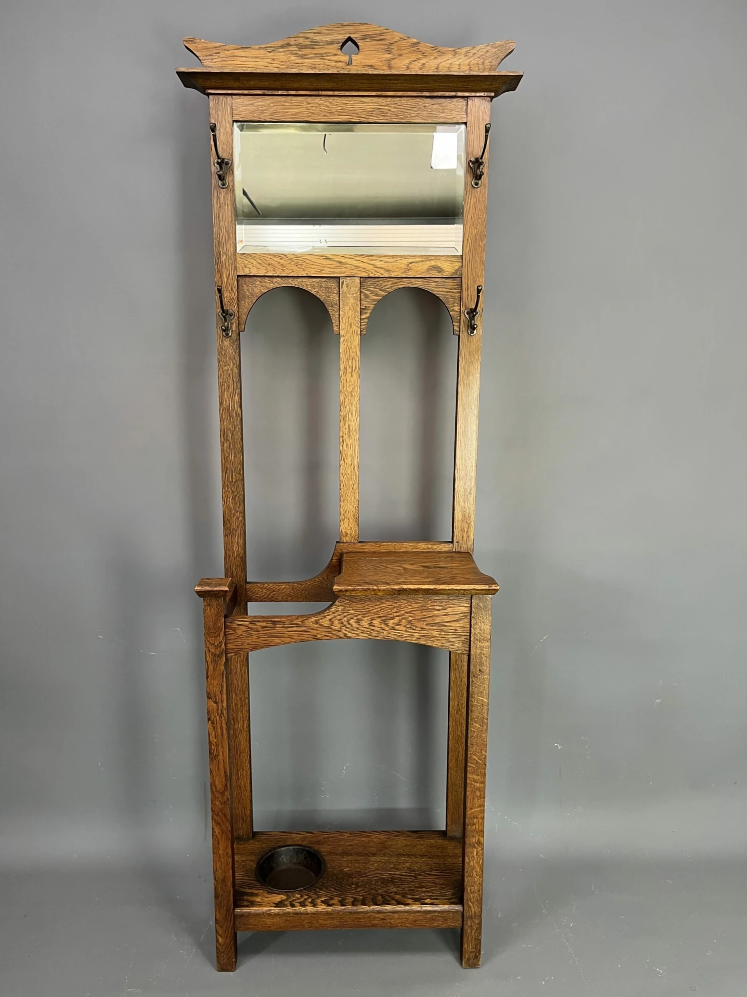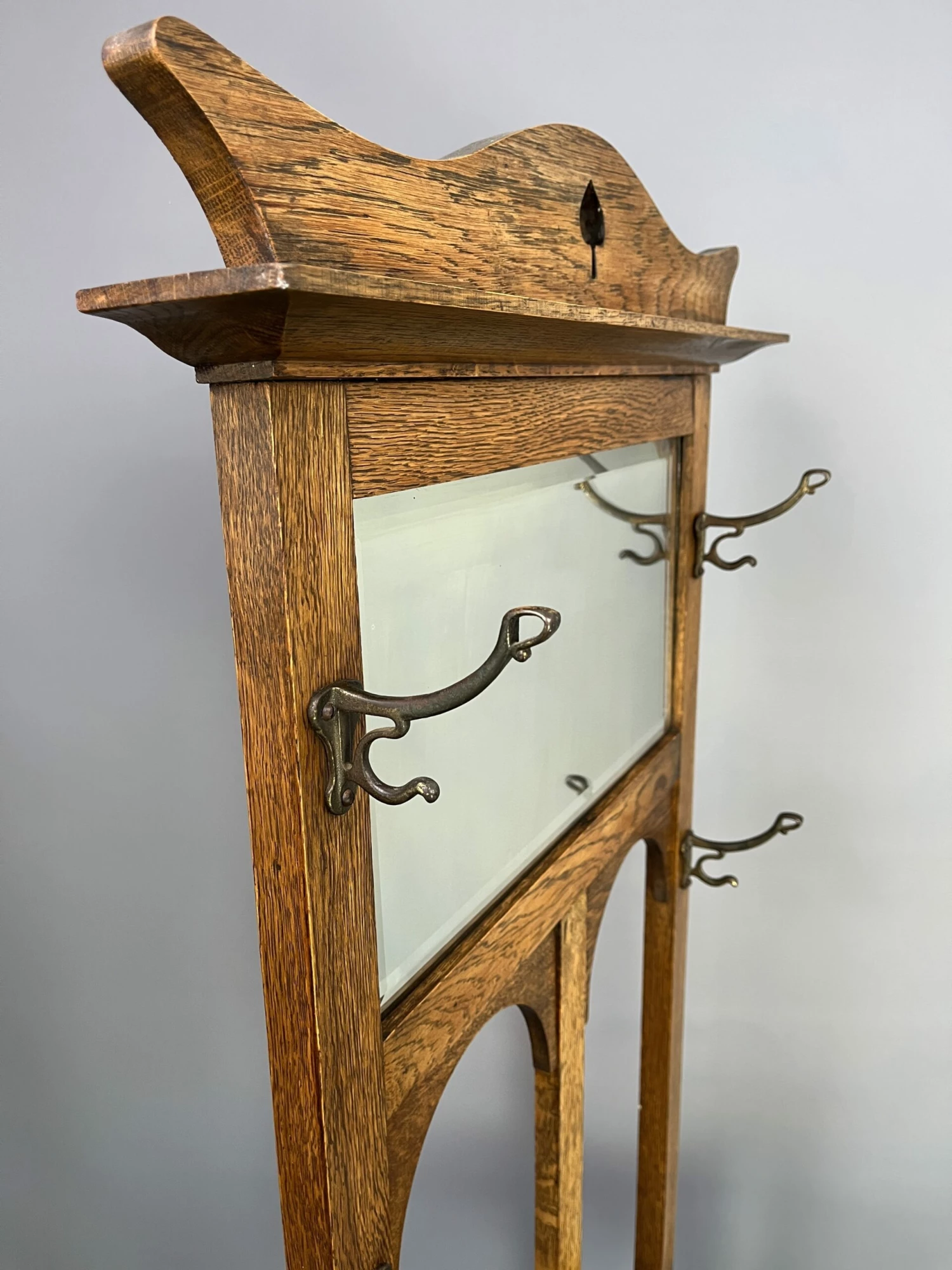 Arts & Crafts small and slim hallstand made of solid oak c1900. Spade cut-out to the top, original bevelled edge mirror plate, four original cast brass coat hooks, glove box and original drip tray. In good original condition, no breaks or repairs.