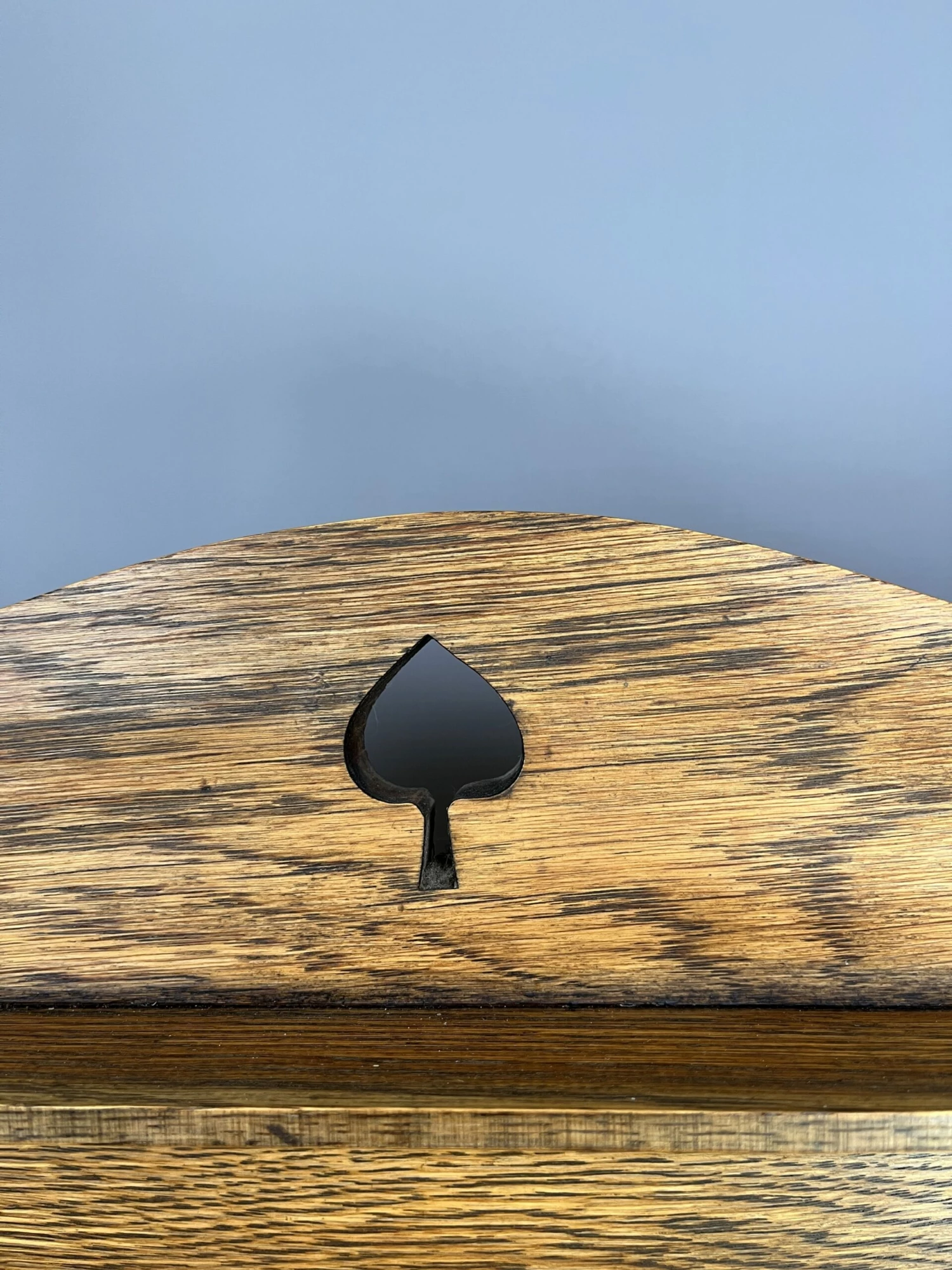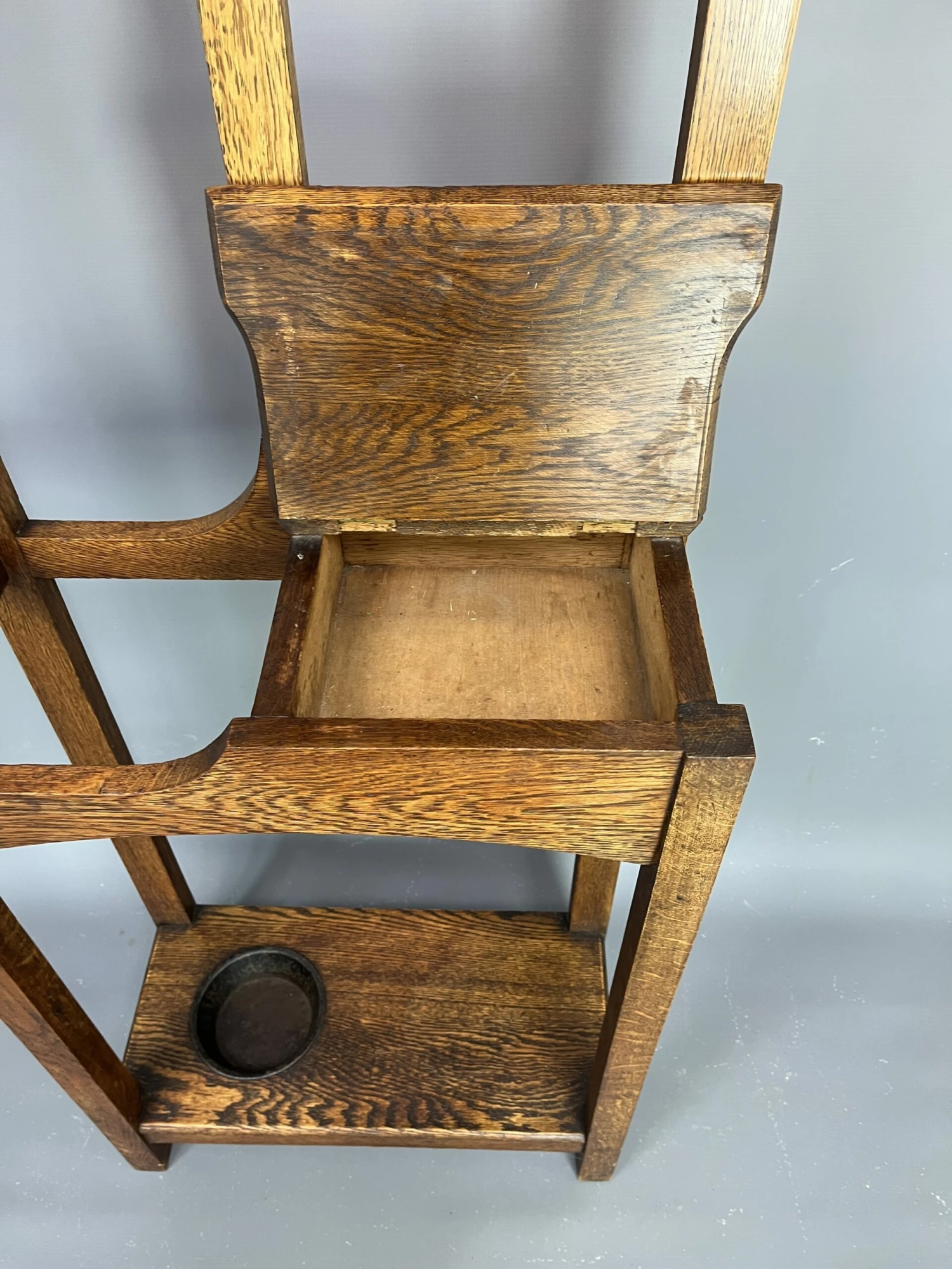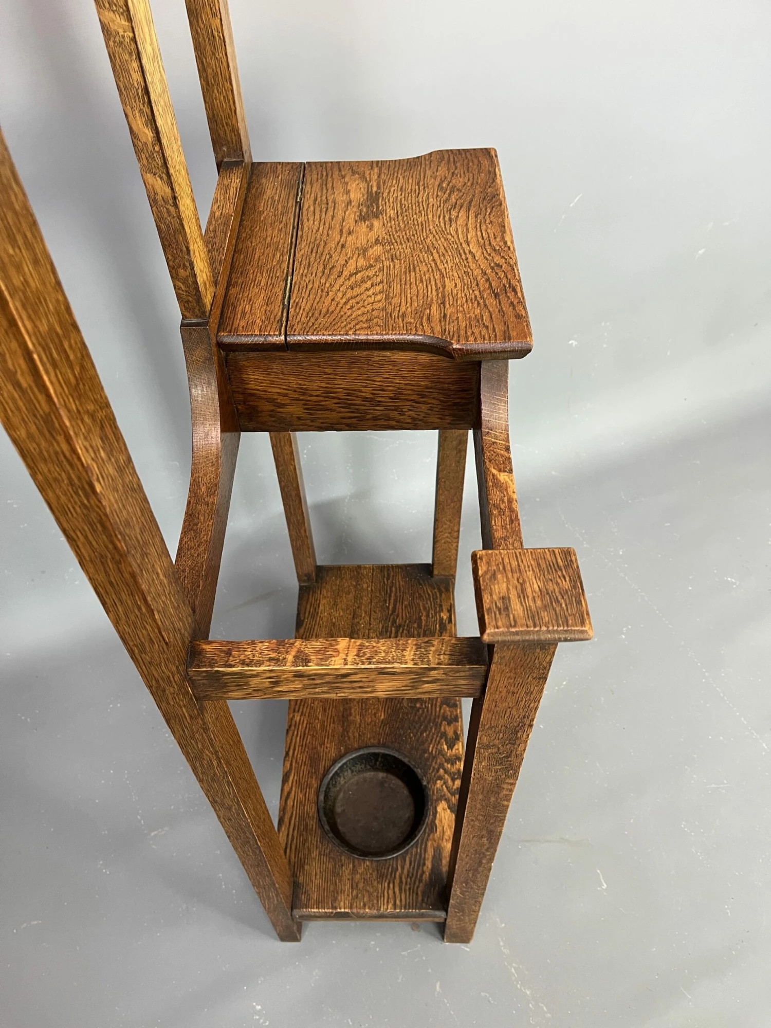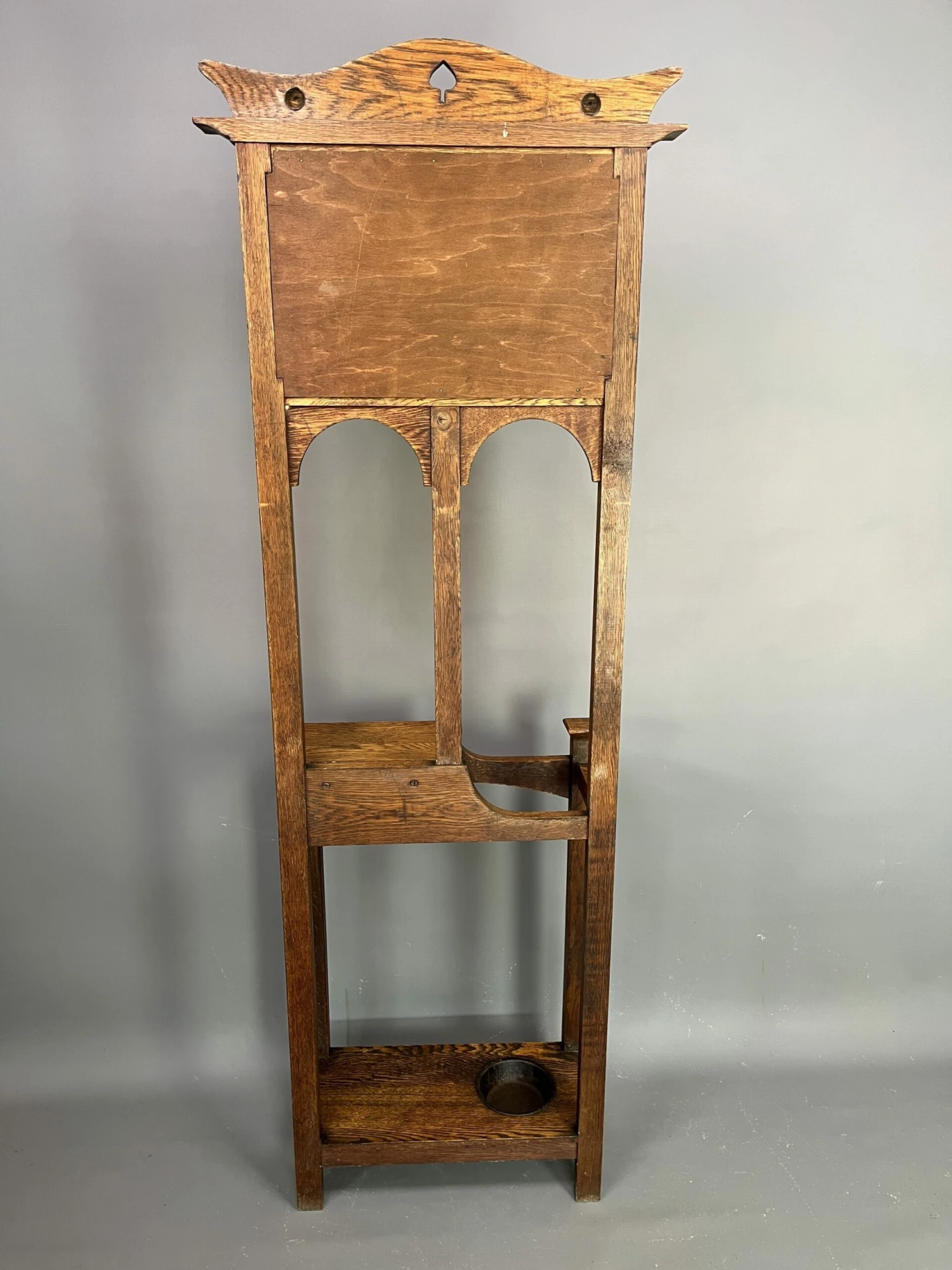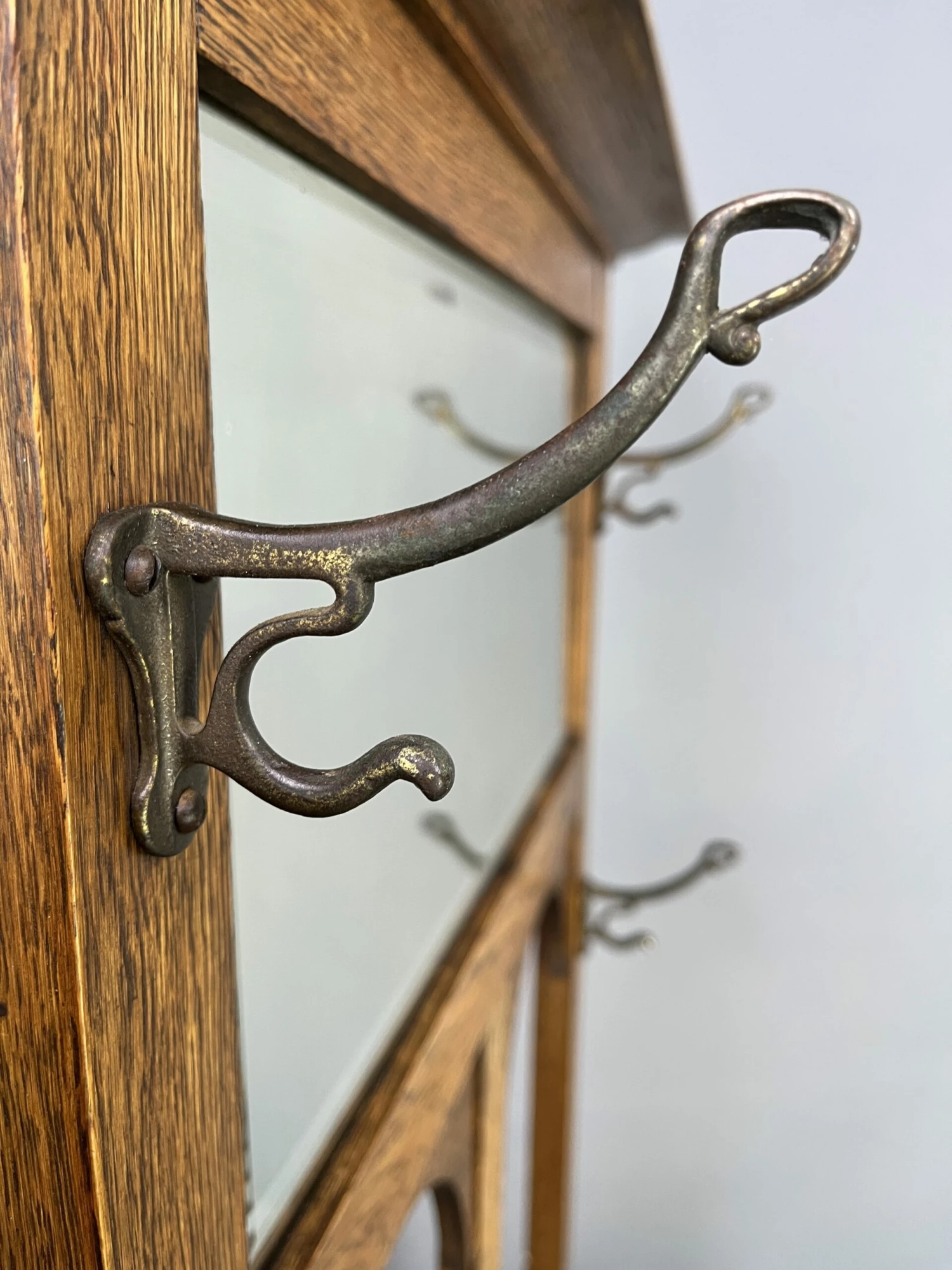Arts & Crafts small and slim hallstand made of solid oak c1900. Spade cut-out to the top, original bevelled edge mirror plate, four original cast brass coat hooks, glove box and original drip tray. In good original condition, no breaks or repairs.