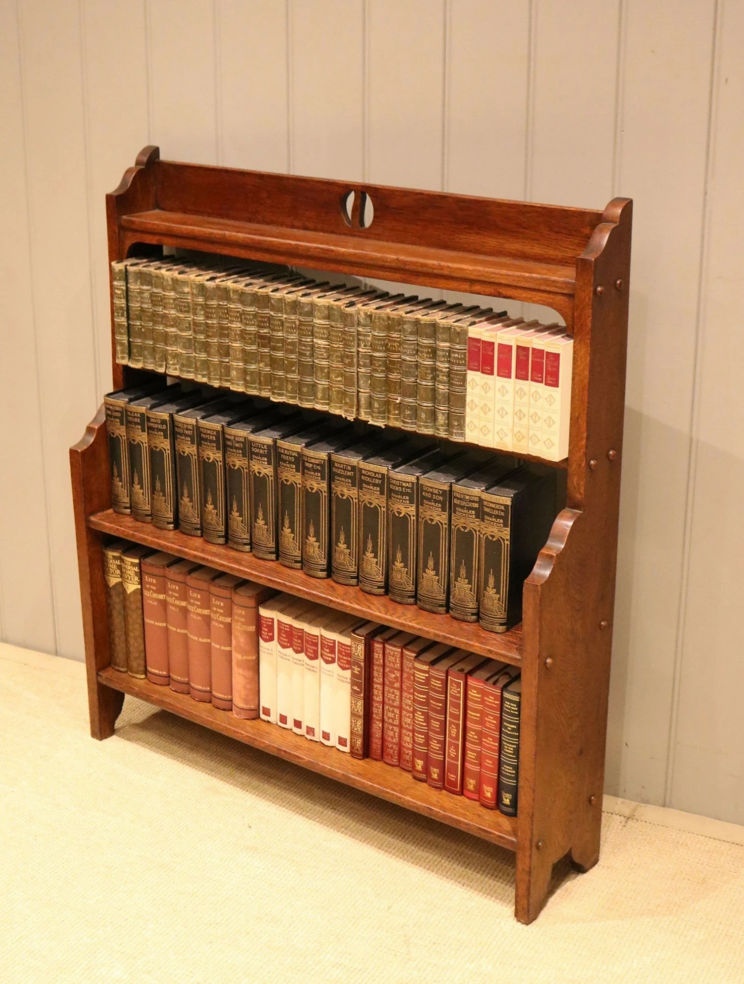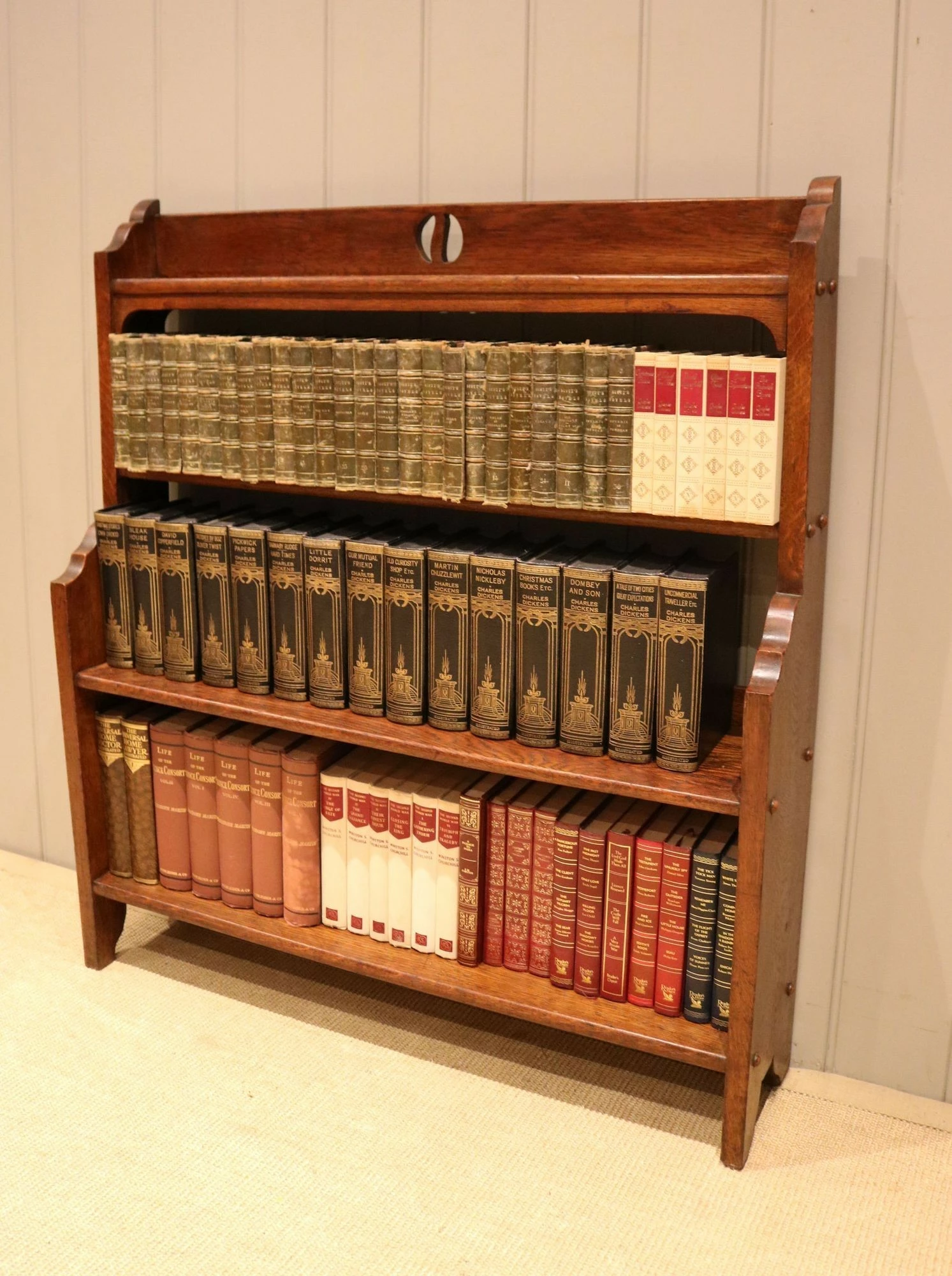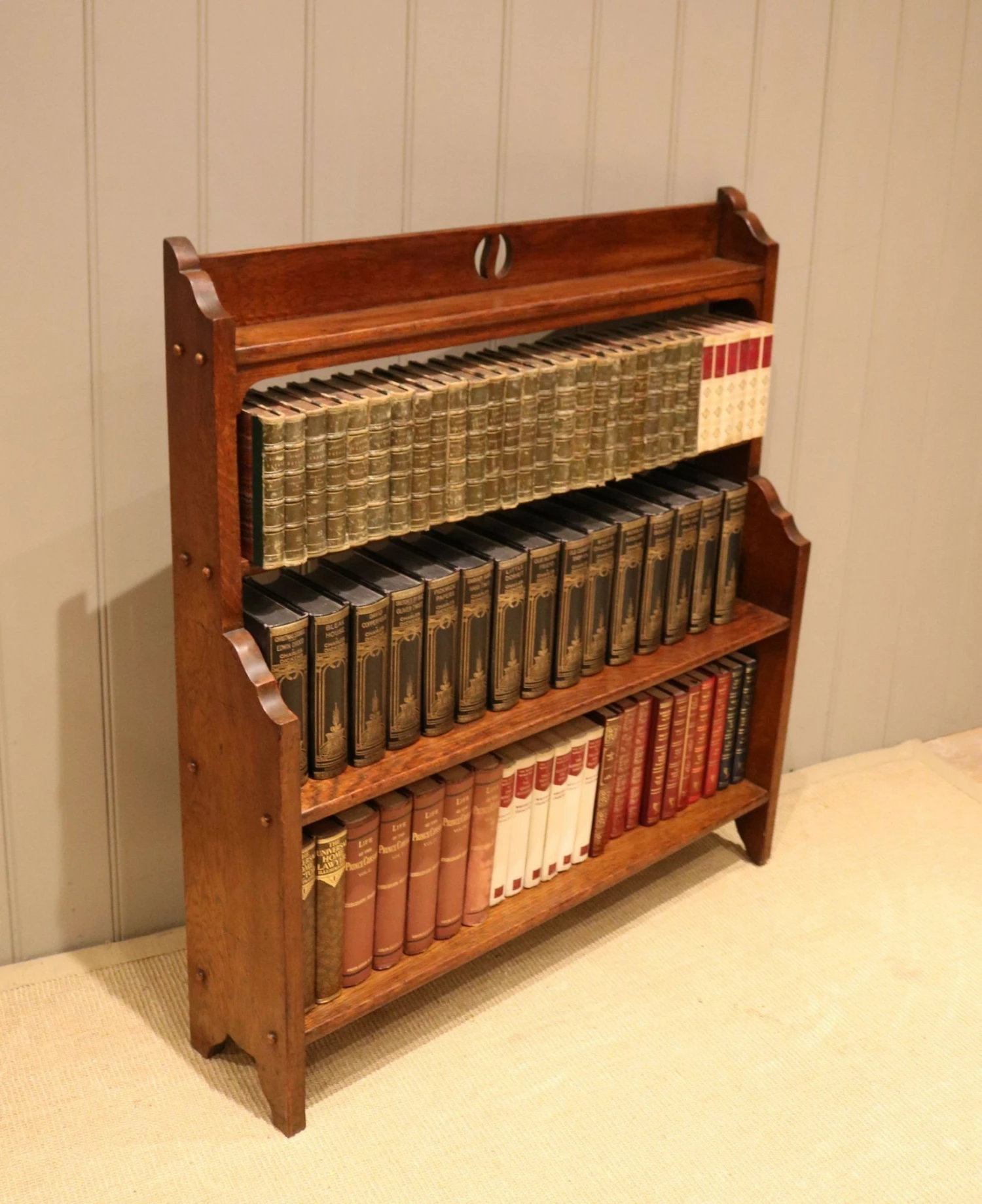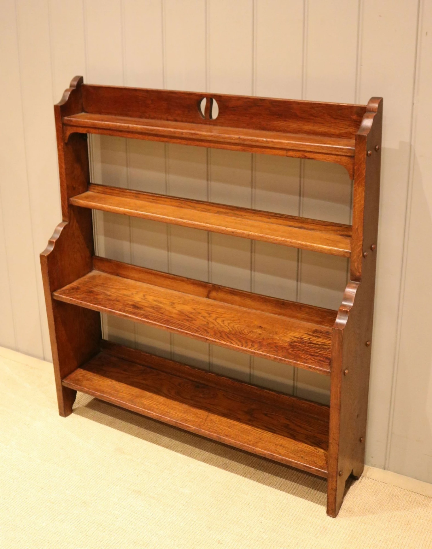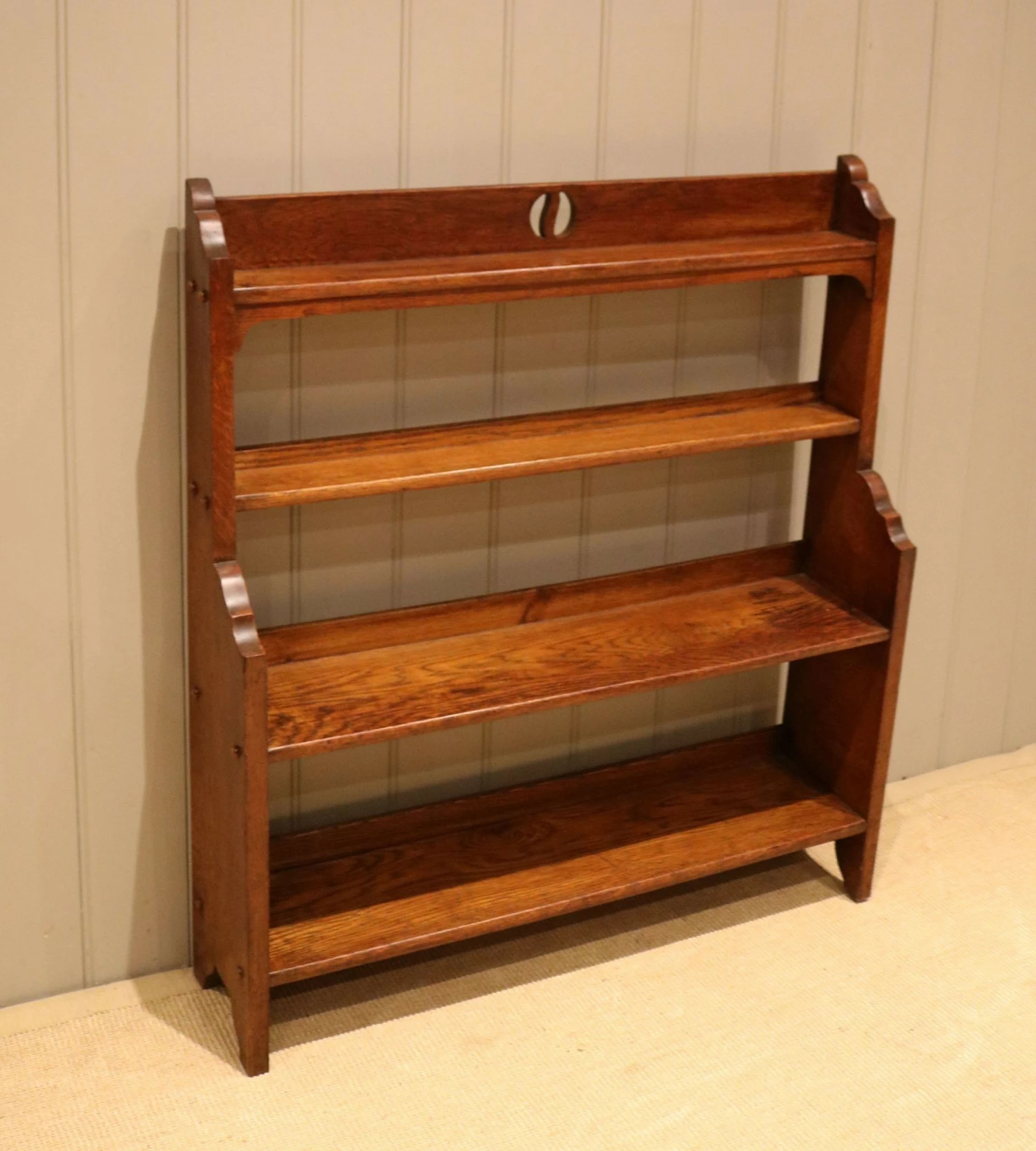 Arts and crafts oak open bookcase having three graduated fixed shelves with a pierced decoration to the top raised on side brackets . The shelf dimensions are 86 cm wide and from the bottom up 19 cm deep and 27 cm high , the middle 18 cm deep and 24 cm high and the top 9 cm deep and 20 cm high.