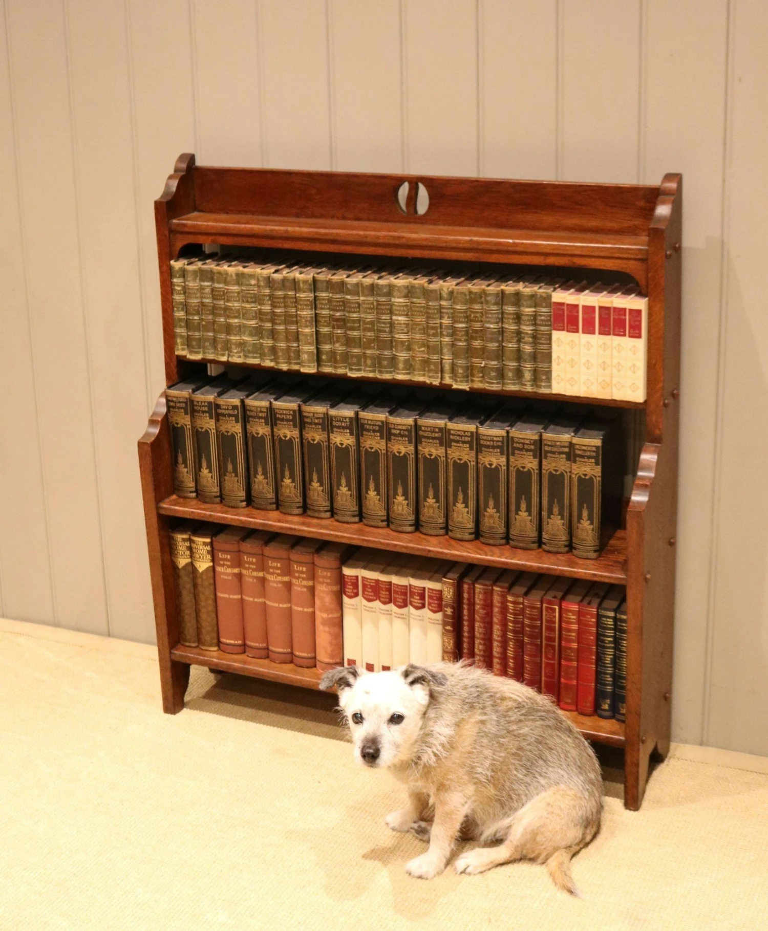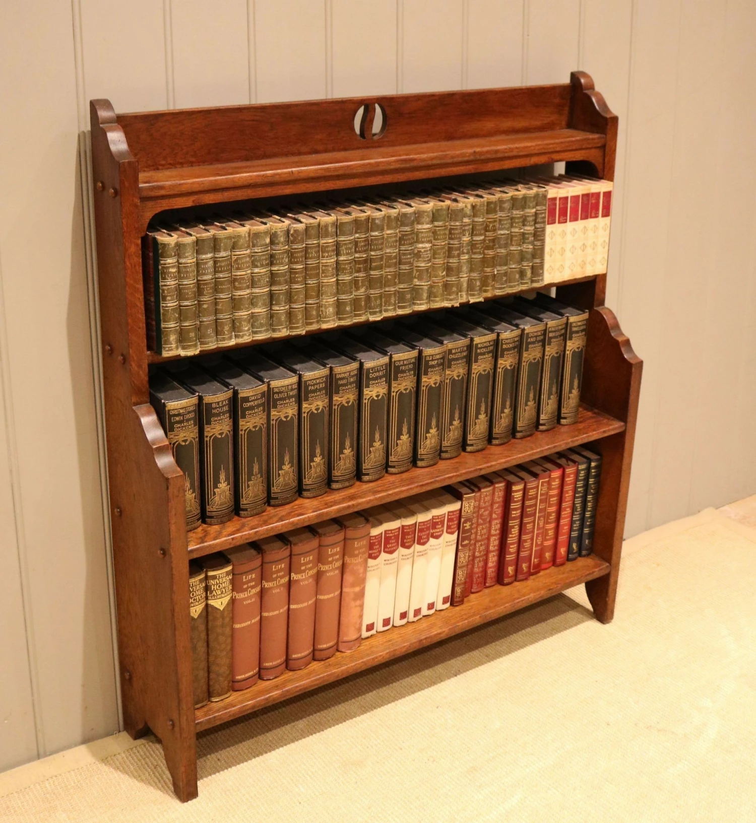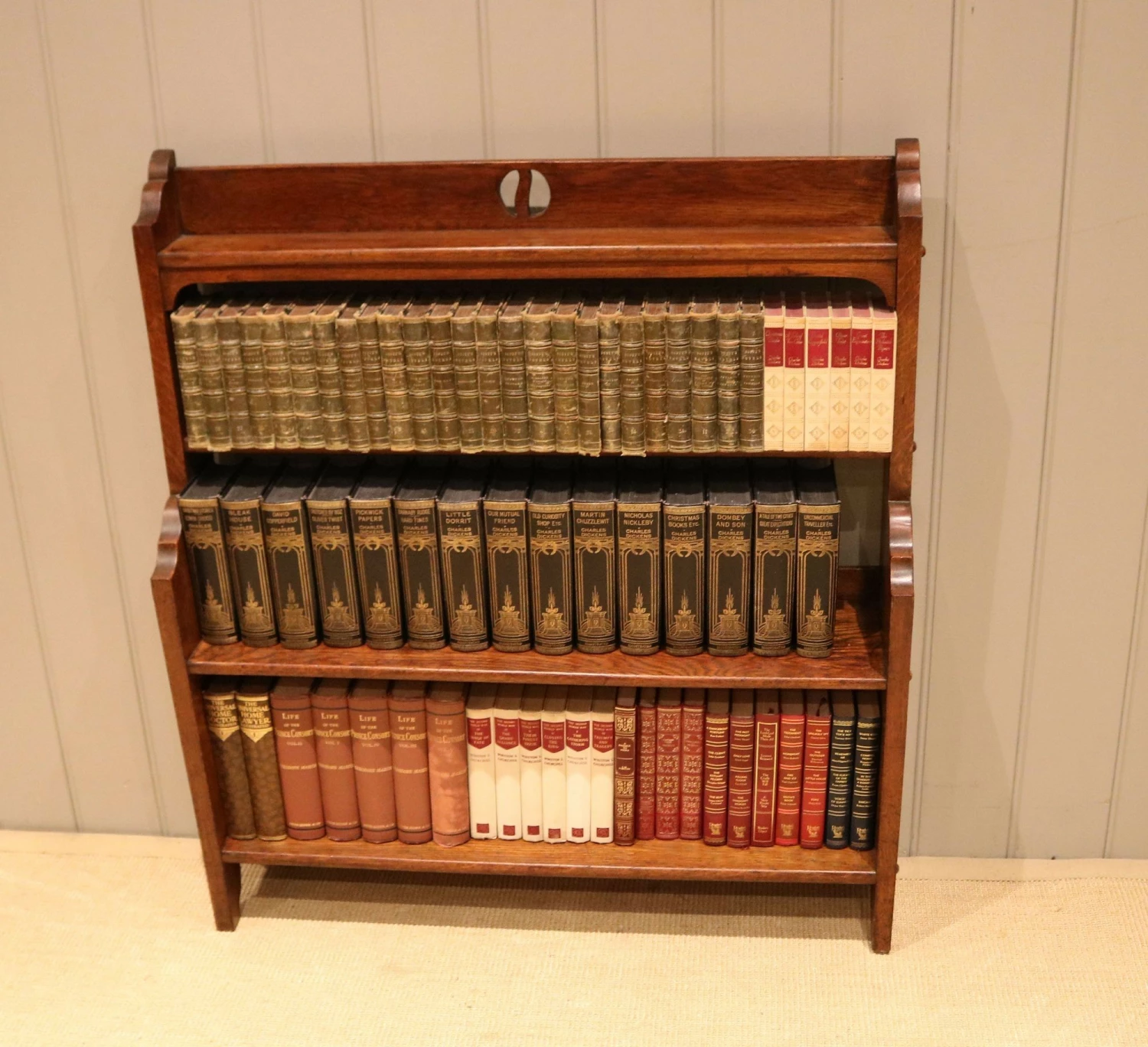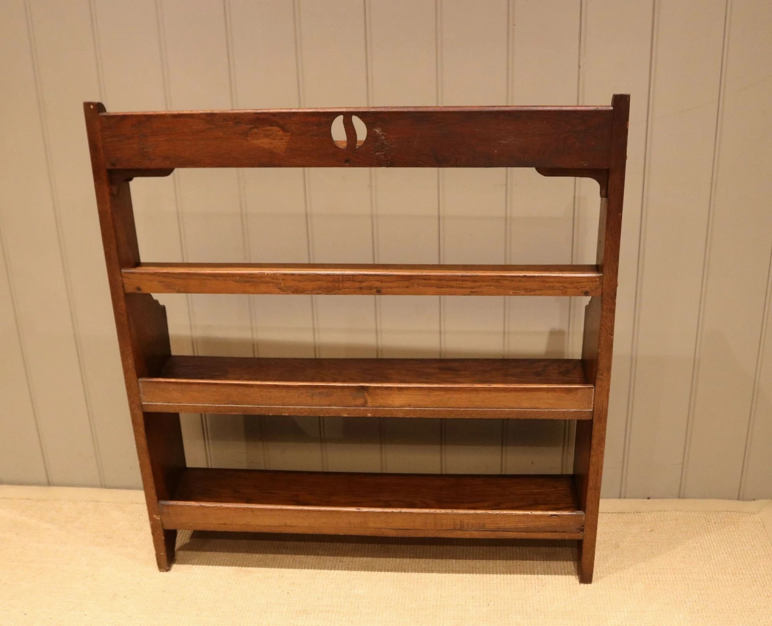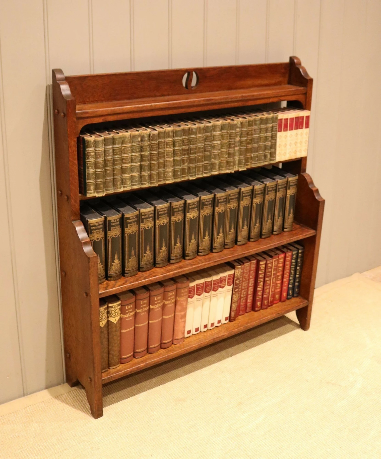 Arts and crafts oak open bookcase having three graduated fixed shelves with a pierced decoration to the top raised on side brackets . The shelf dimensions are 86 cm wide and from the bottom up 19 cm deep and 27 cm high , the middle 18 cm deep and 24 cm high and the top 9 cm deep and 20 cm high.