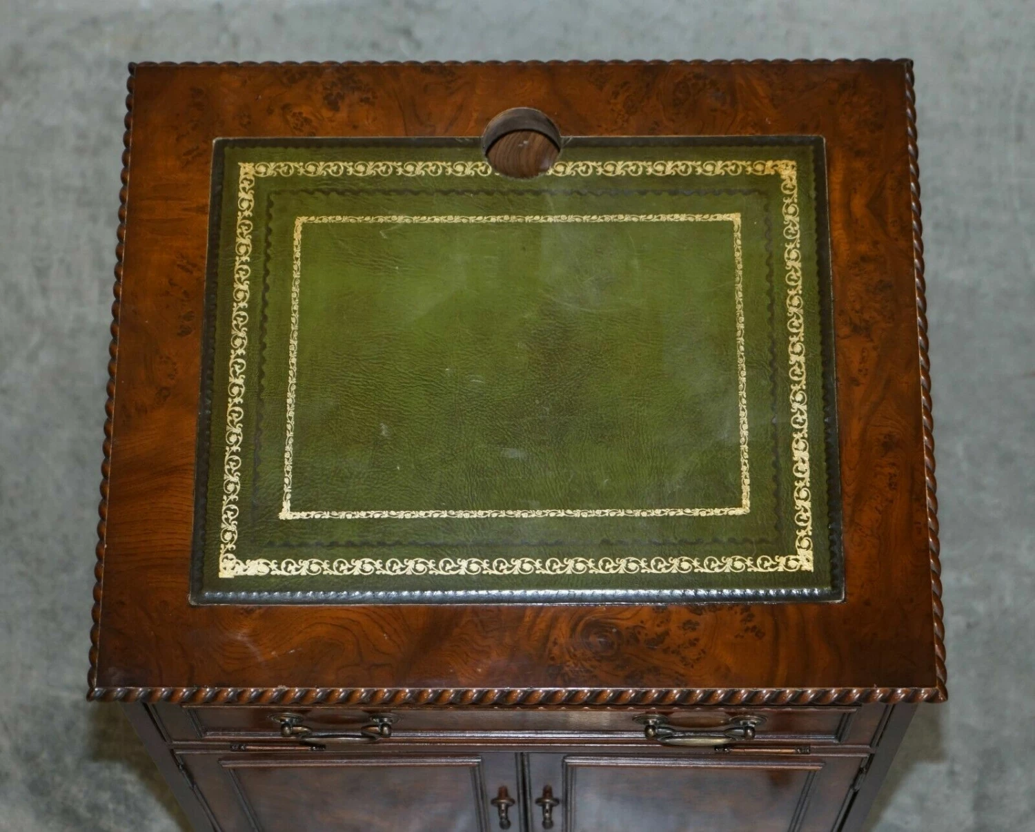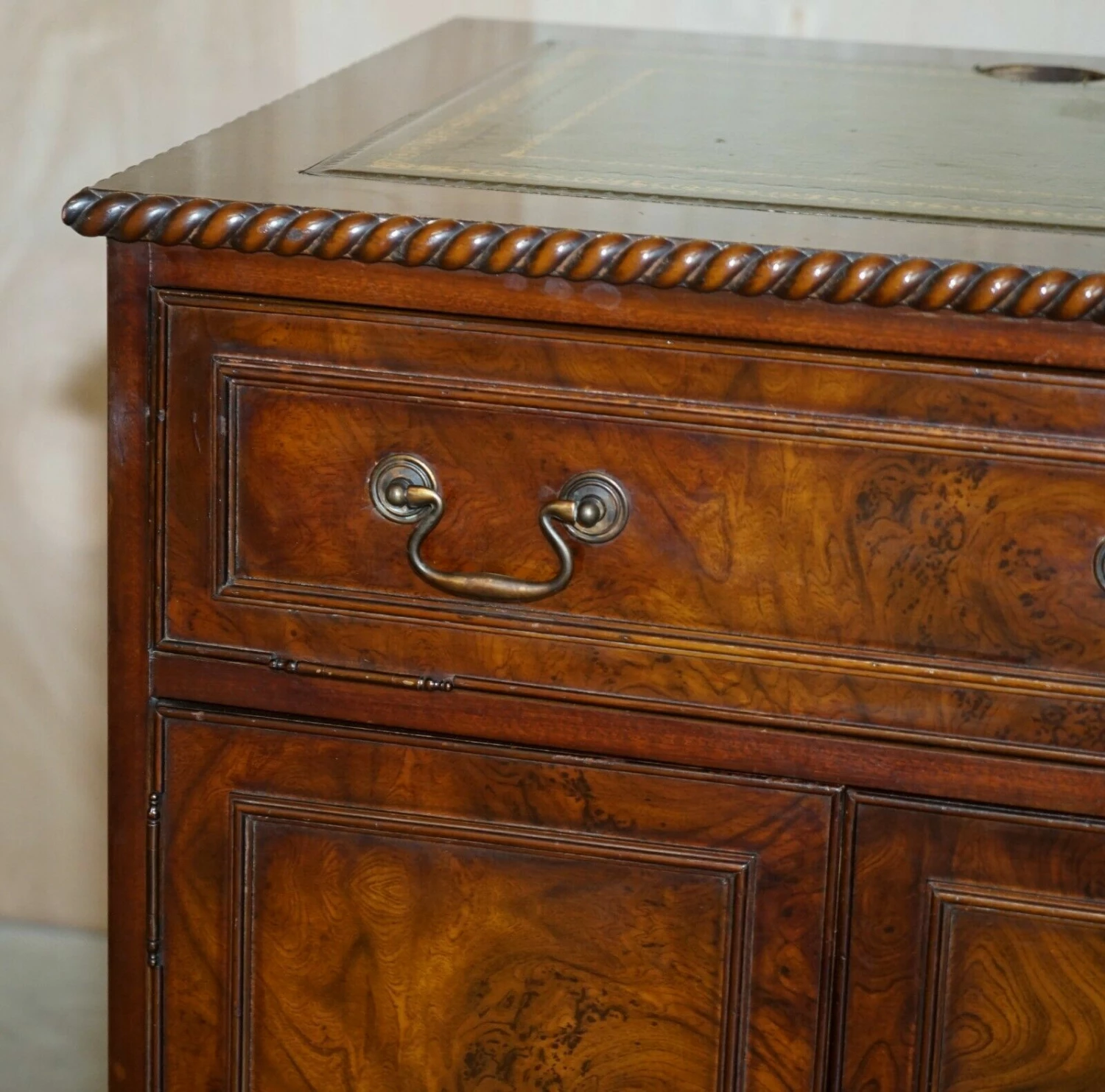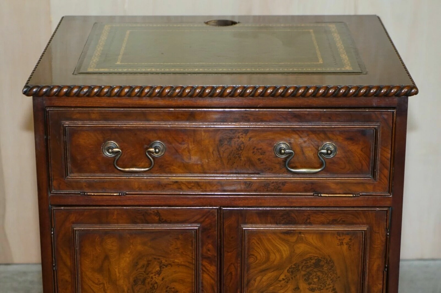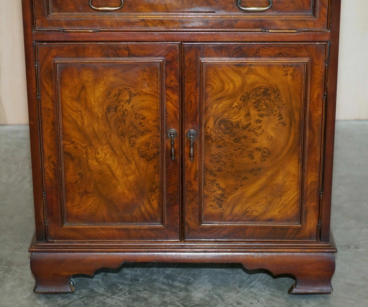 Royal House Antiques is delighted to offer for sale this lovely, very well made Burr Elm twin side cupboard with gold leaf embossed green leather writing surface which is part of a suite