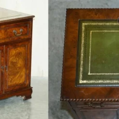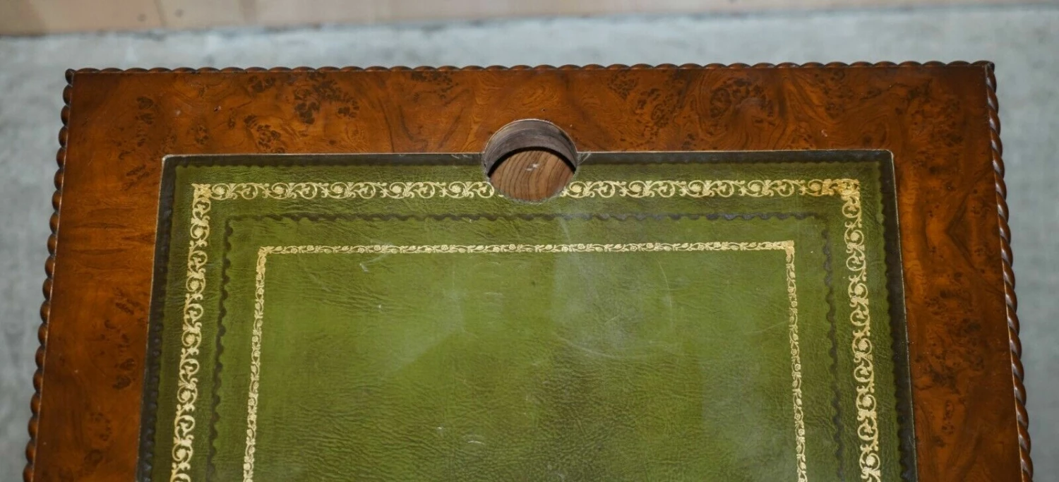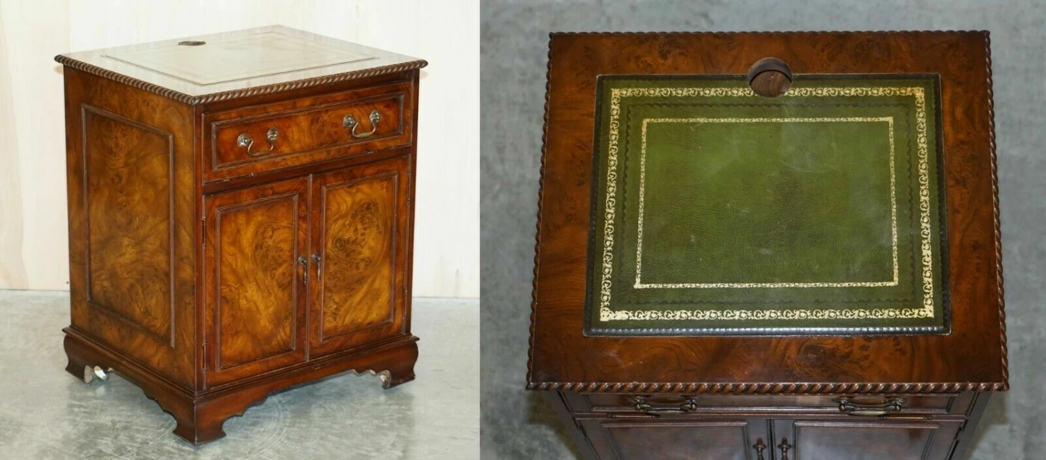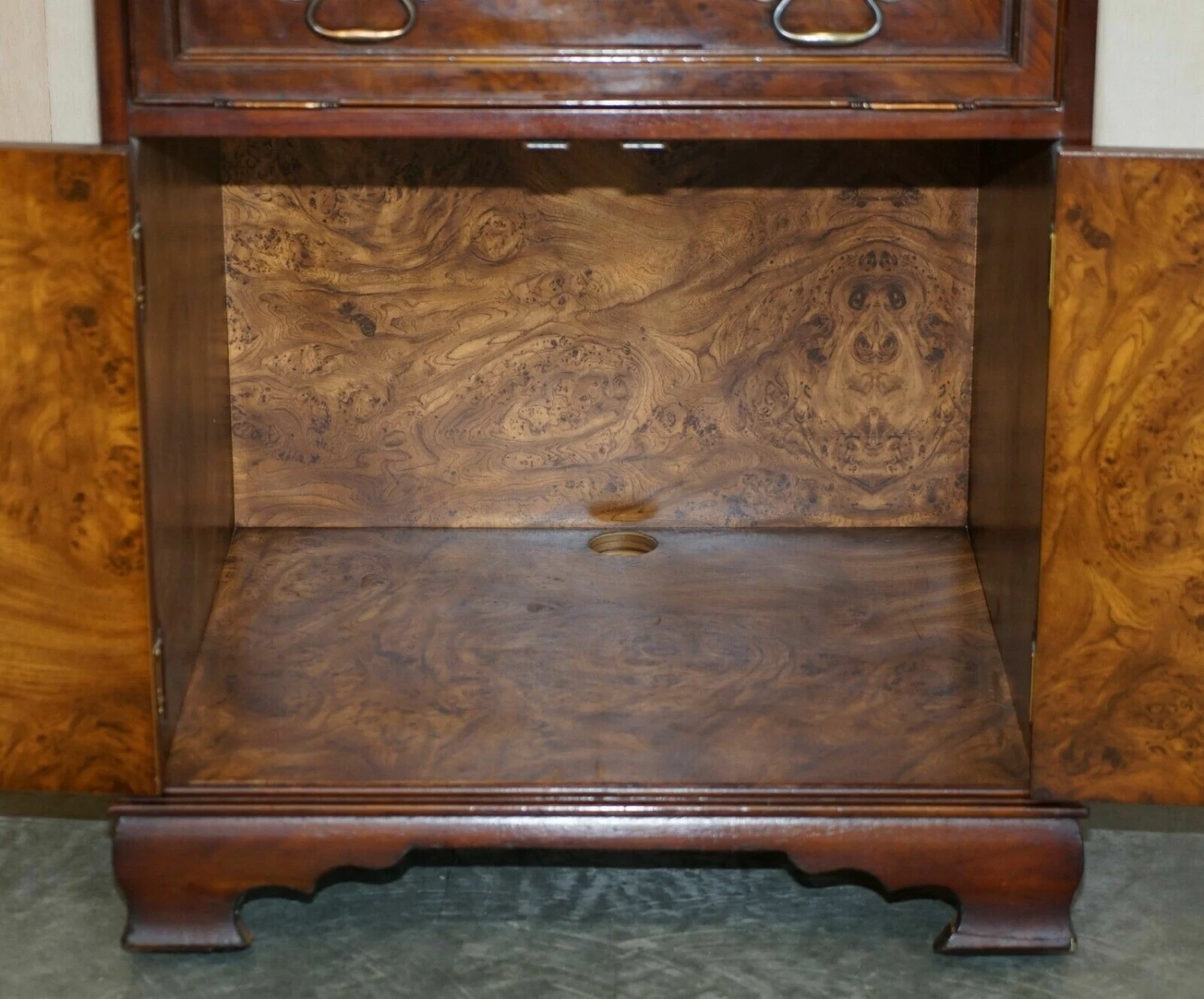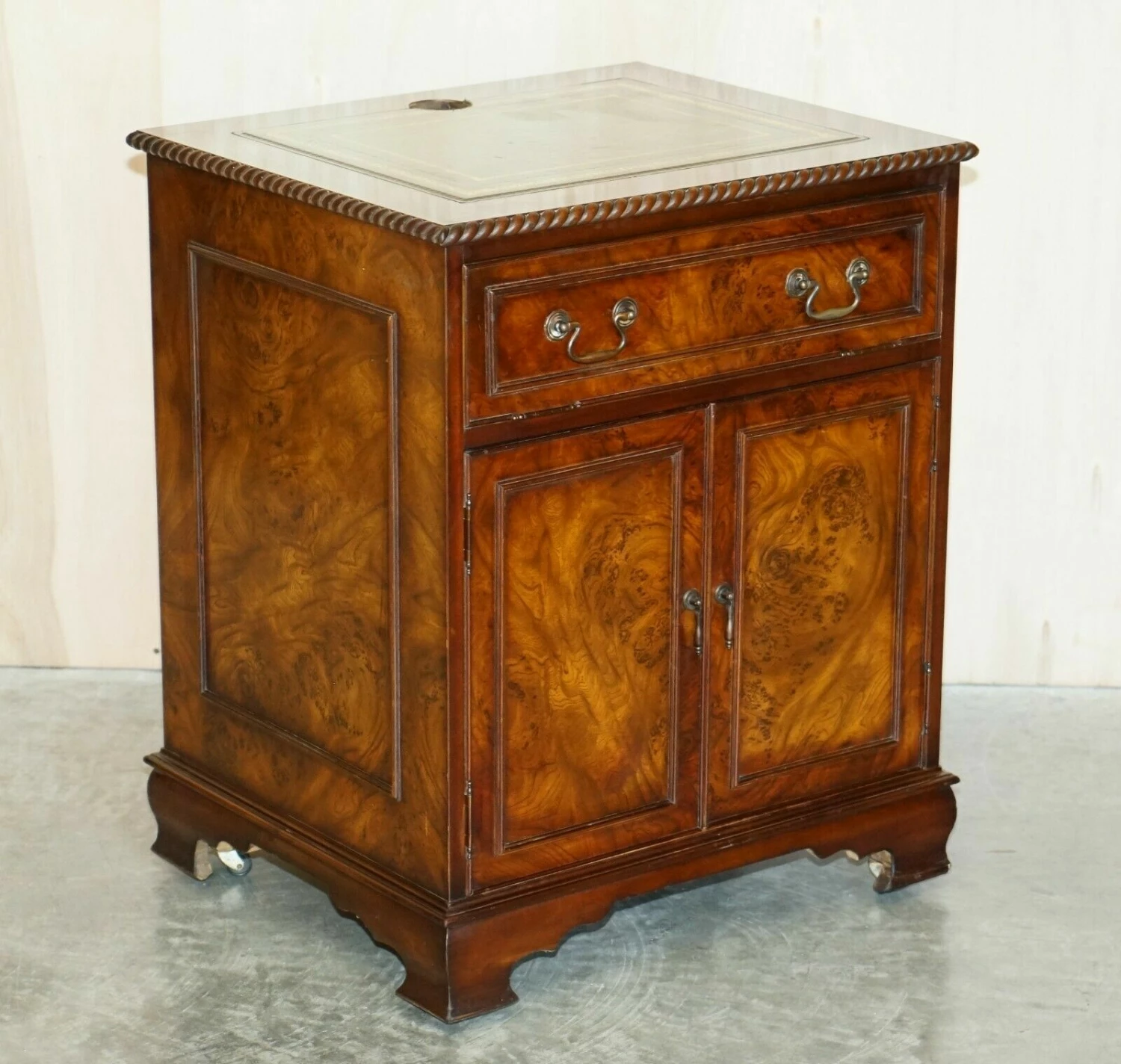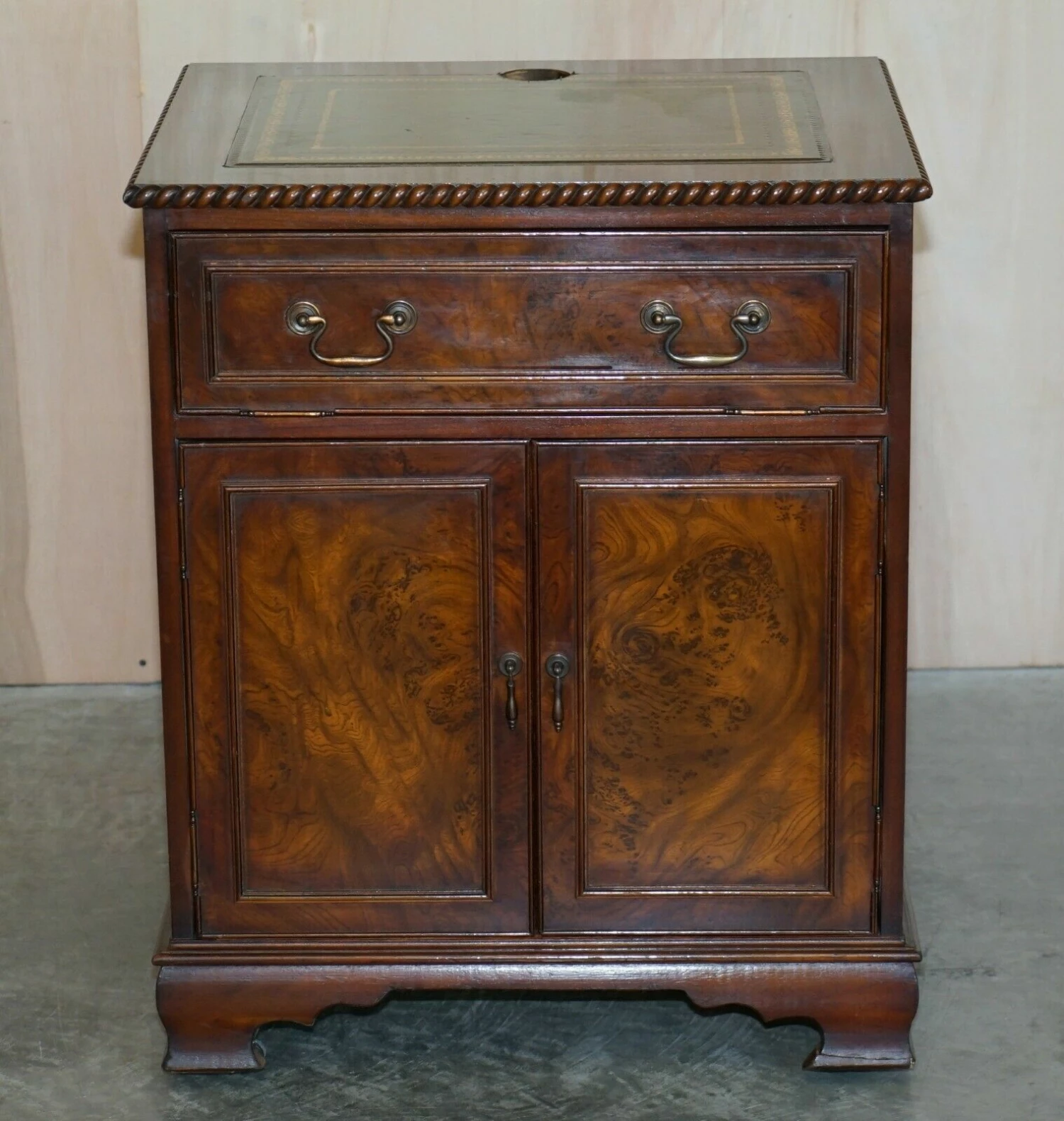 Royal House Antiques is delighted to offer for sale this lovely, very well made Burr Elm twin side cupboard with gold leaf embossed green leather writing surface which is part of a suite