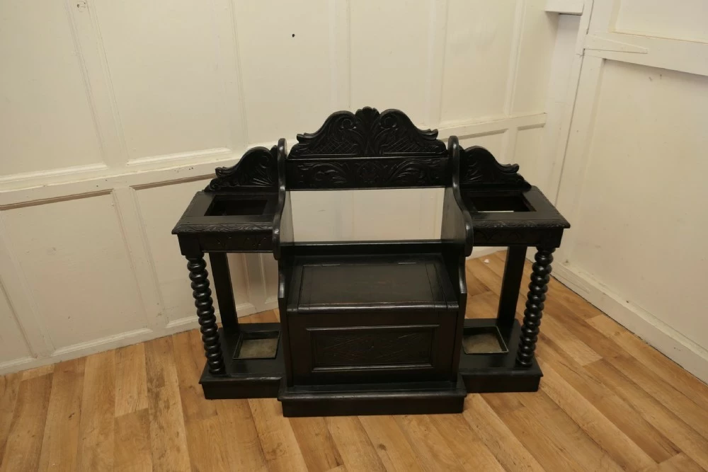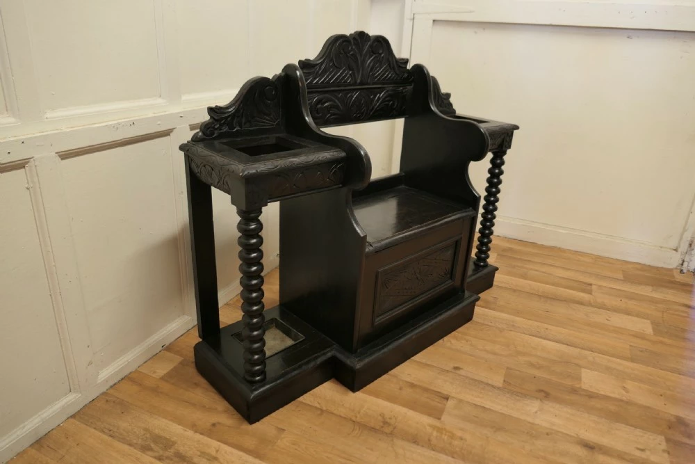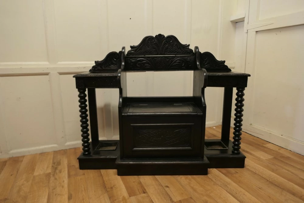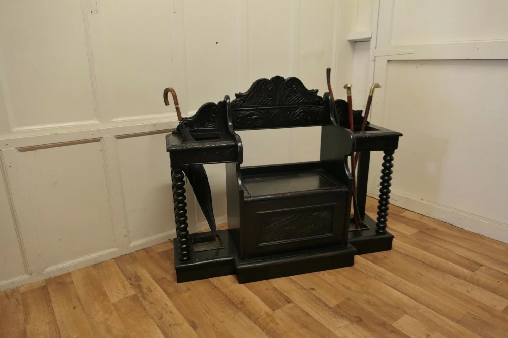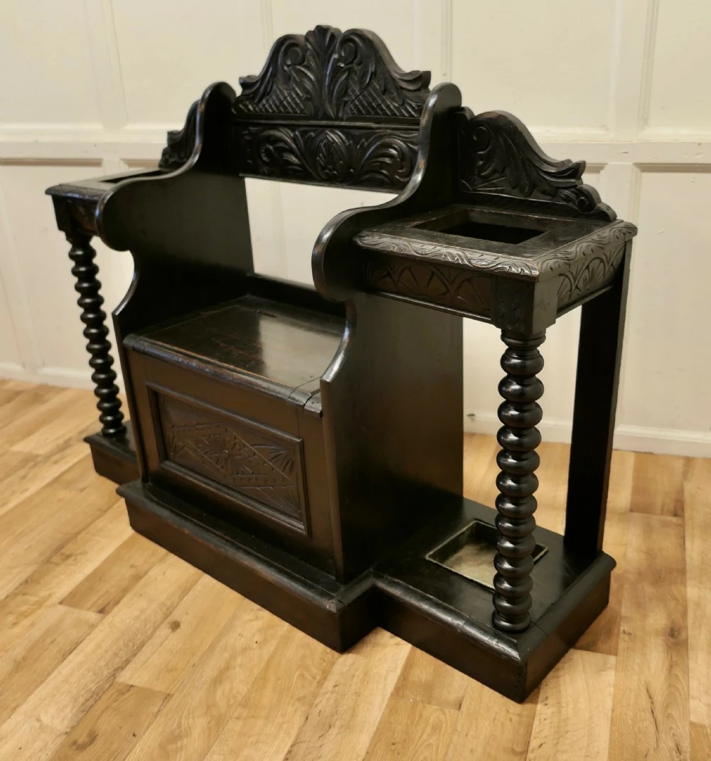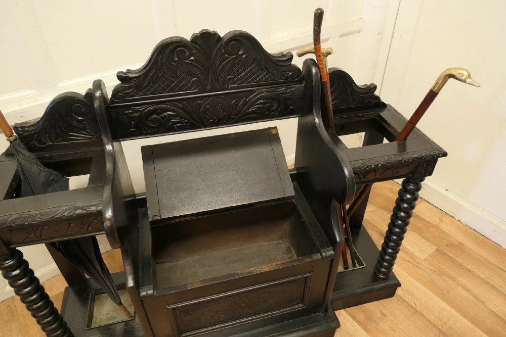 This is a carved Oak Hall Stand, in the form of a small settle which has a roomy stick stand on each side and storage inside the seat