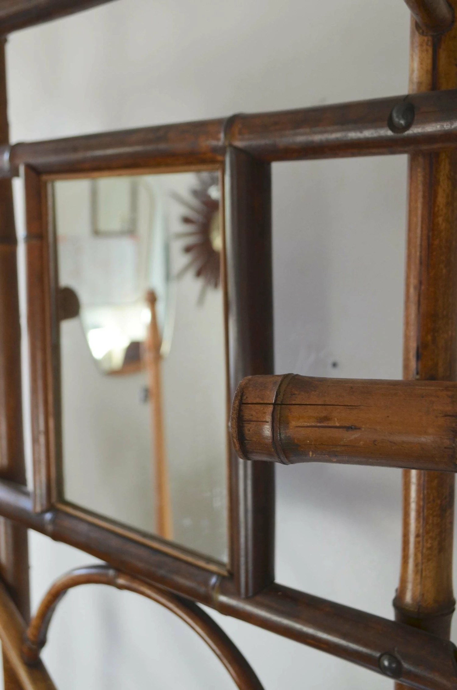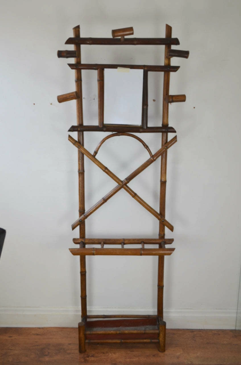 An antique bamboo hallway coat, hat and umbrella stand with metal drip tray and mirror. Benefitting from amazing patina and colour as well detailed end caps to some of the poles.