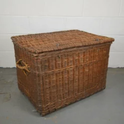 An early 20th century laundry / hamper / log wicker basket of large proportions. The hinged lid opening to reveal a spacious interior. Long metal rod acting as the lock / latch still present.
