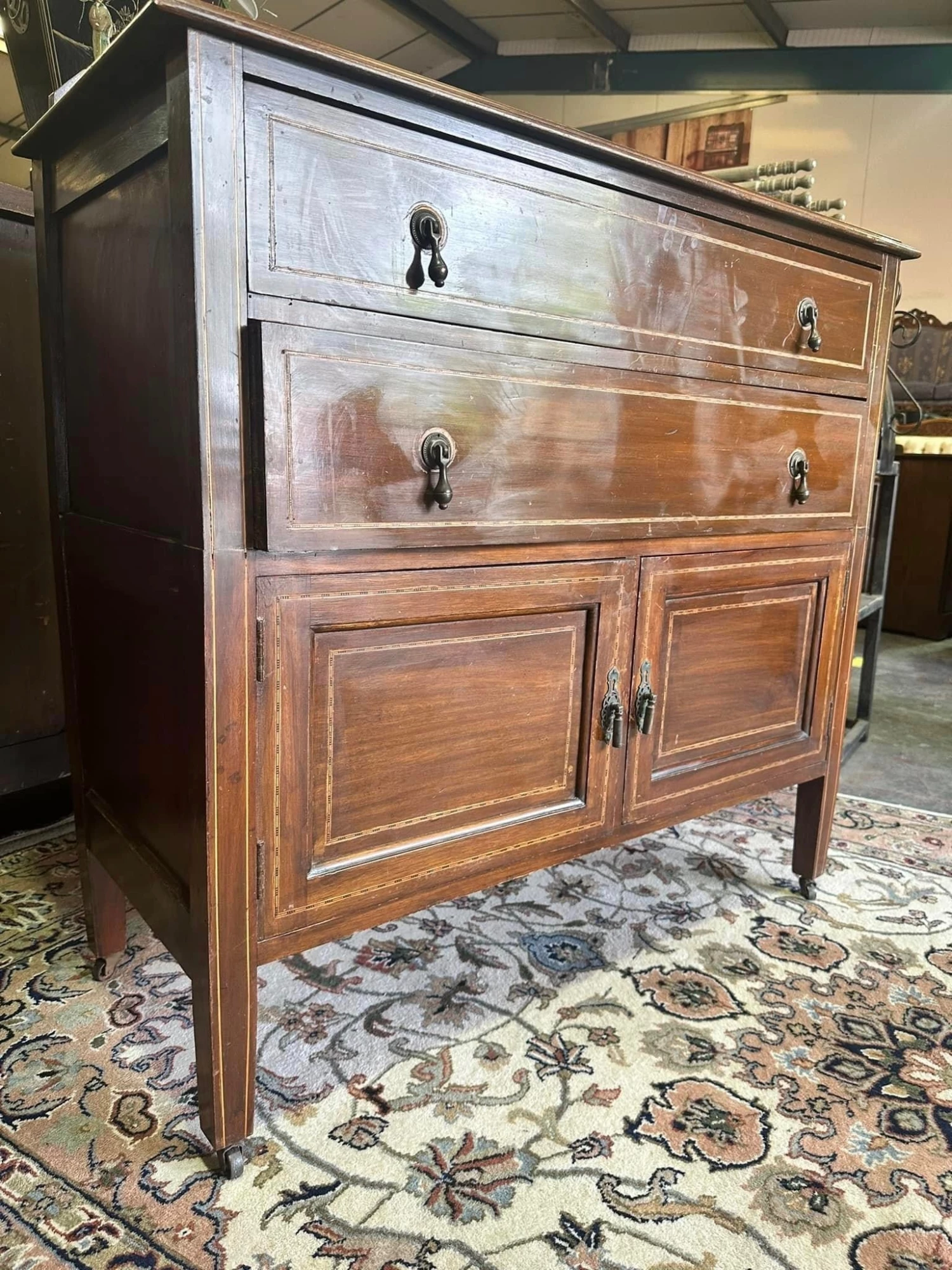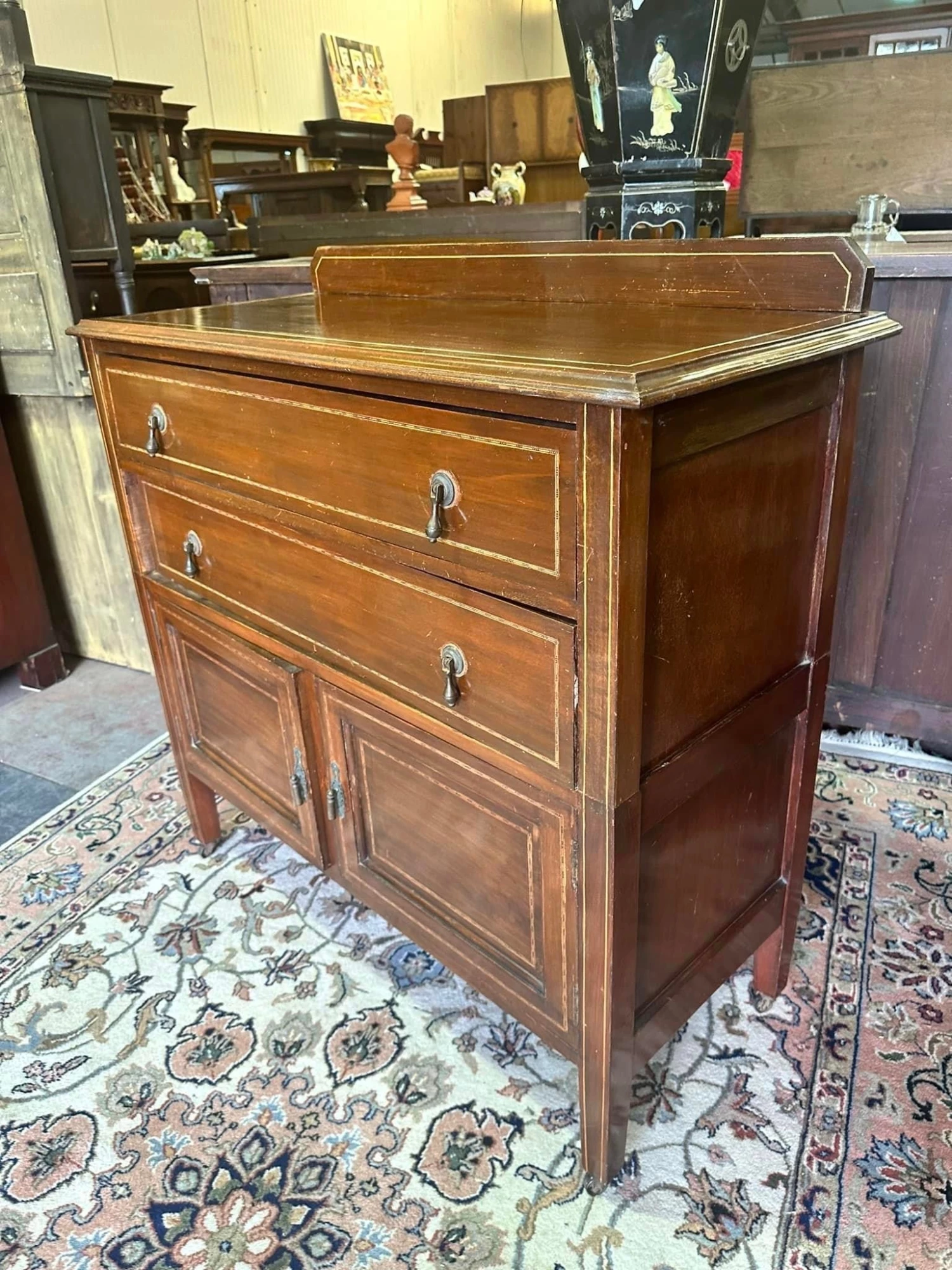 Edwardian inlaid mahogany washstand, having a galleried back, over two long drawers with tear drop brass handles above a double door cupboard – all resting on tapered supports and brass casters.