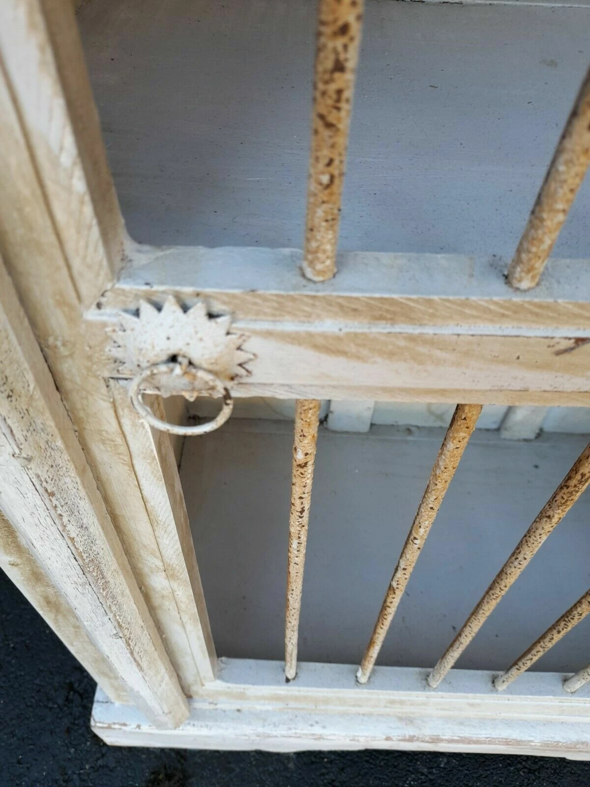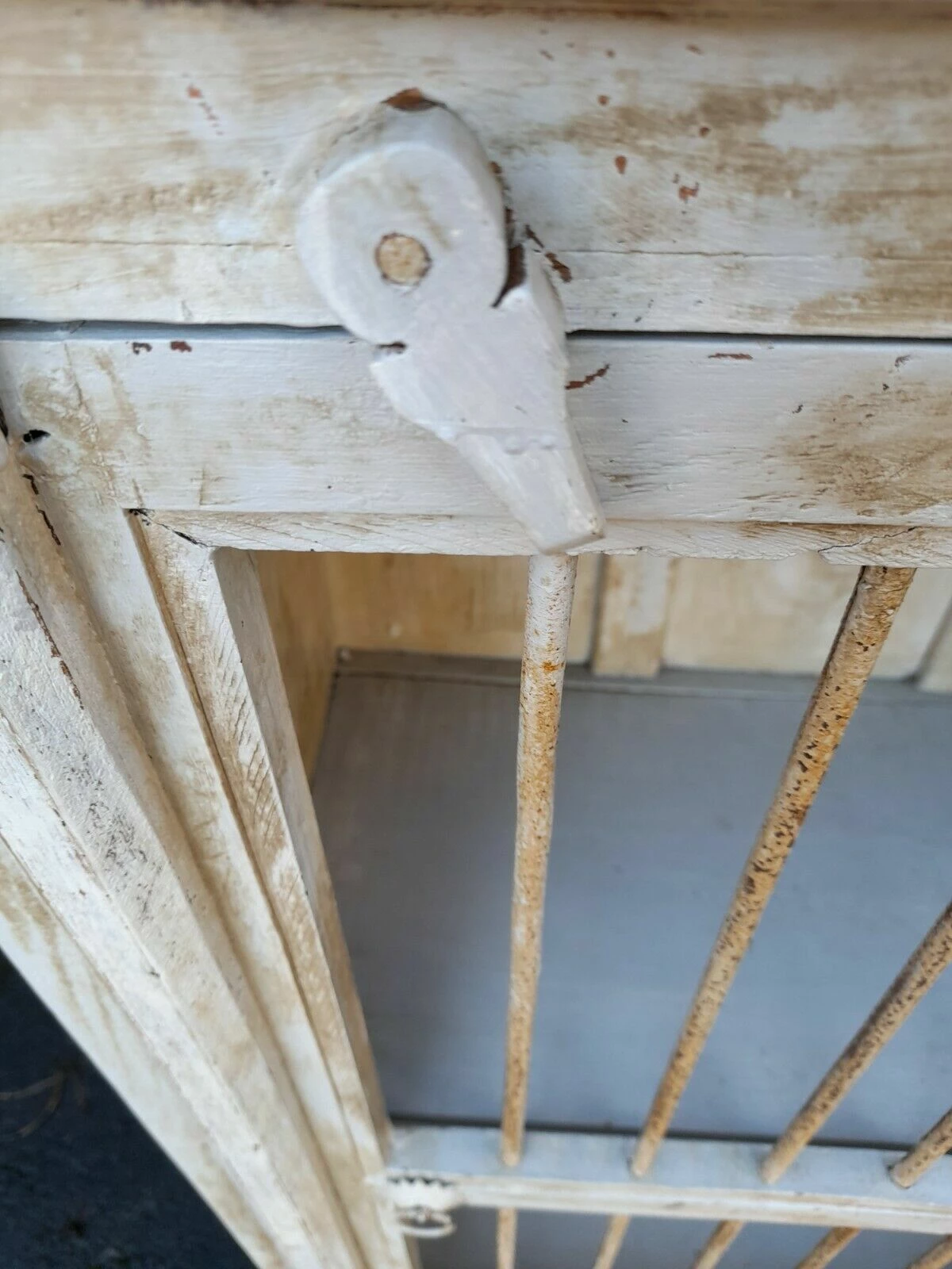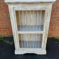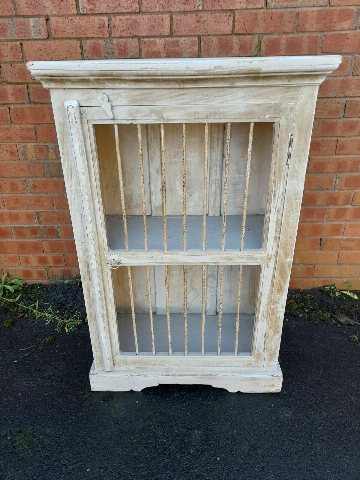 Painted French-style wooden cupboard with single shelf and door with steel rods. Painted white. Heavy, solid construction. Height 101cm, width 64cm, depth 32cm. Door secured with rotating latch.