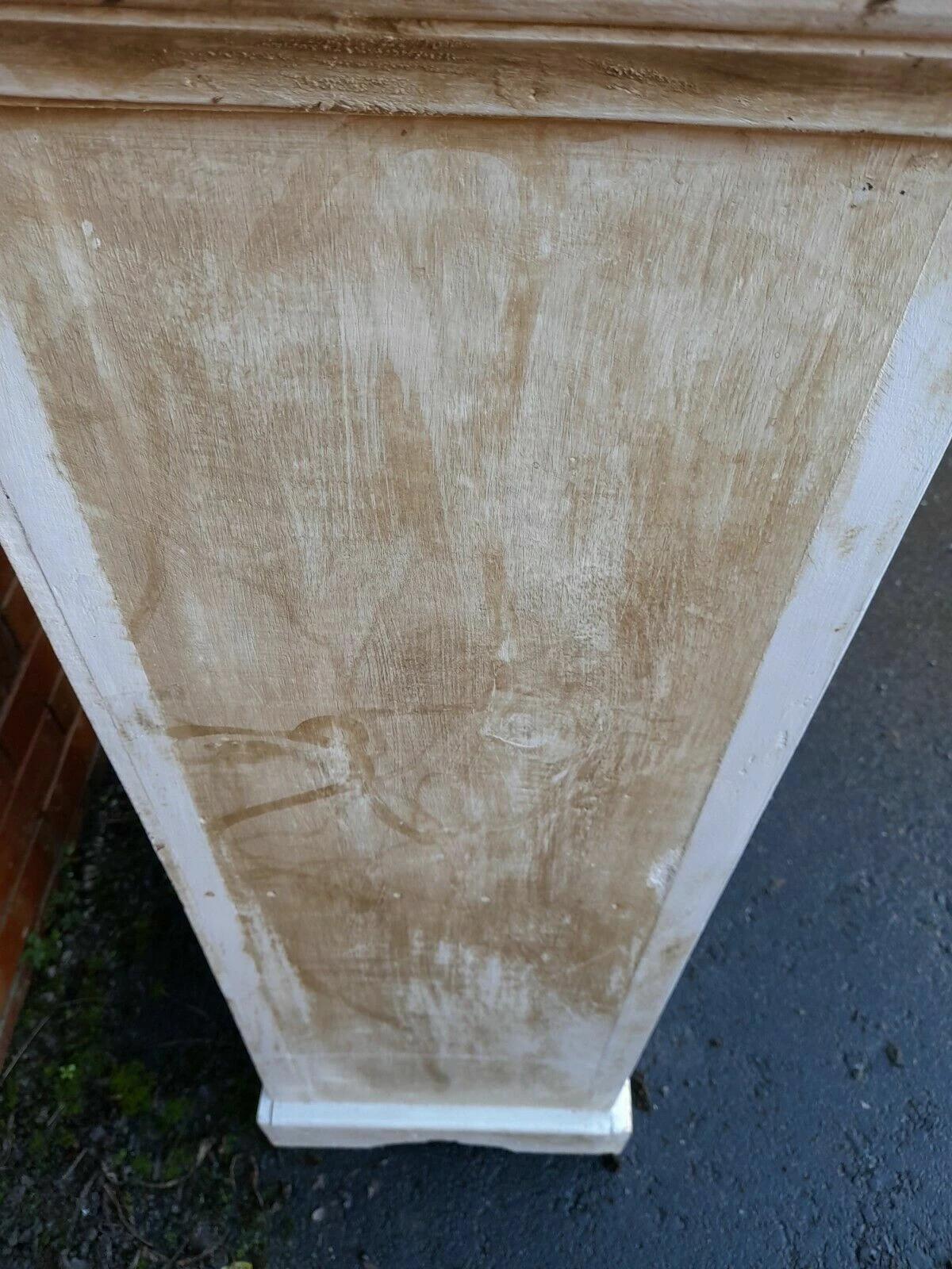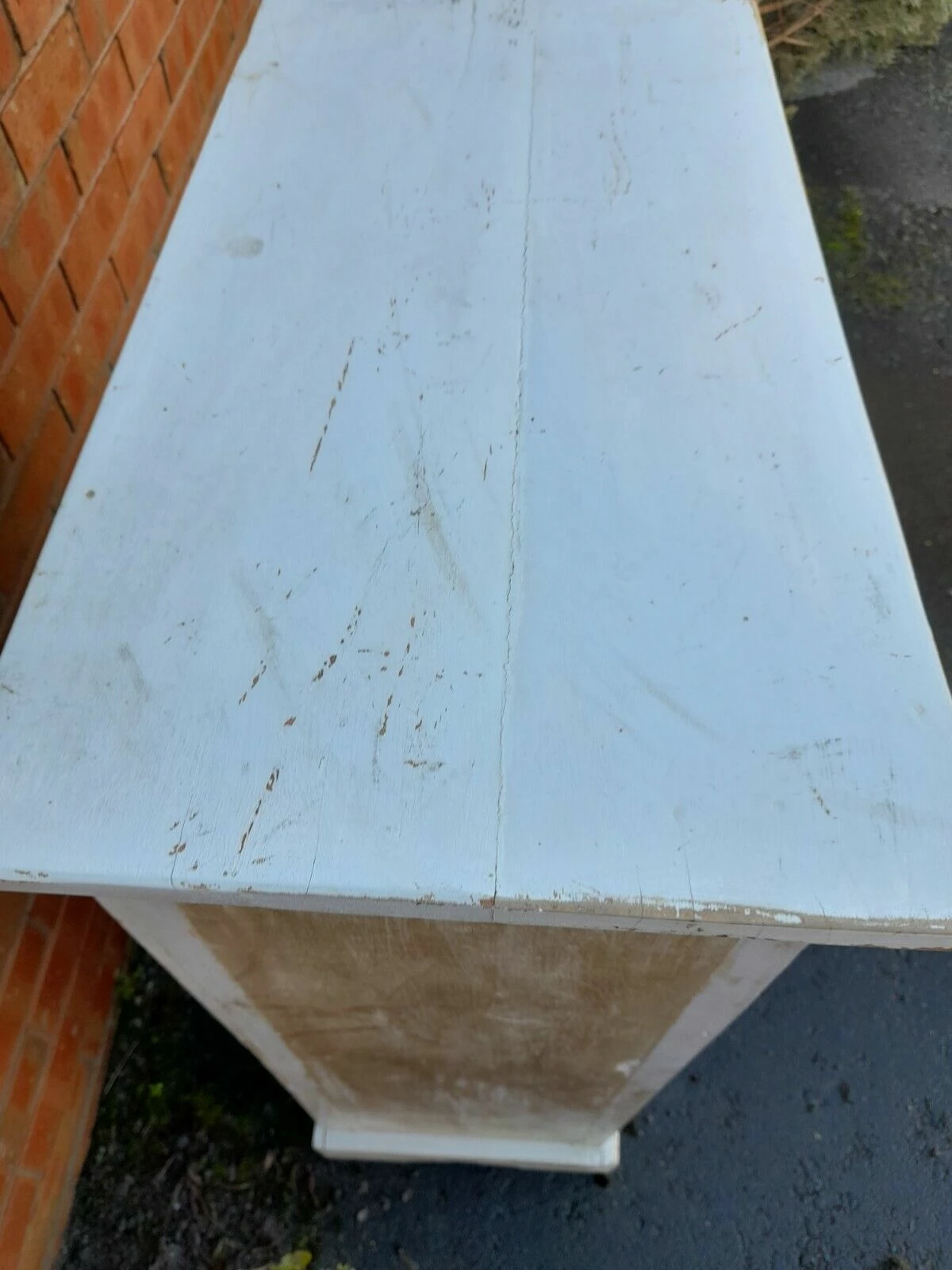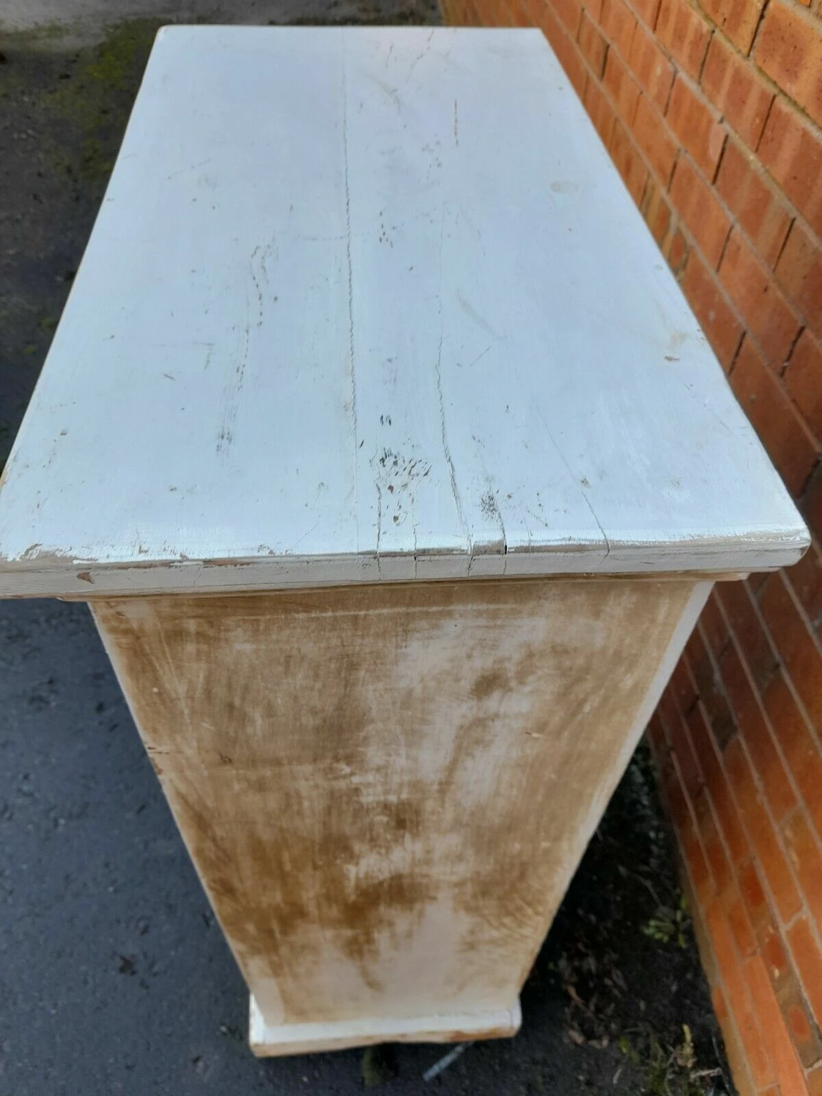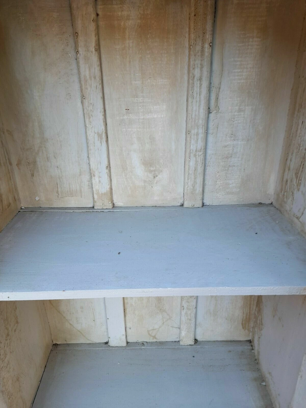 Painted French-style wooden cupboard with single shelf and door with steel rods. Painted white. Heavy, solid construction. Height 101cm, width 64cm, depth 32cm. Door secured with rotating latch.
