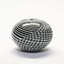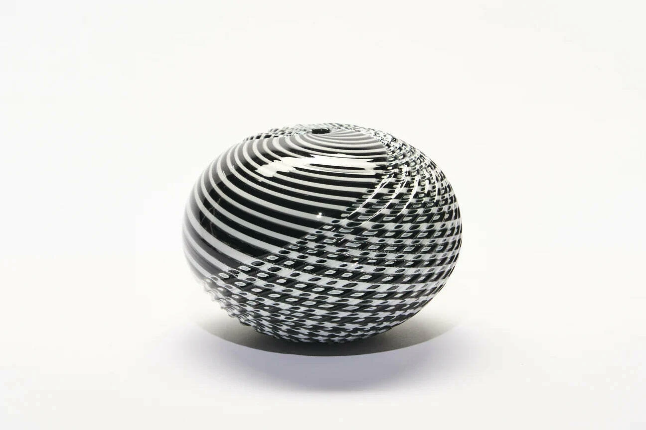 Layne’s Woven Forms are inspired by the Devon coastline and have been evolving for several years. This series of work is a result of intricate layering of different pre-made coloured canes around a molten form that is twisted and, when cold, cut into with a diamond wheel to reveal vibrant colours beneath the surface. The effect is like water over precious stones or the rock with its glimmering colours beneath, reflecting natural growth and corrosion.