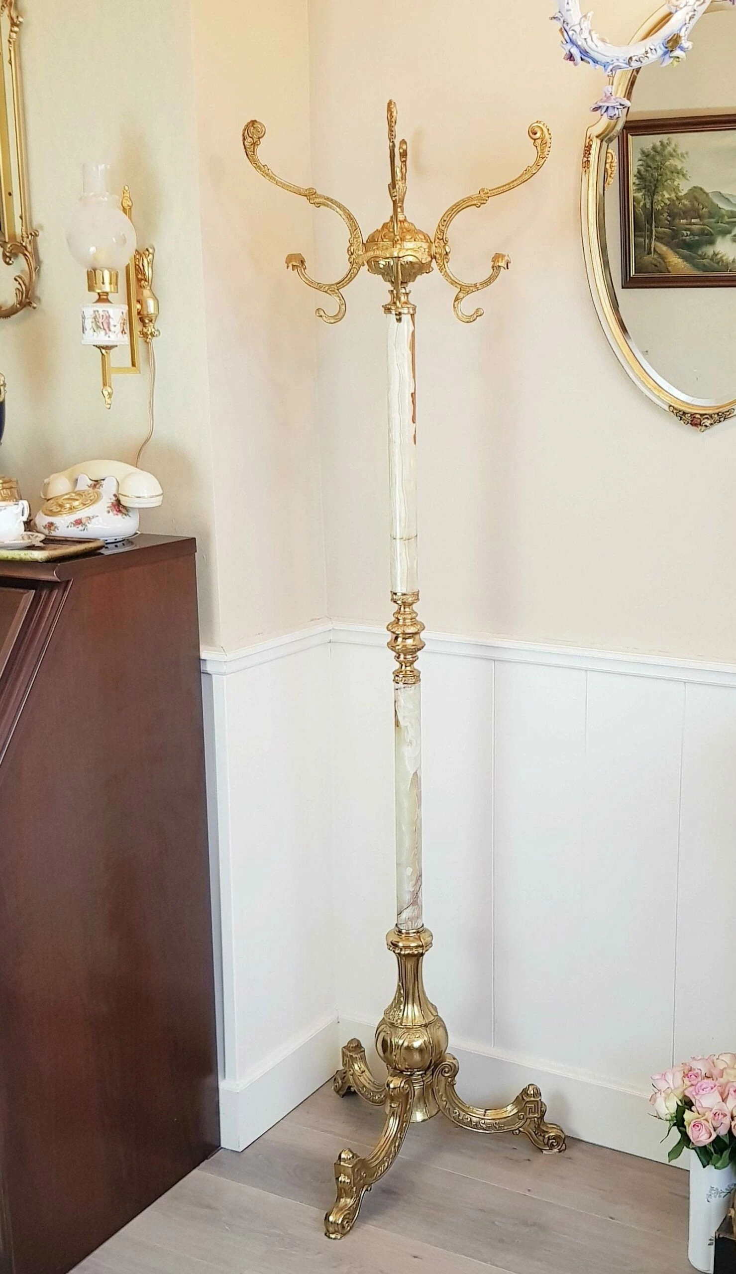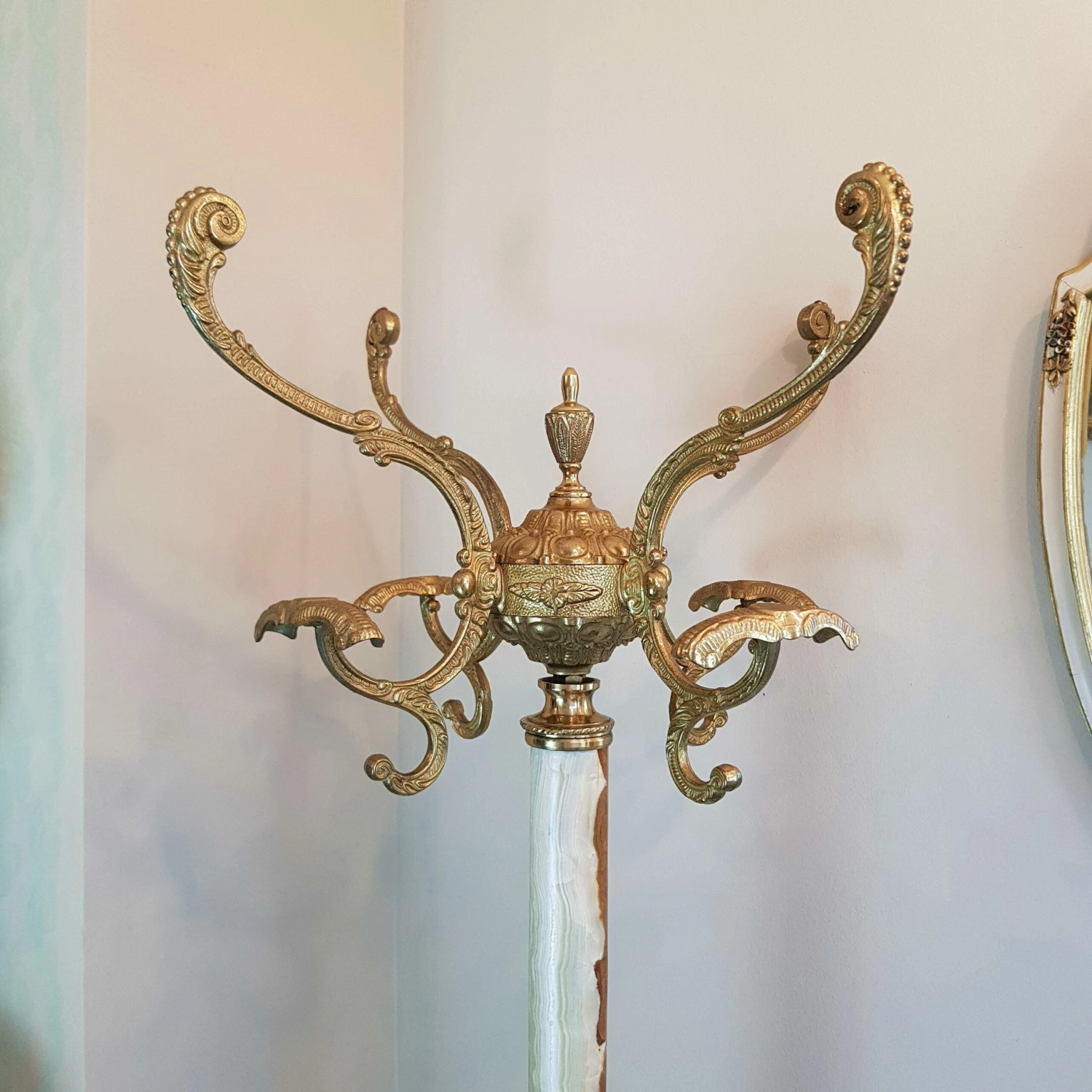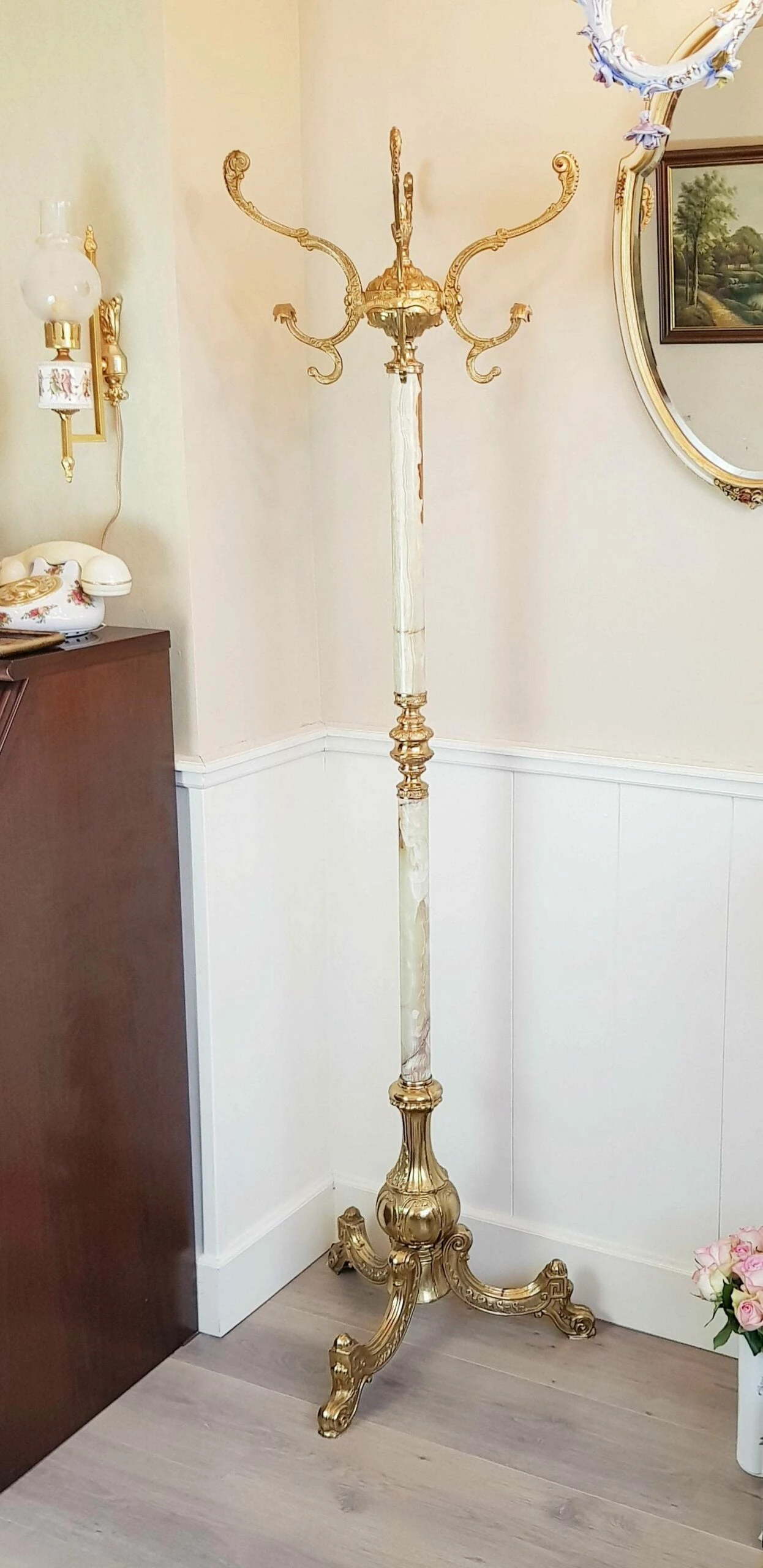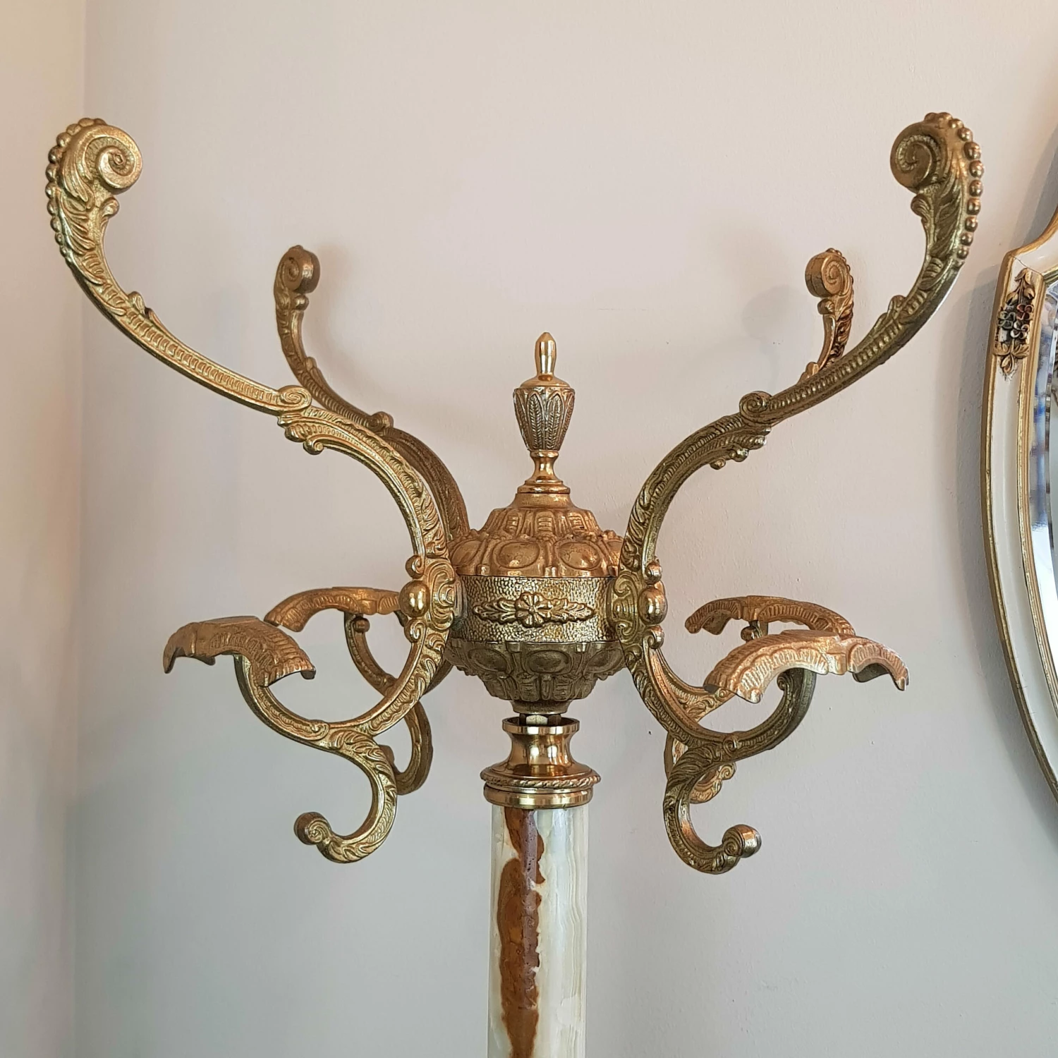 Hollywood Regency style coat-rack is from the ’60s. It has a turnable crown and is standing on 3 feet. Solid marble structure and brass/bronze nice ornaments!!!