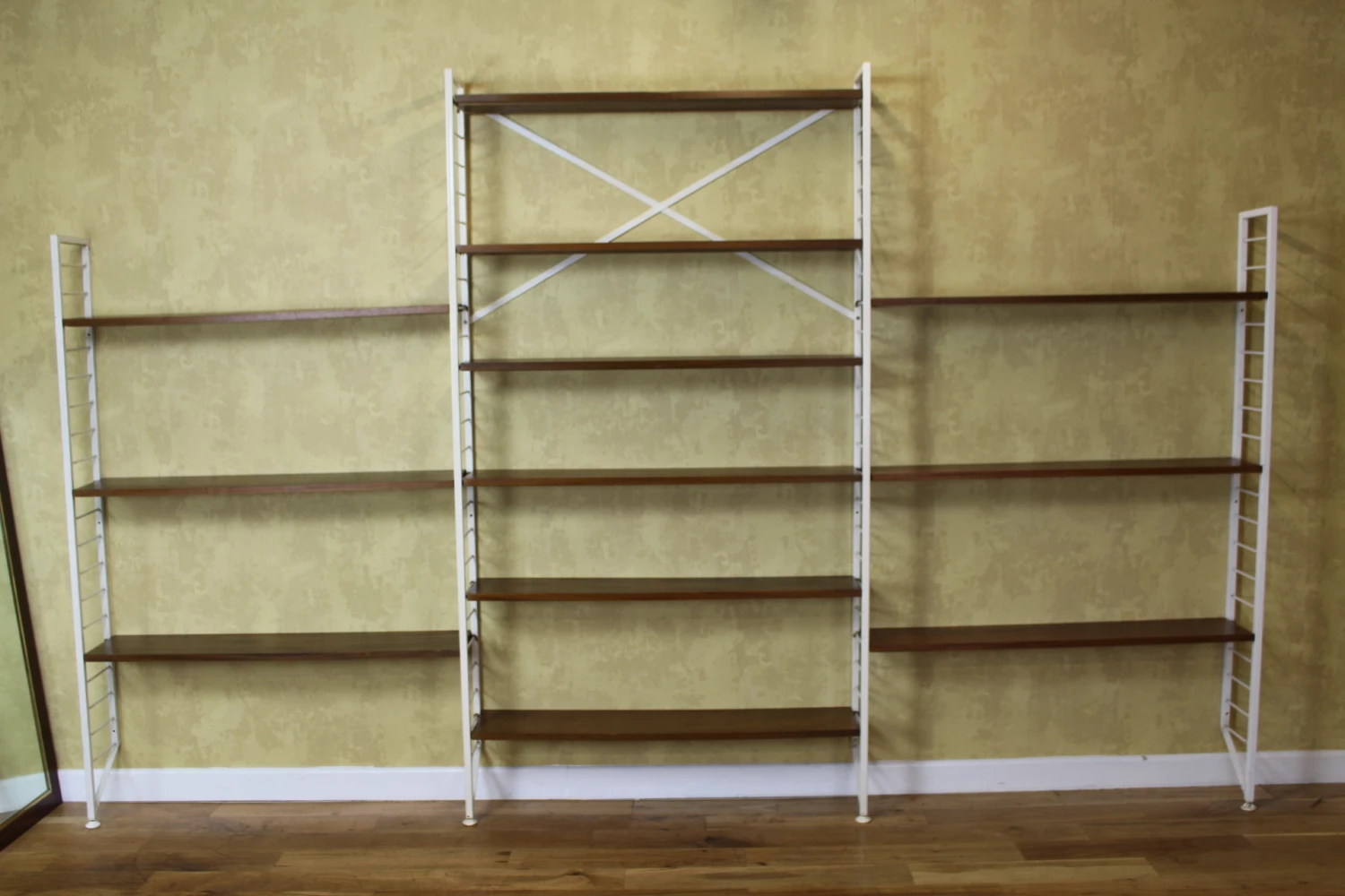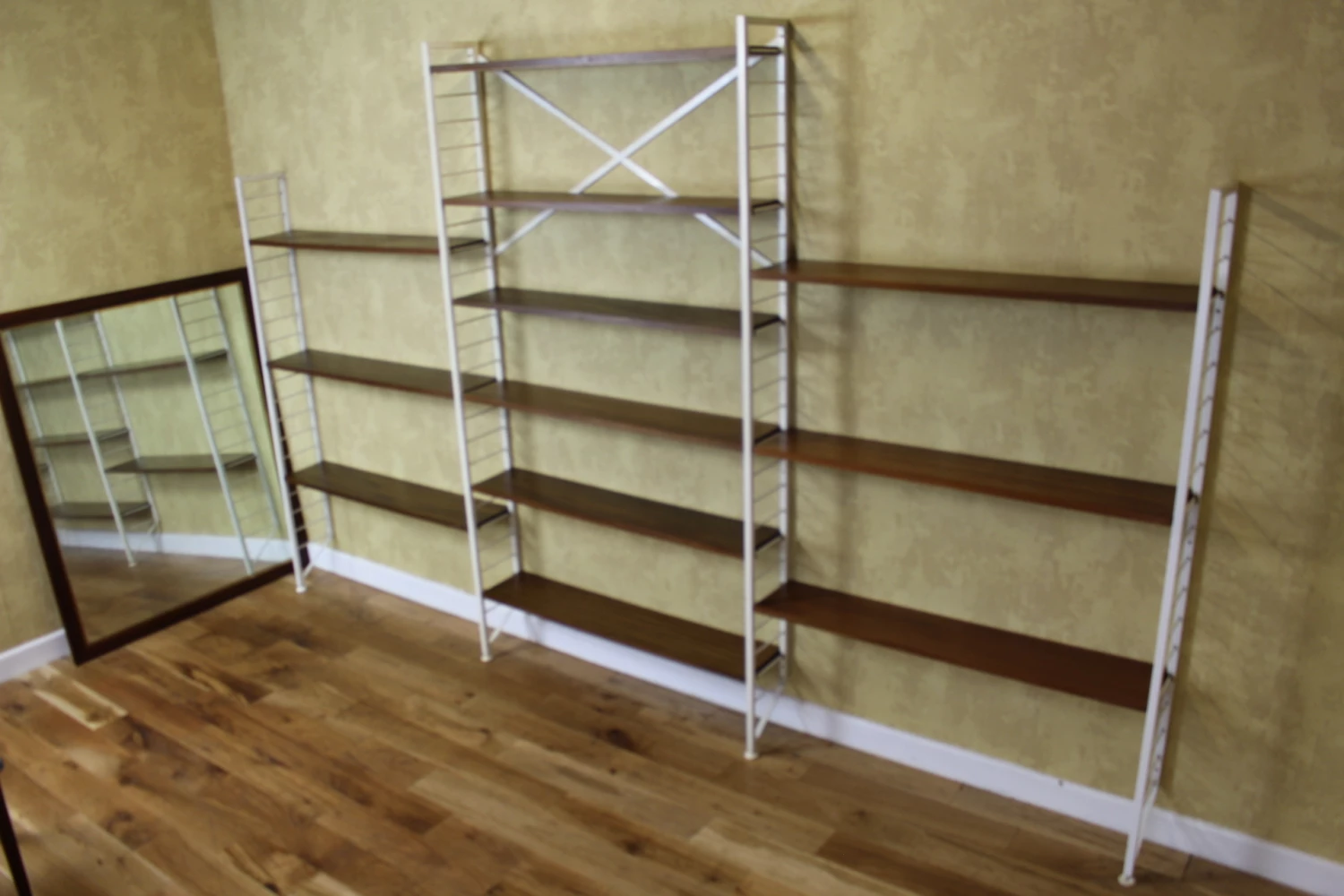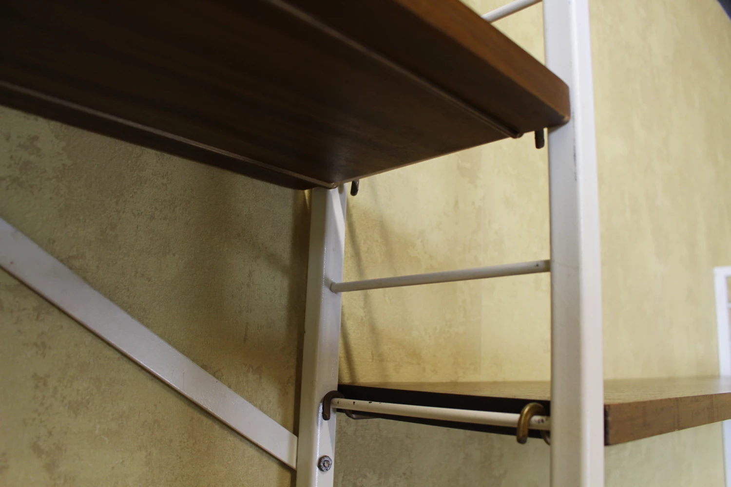 The ladders are the rarer shallow 20cm ones designed for use in libraries both domestic and local authority on a large scale . We’ve seen photographs of 1960’s Public Libraries fully fitted with Ladderax shelving like this . In private houses its usually against a wall , but it was designed to be freestanding also .