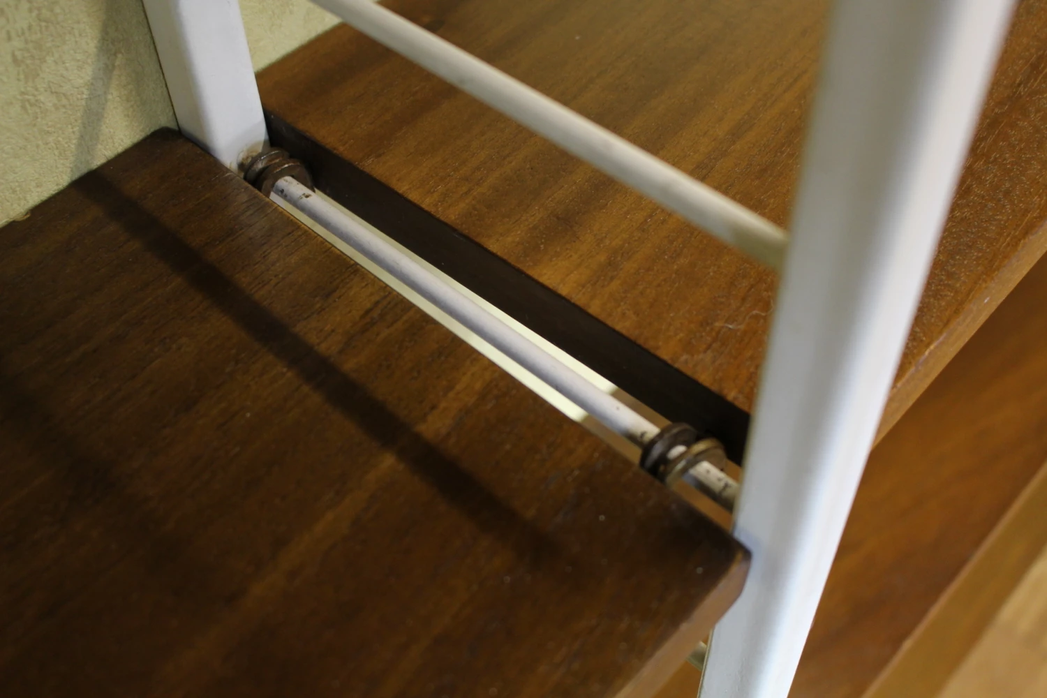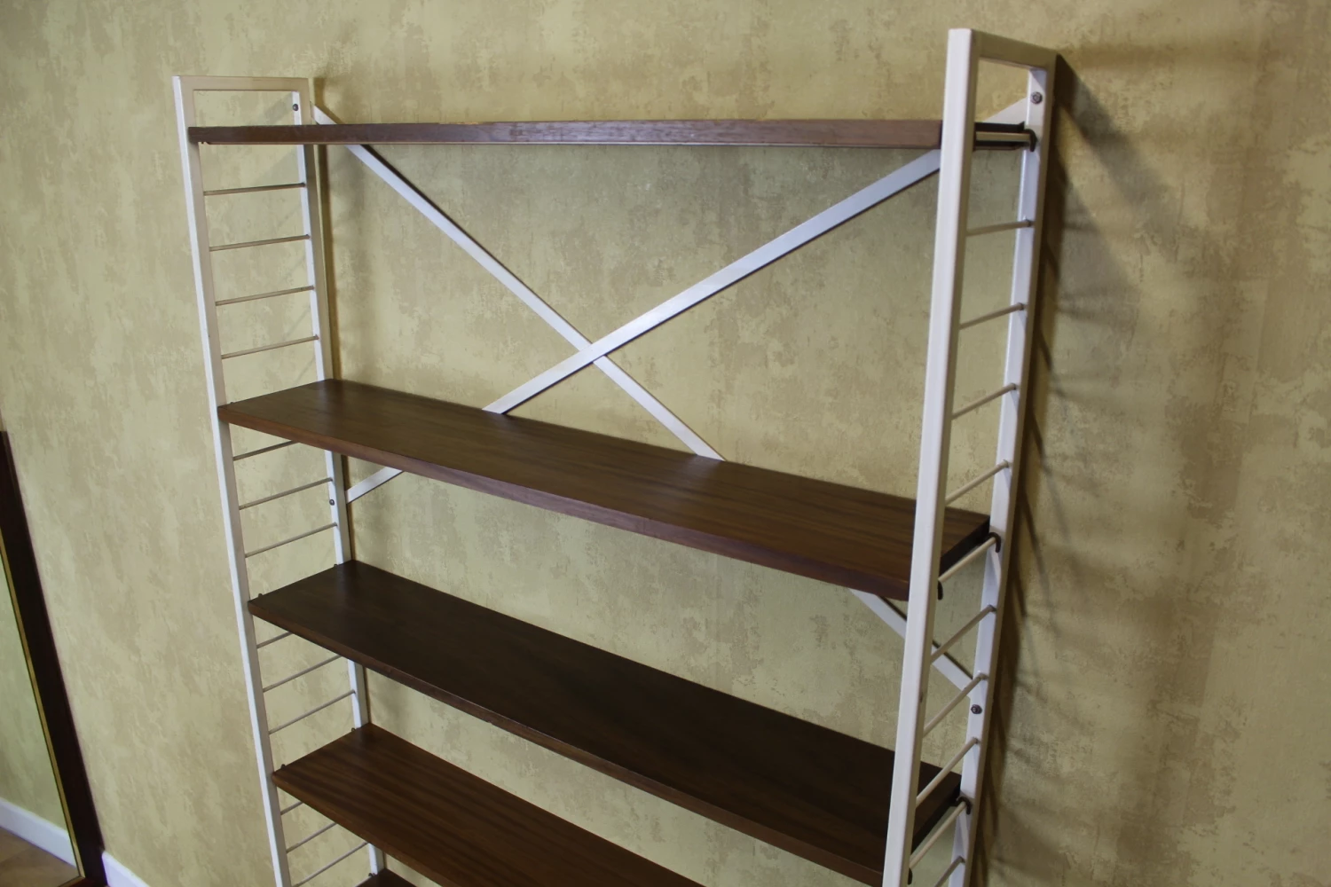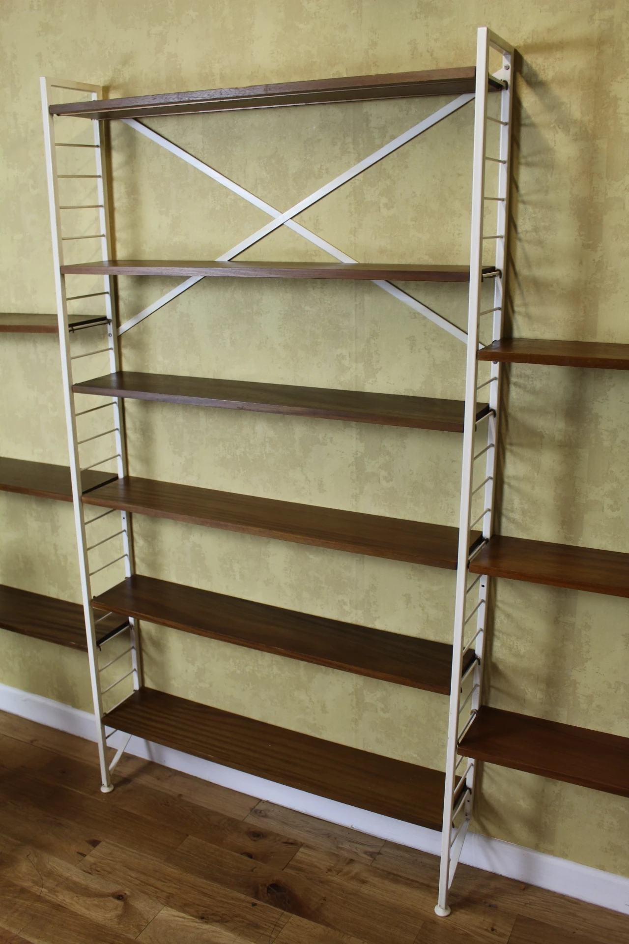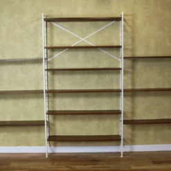 The ladders are the rarer shallow 20cm ones designed for use in libraries both domestic and local authority on a large scale . We’ve seen photographs of 1960’s Public Libraries fully fitted with Ladderax shelving like this . In private houses its usually against a wall , but it was designed to be freestanding also .