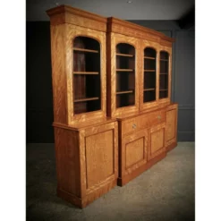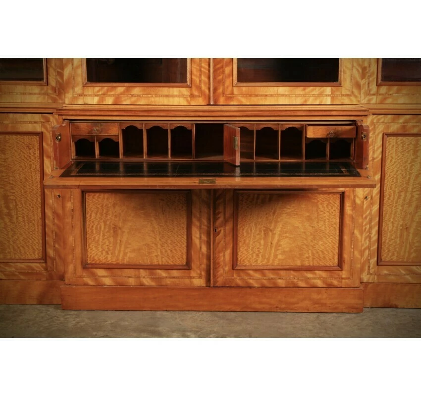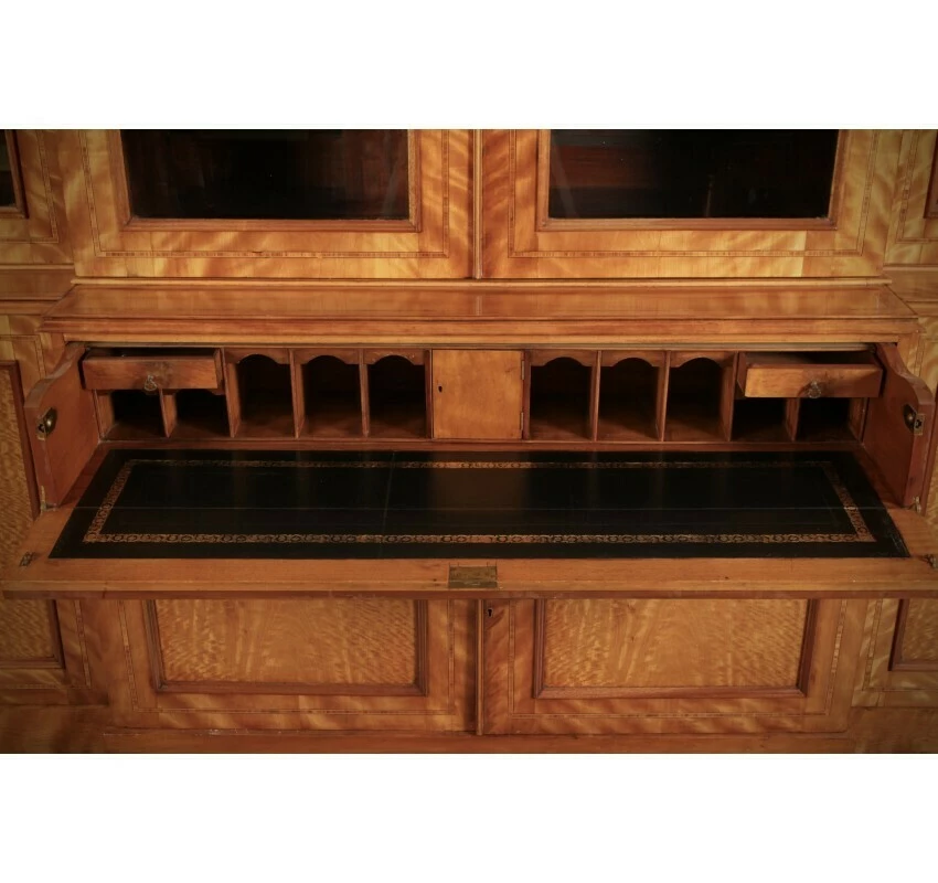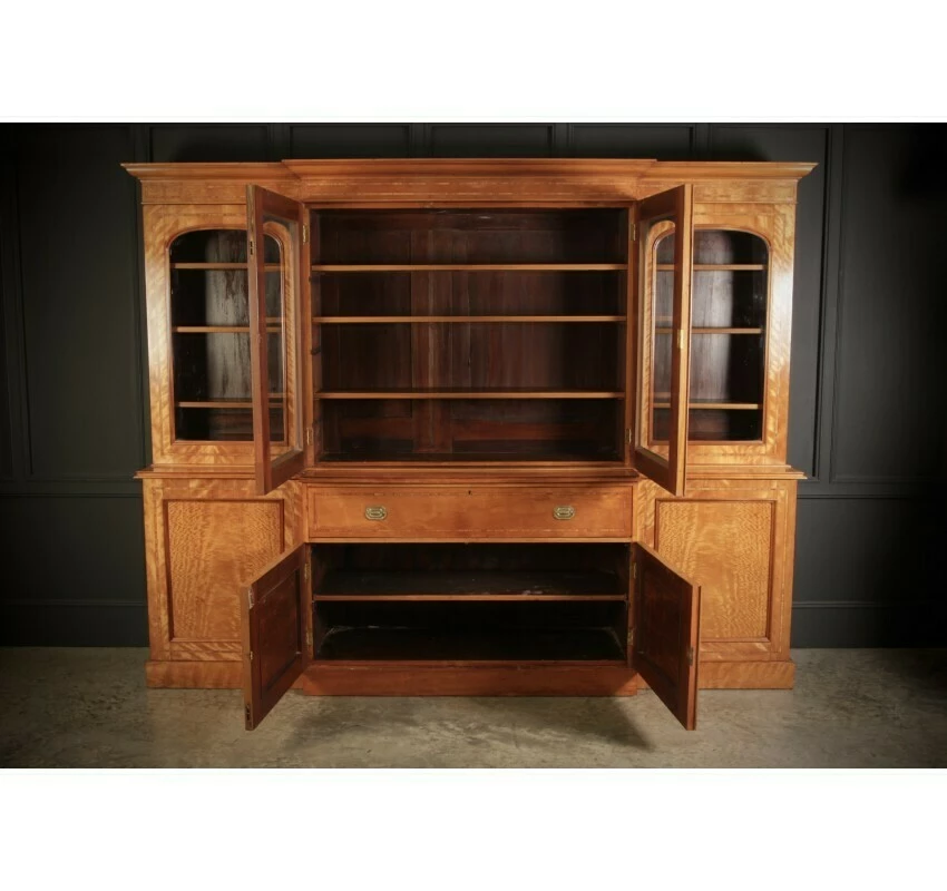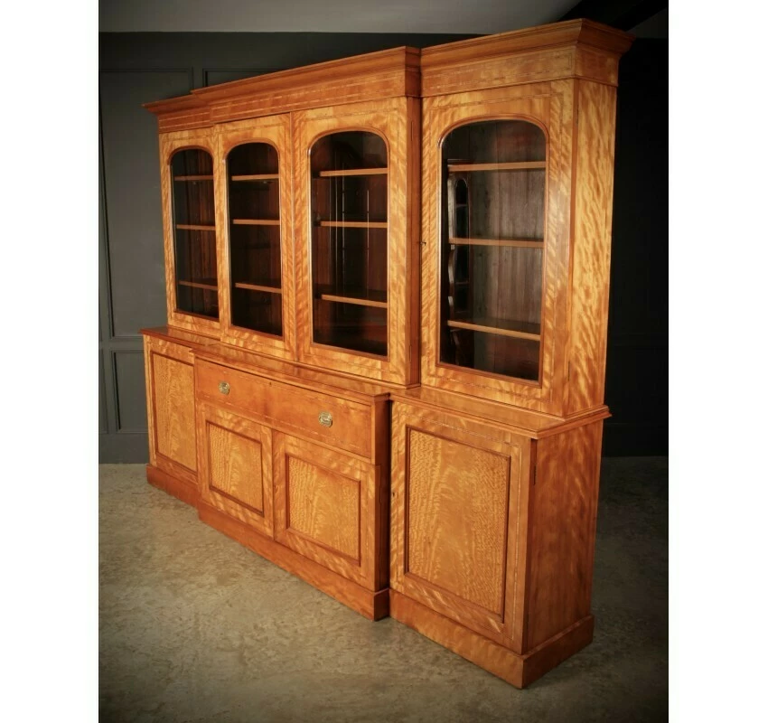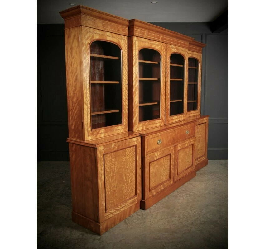 This beautiful quality, substantial satinwood bookcase, has a breakfront shape with a moulded top cornice above 4 arched panel glazed doors. With working locks and key.