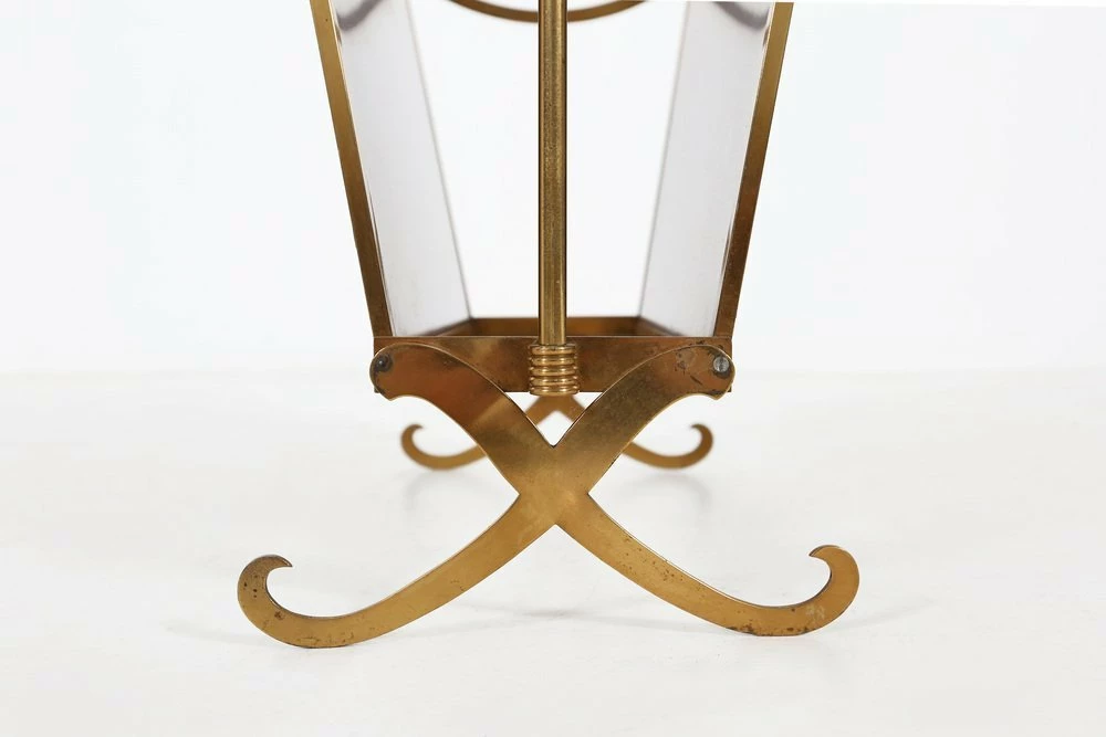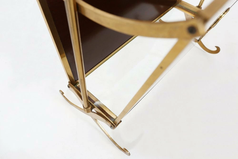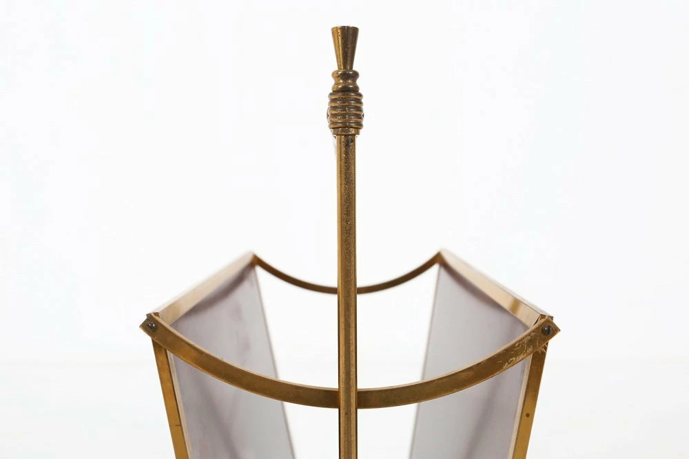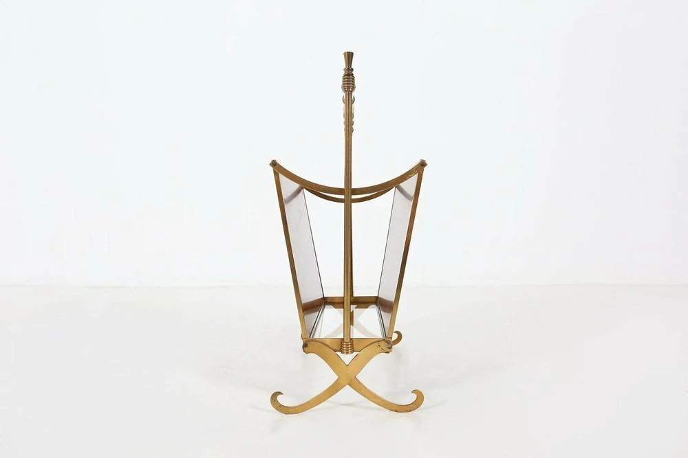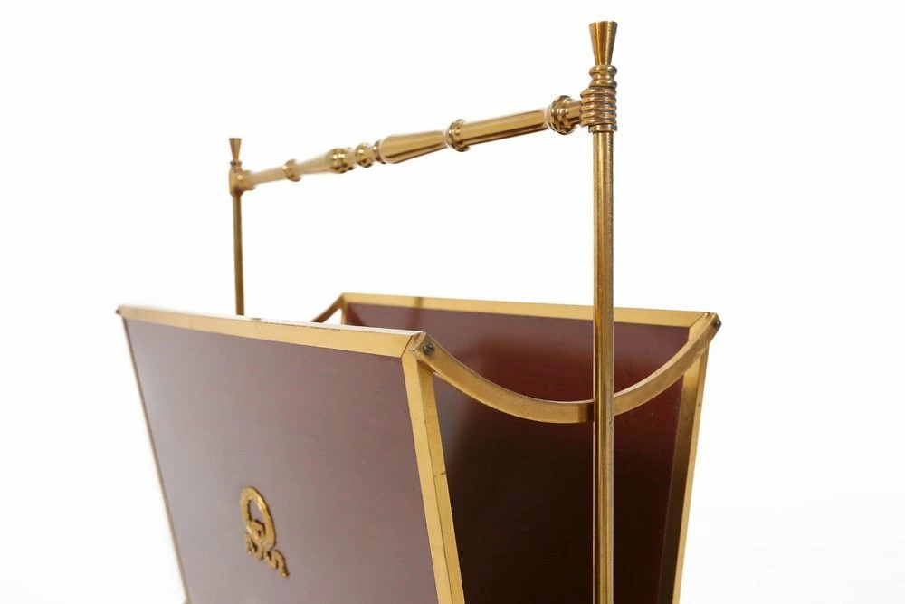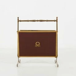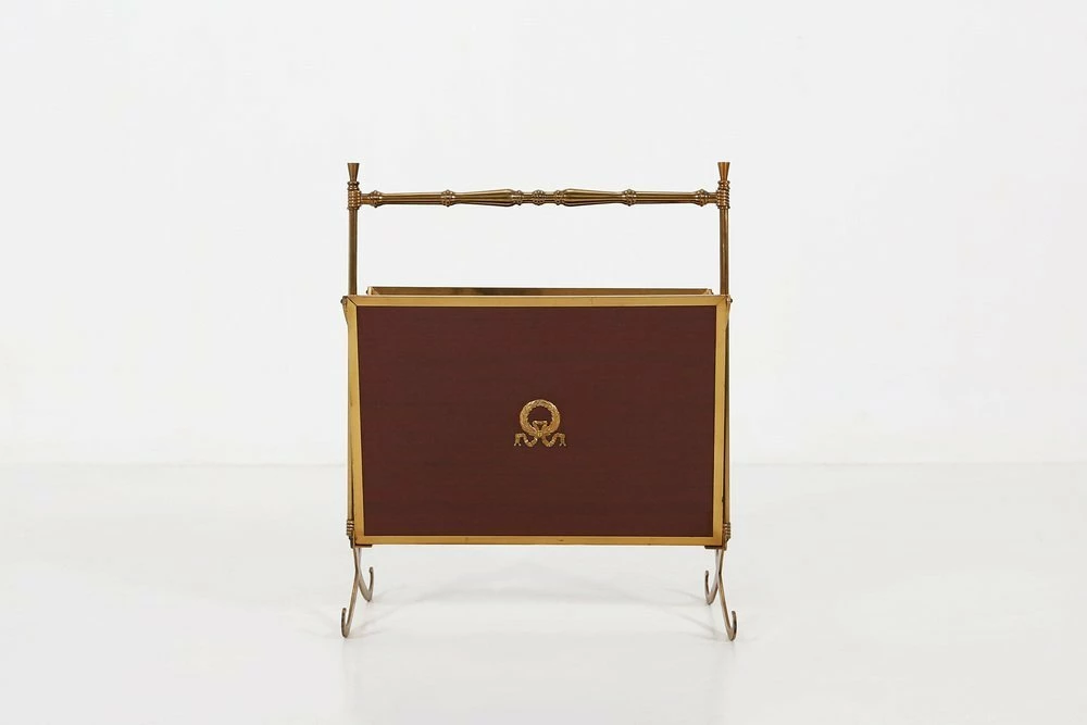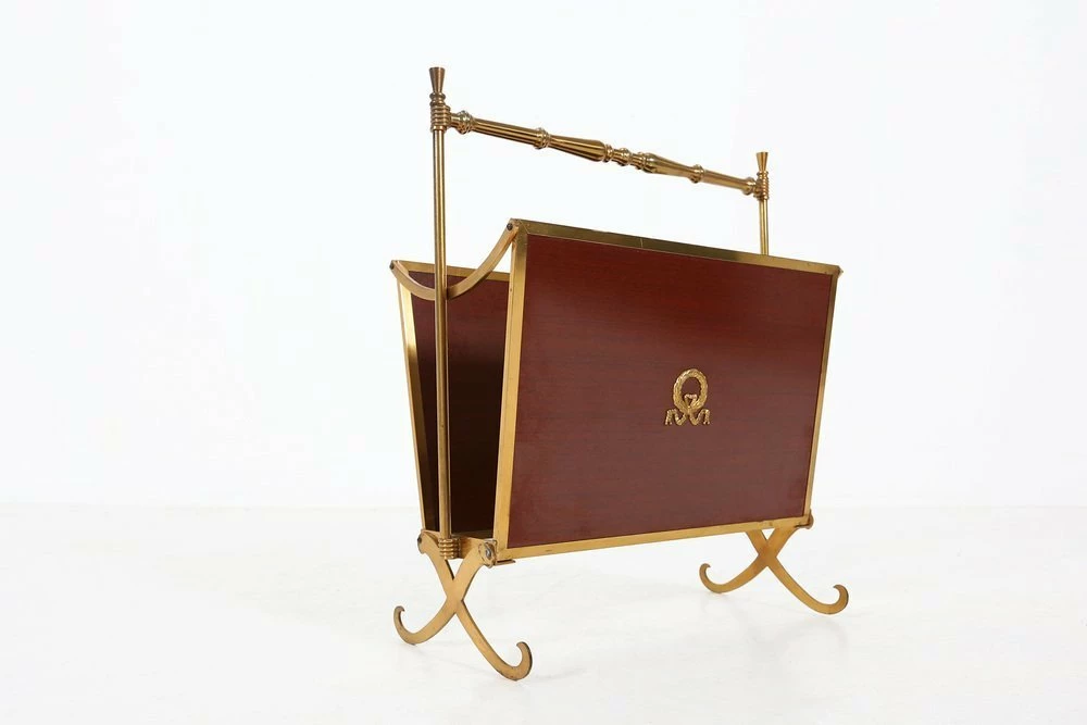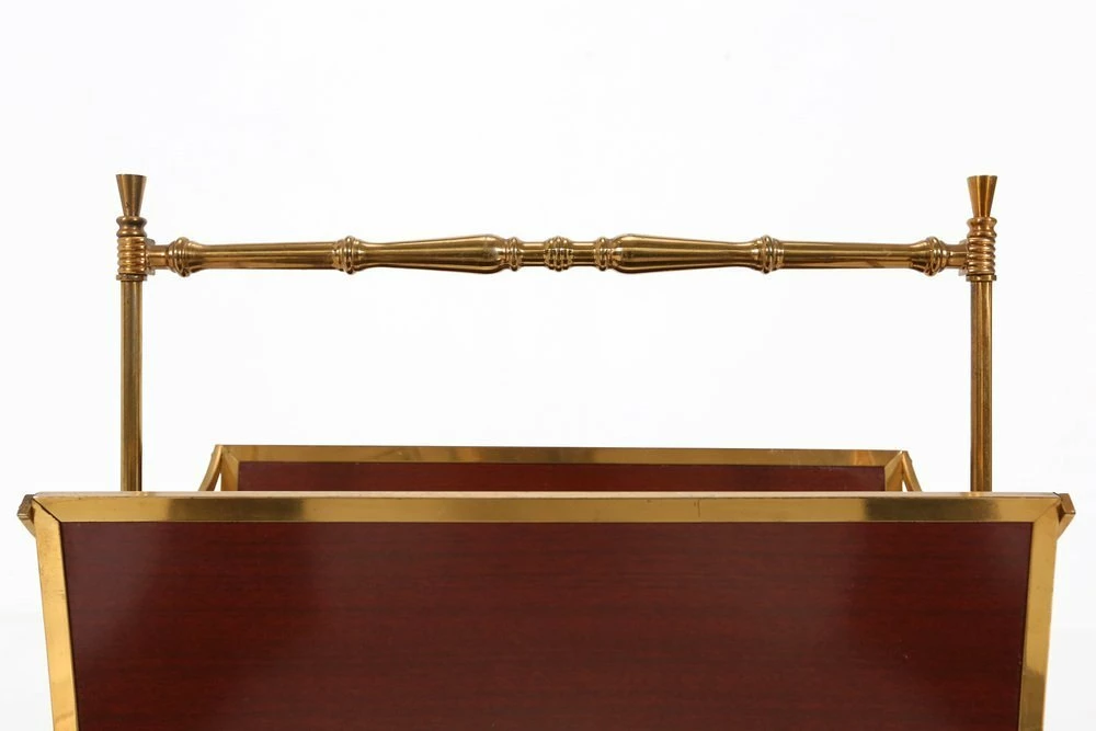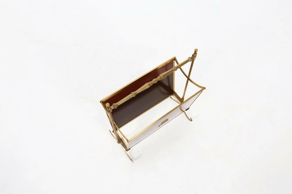 Fifties magazine holder made of a metal base, wooden sides and glass base.