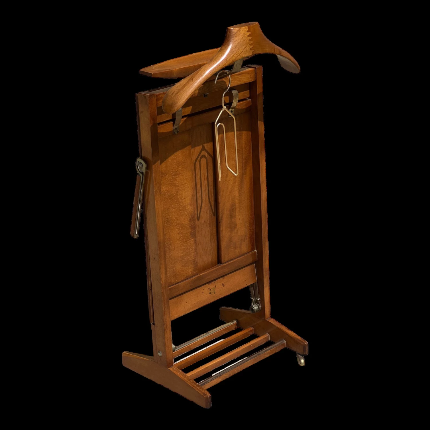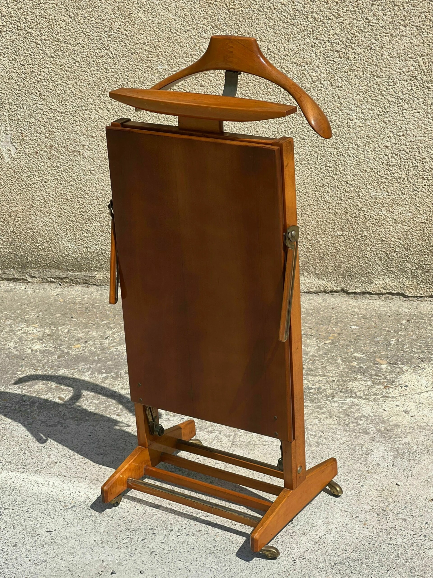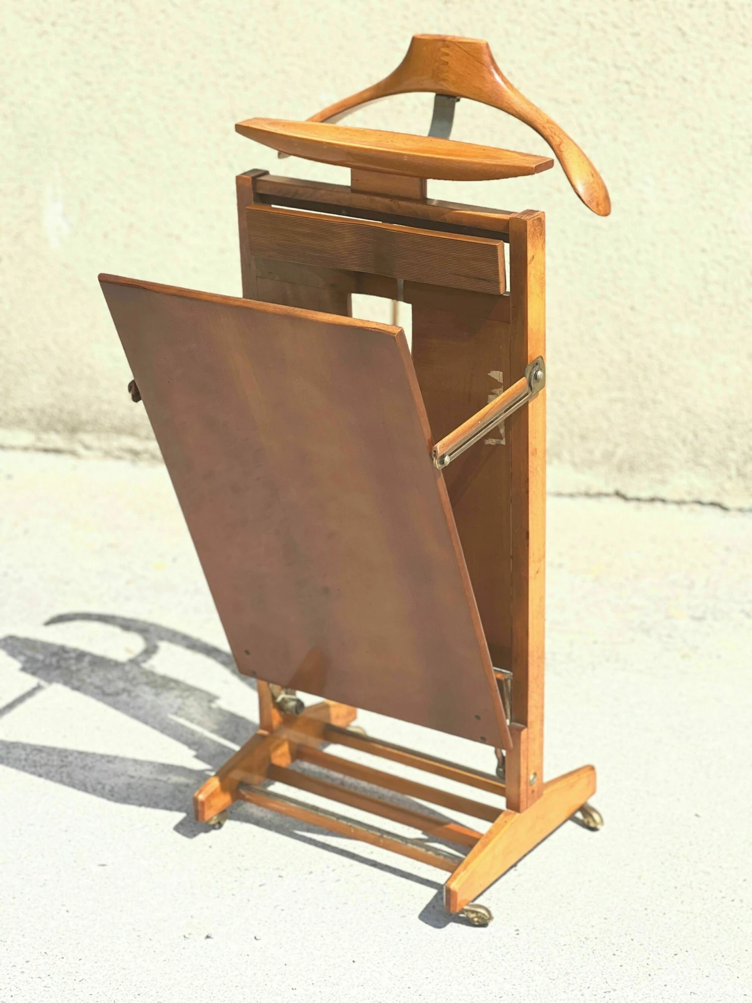 Mid-century Italian valet with trouser press, storage compartment, 1950 fratelli reguitti in signed solid wood and with wheels.