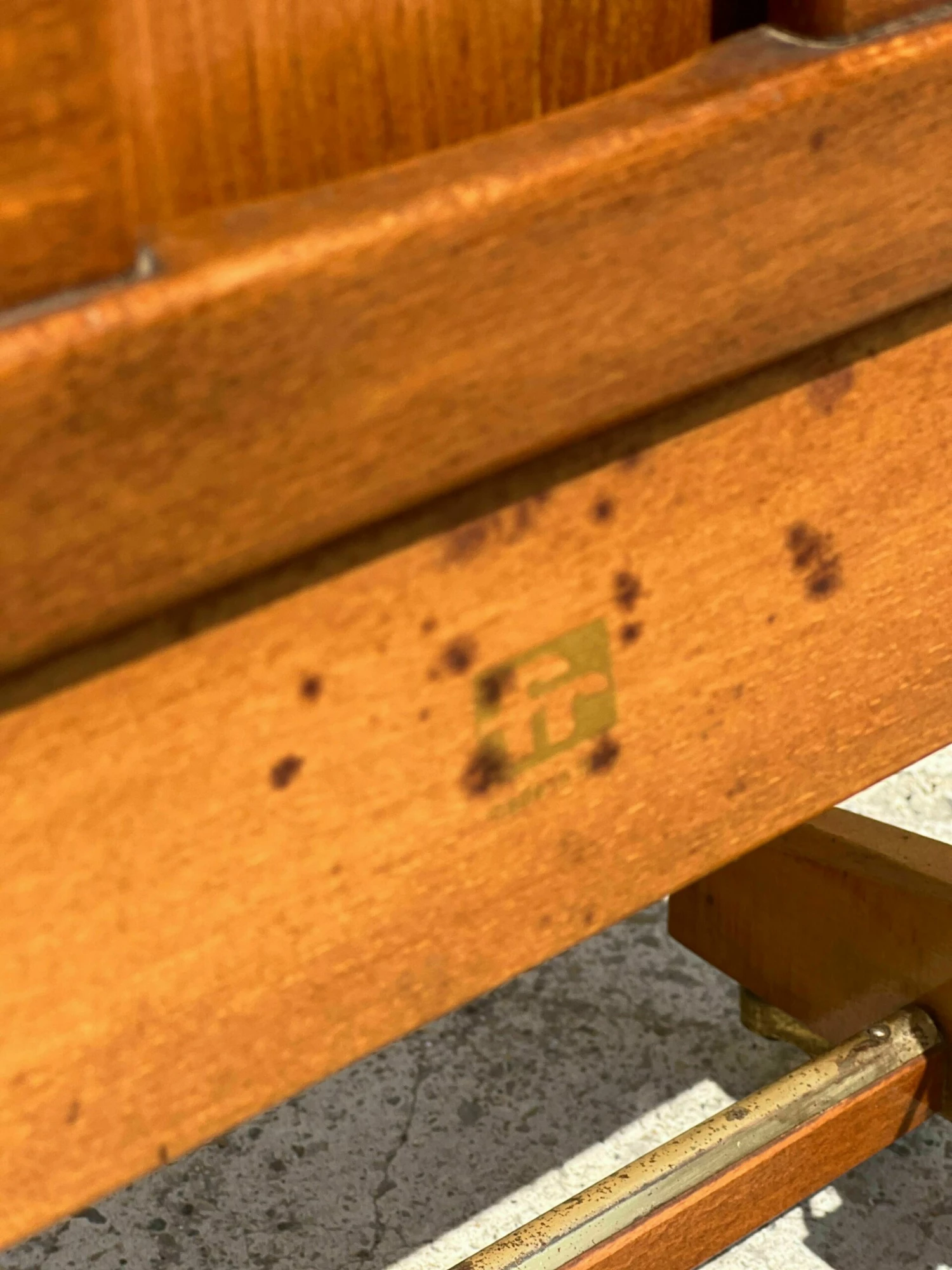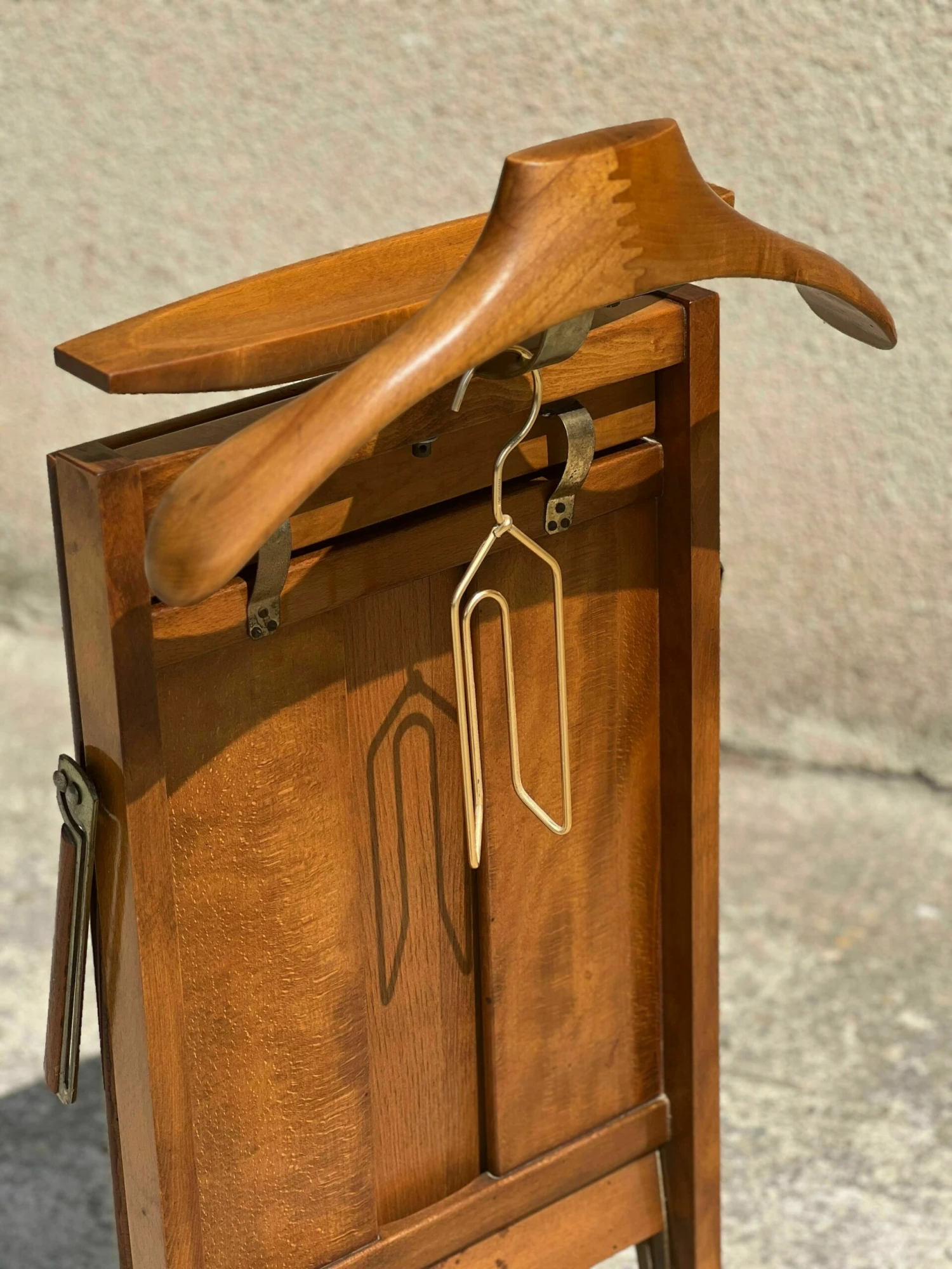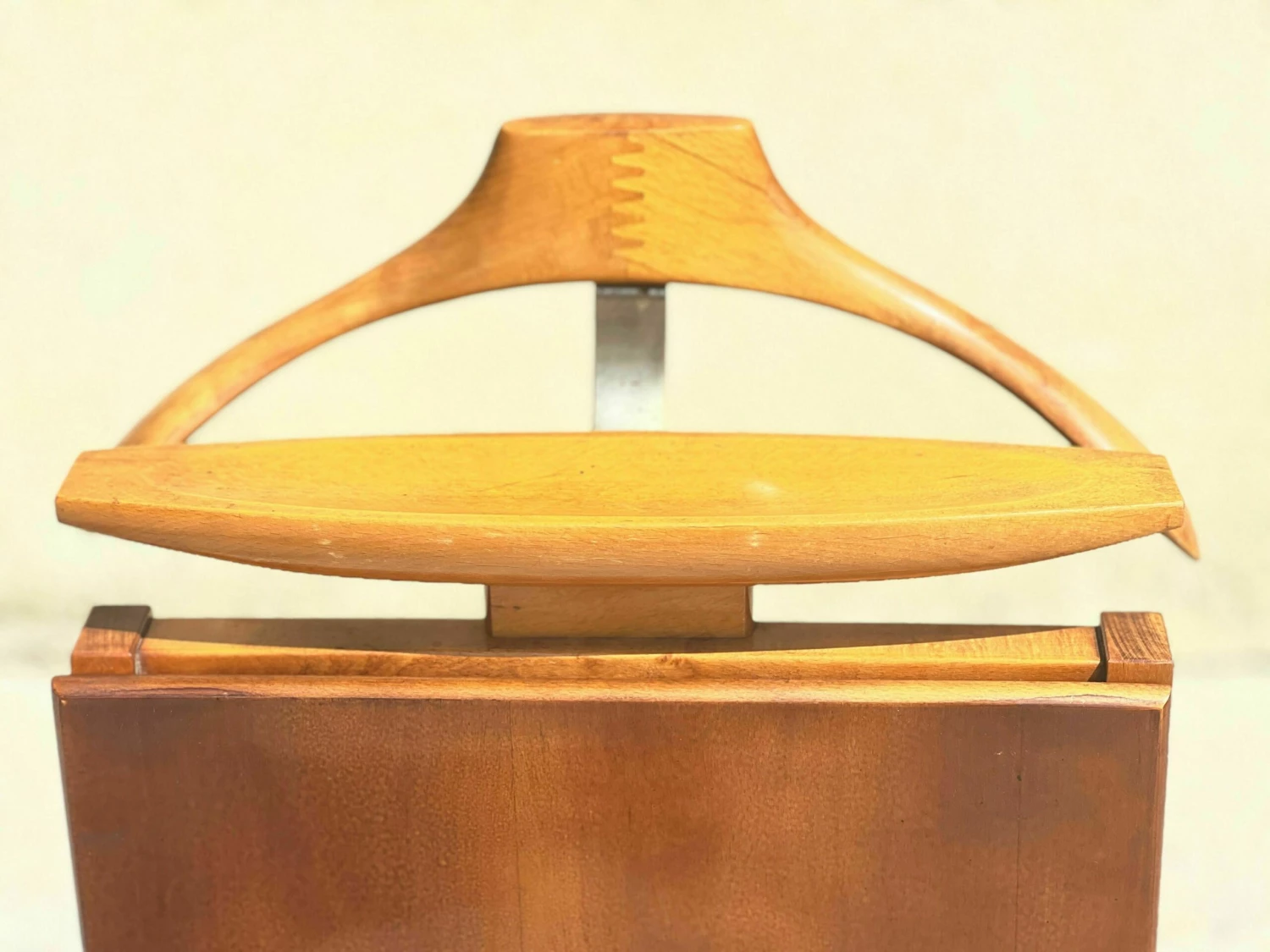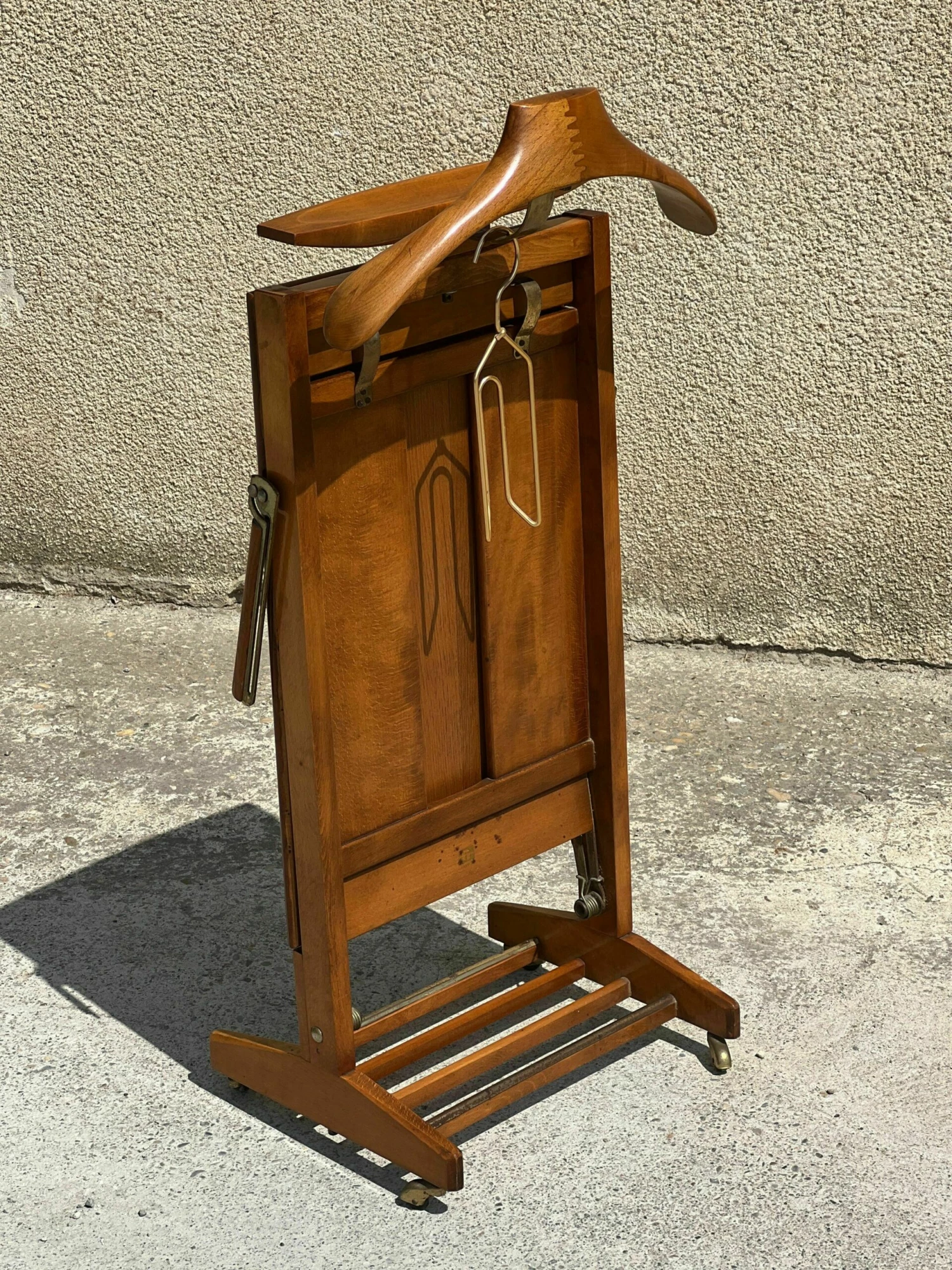 Mid-century Italian valet with trouser press, storage compartment, 1950 fratelli reguitti in signed solid wood and with wheels.