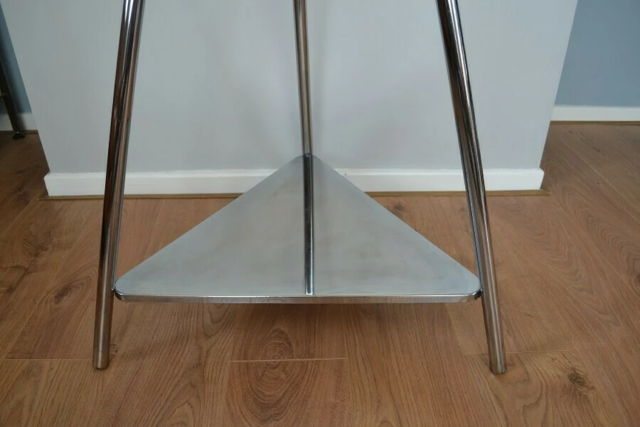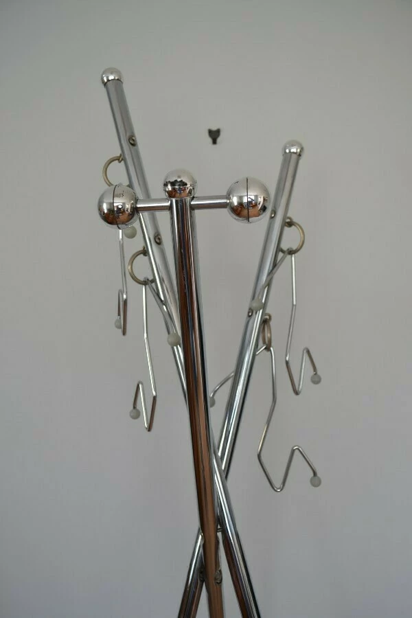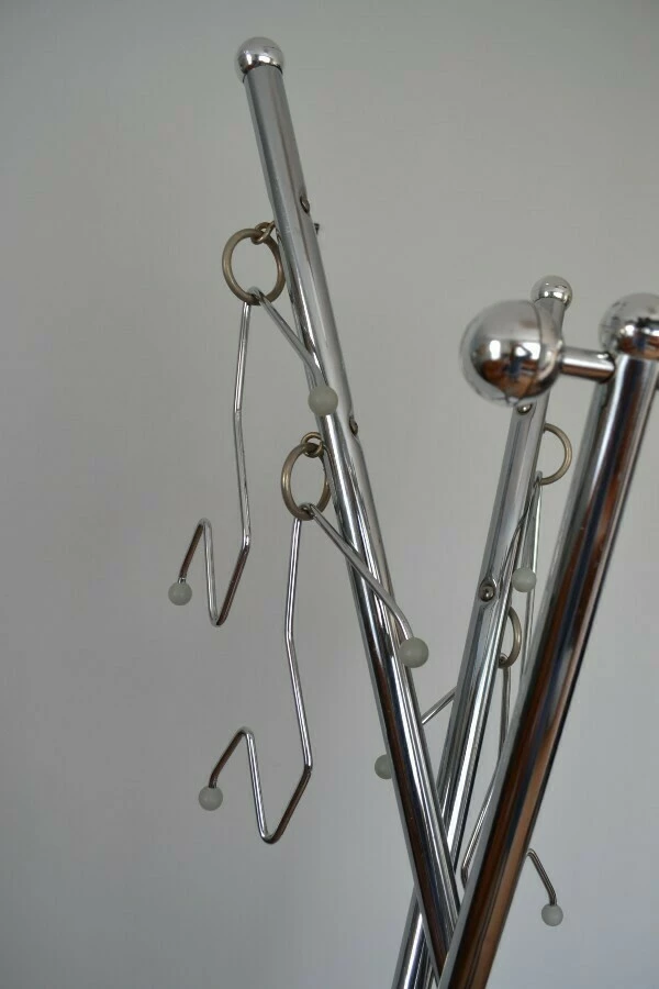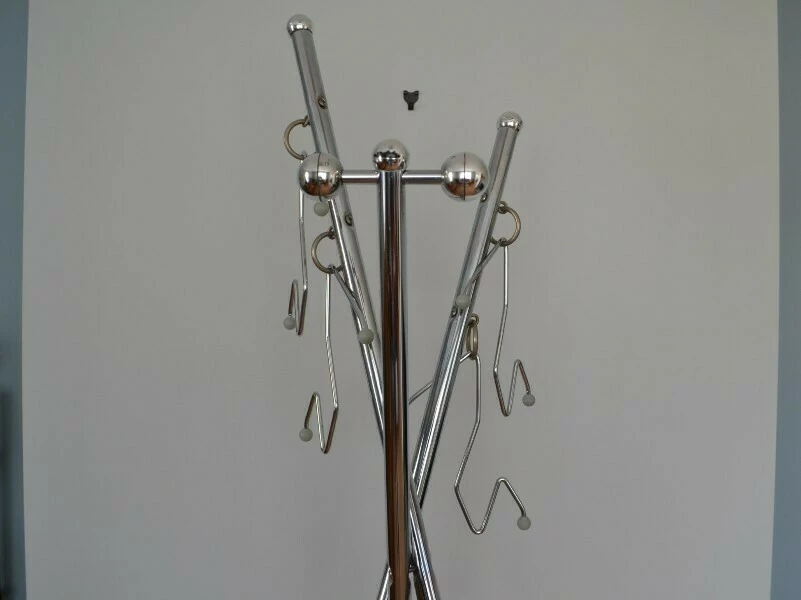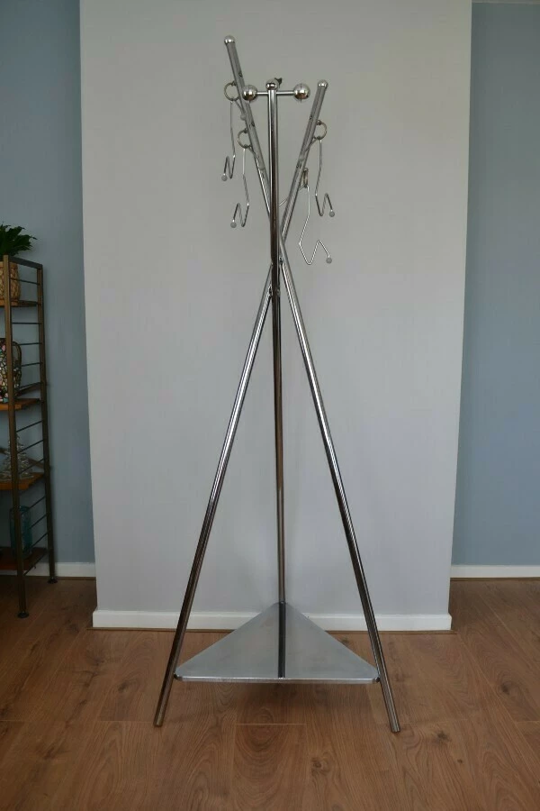 A stylish mid century chrome coat stand with triangular chrome base and three chrome tubular sections that fix to each other and hooksthat hang from rings the ball ends are plastic . Measures height 6 ft base 22 in