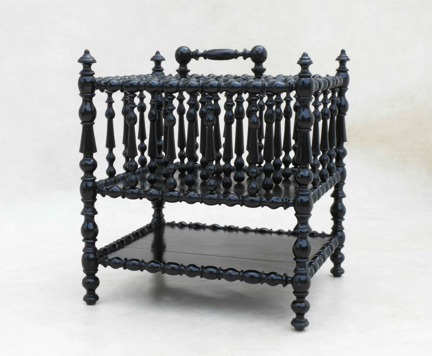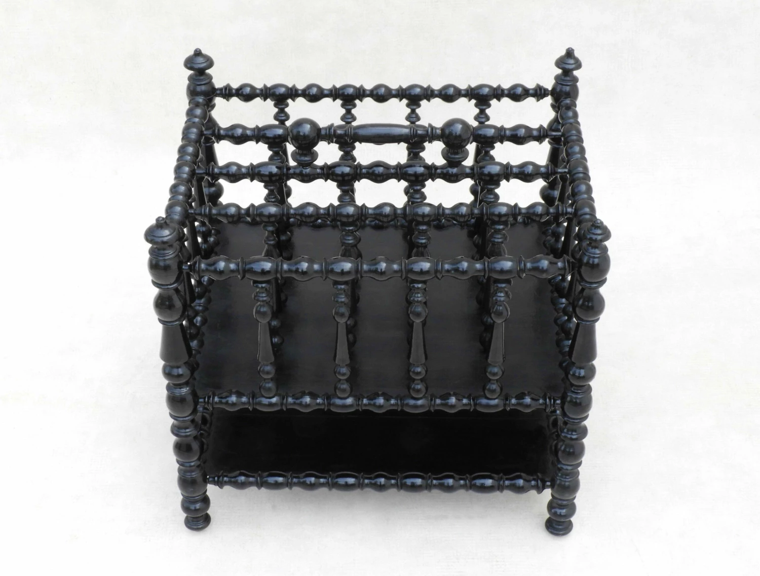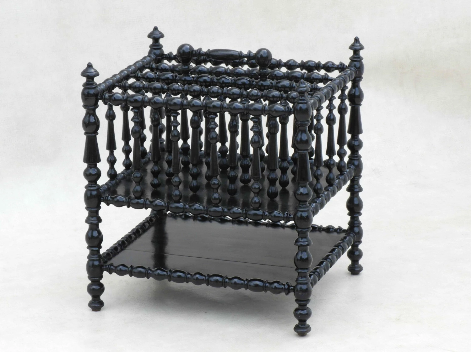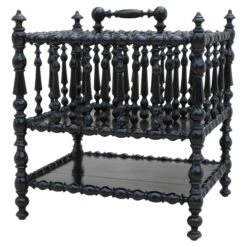 Stylish French Napoleon III ‘porte revue’ magazine rack or canterbury. Black lacquered and beautifully turned wood, this