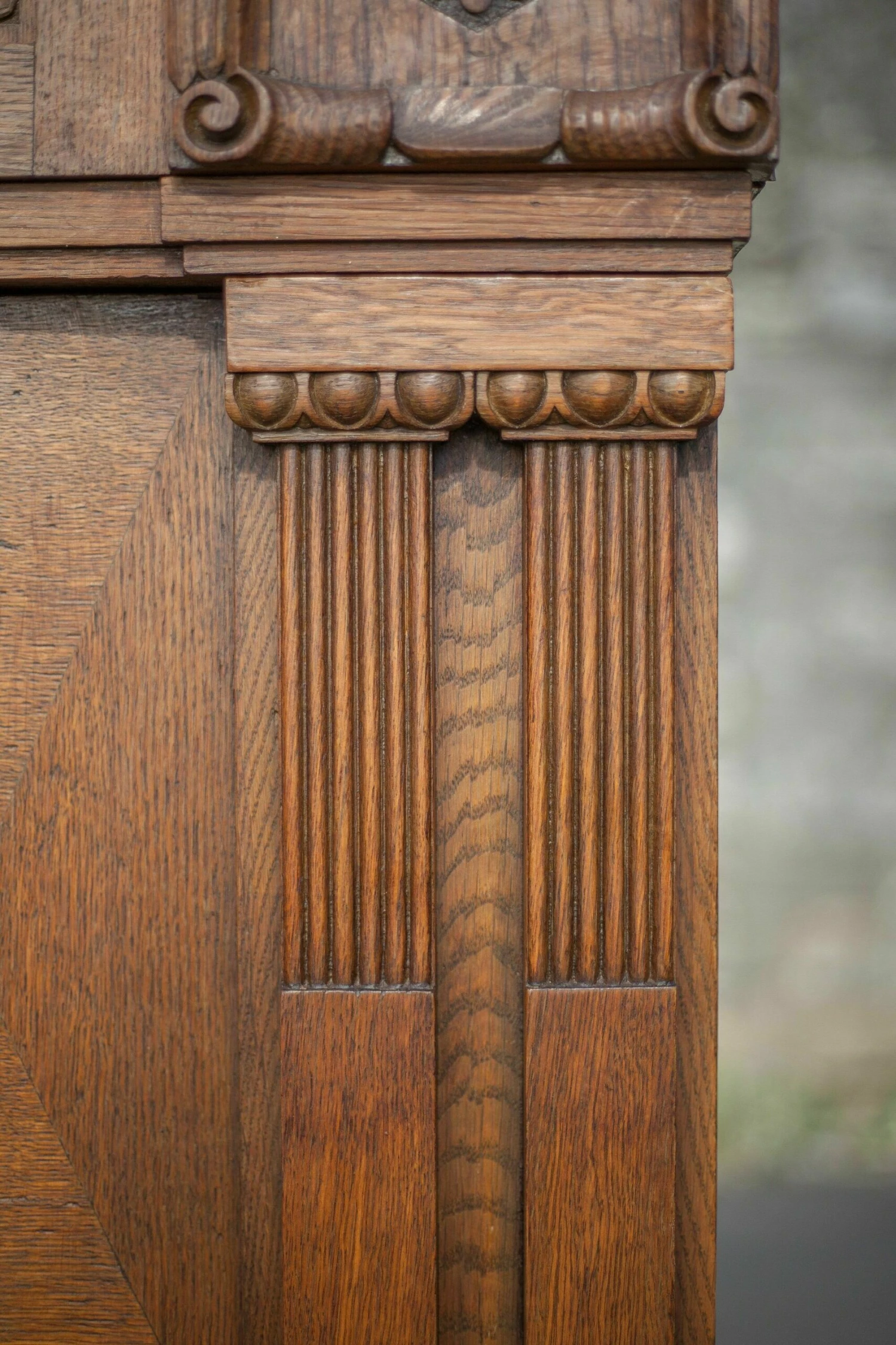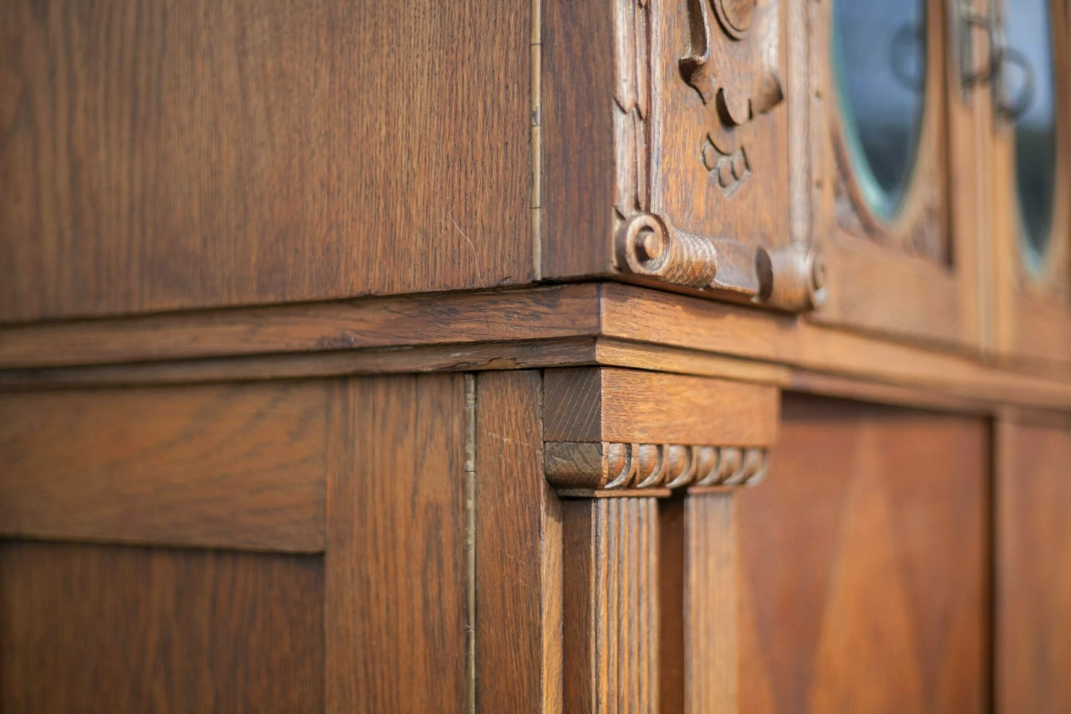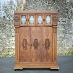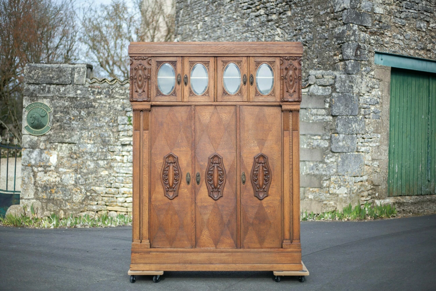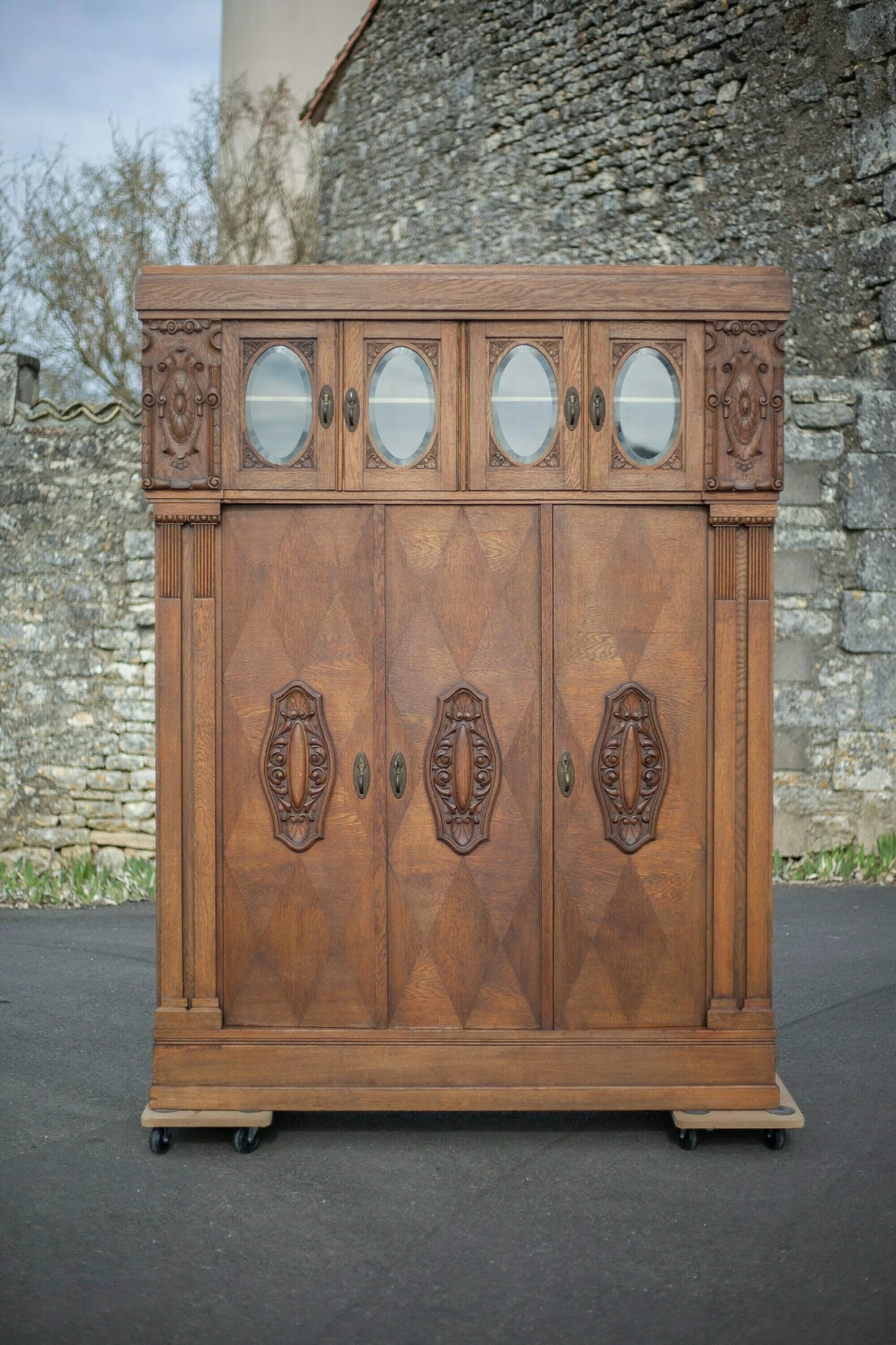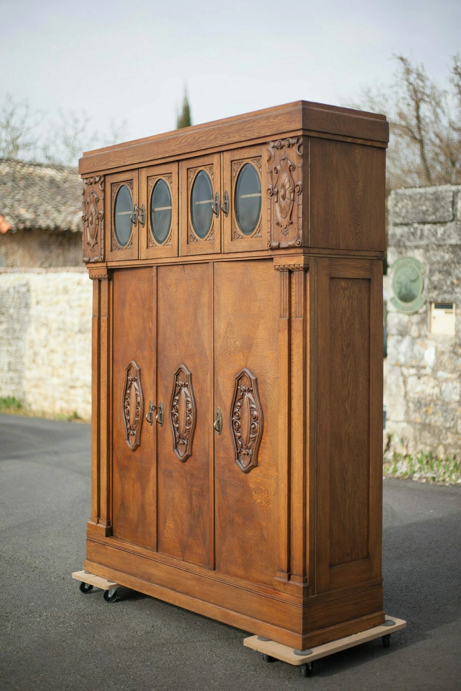 Antique carved wood 3-door bookcase cabinet, beveled porthole glass bookcase.