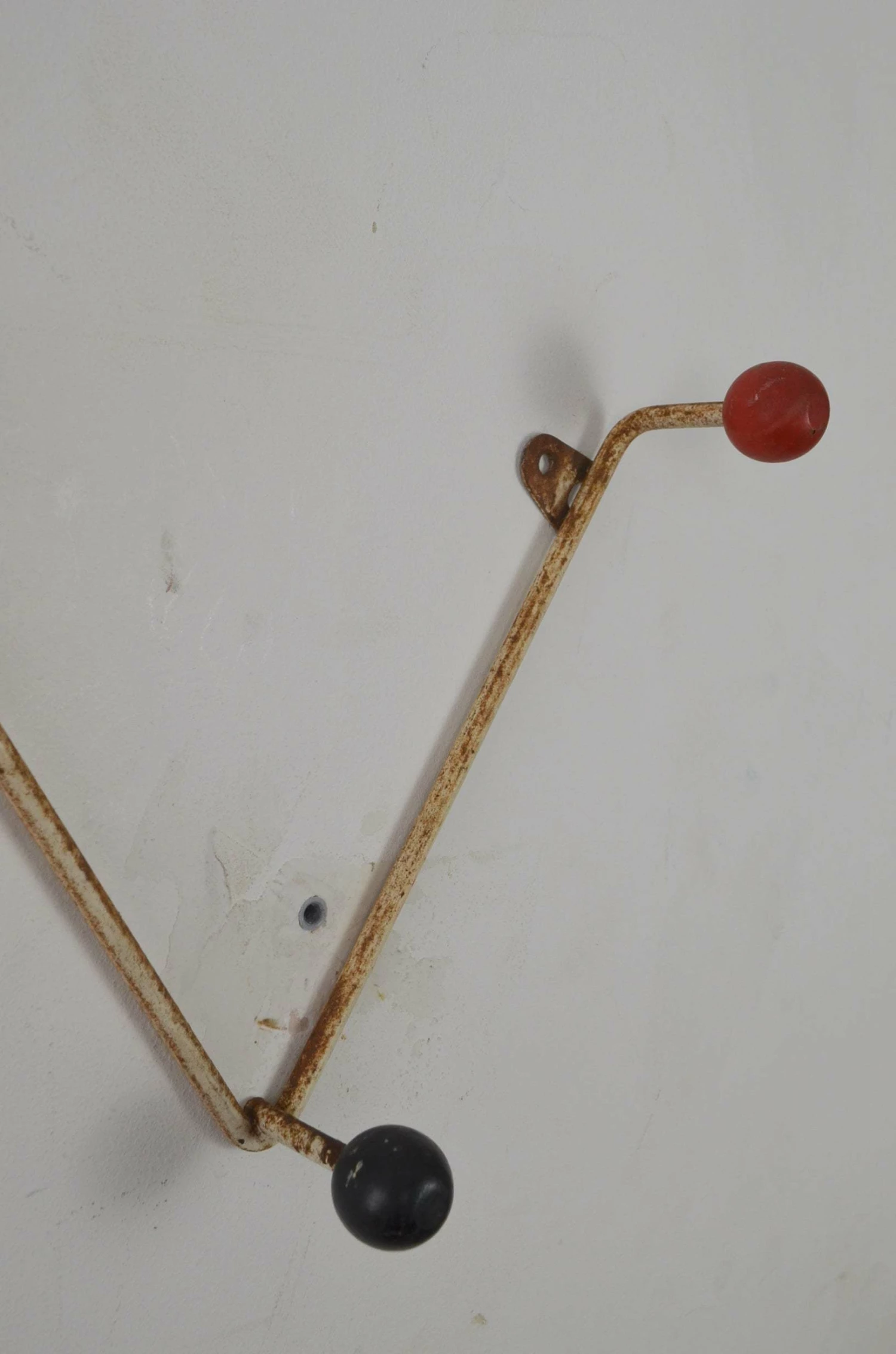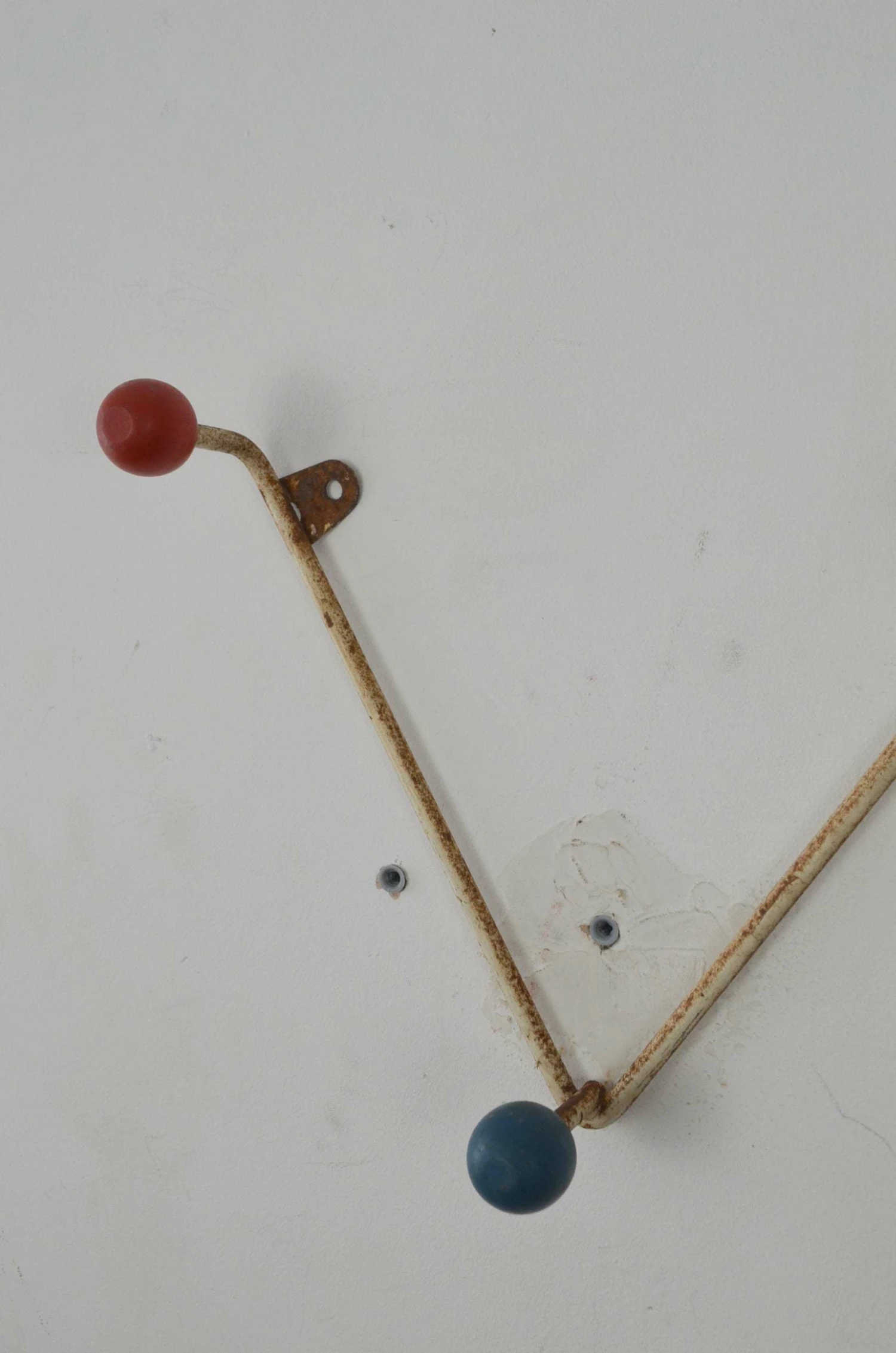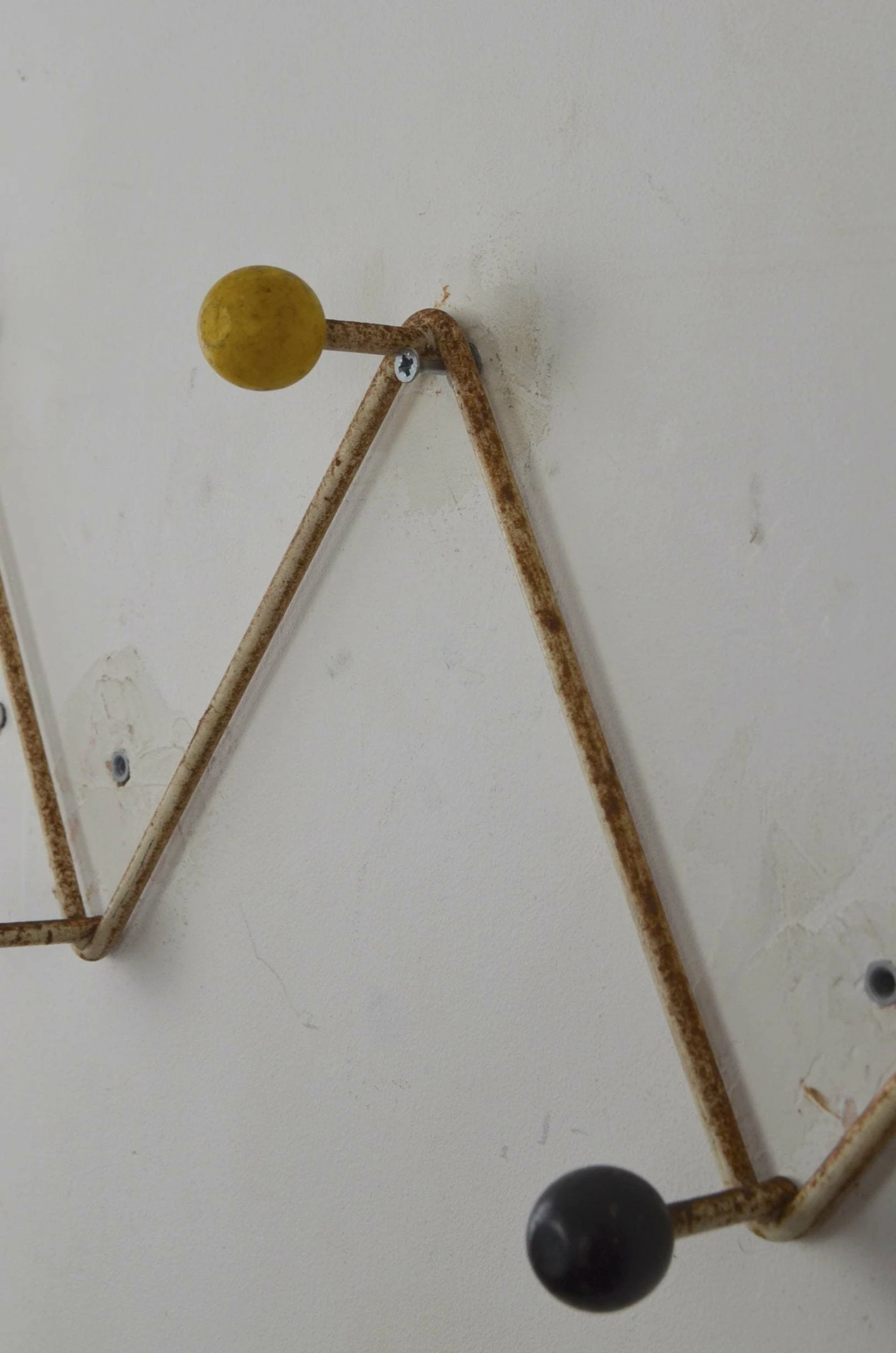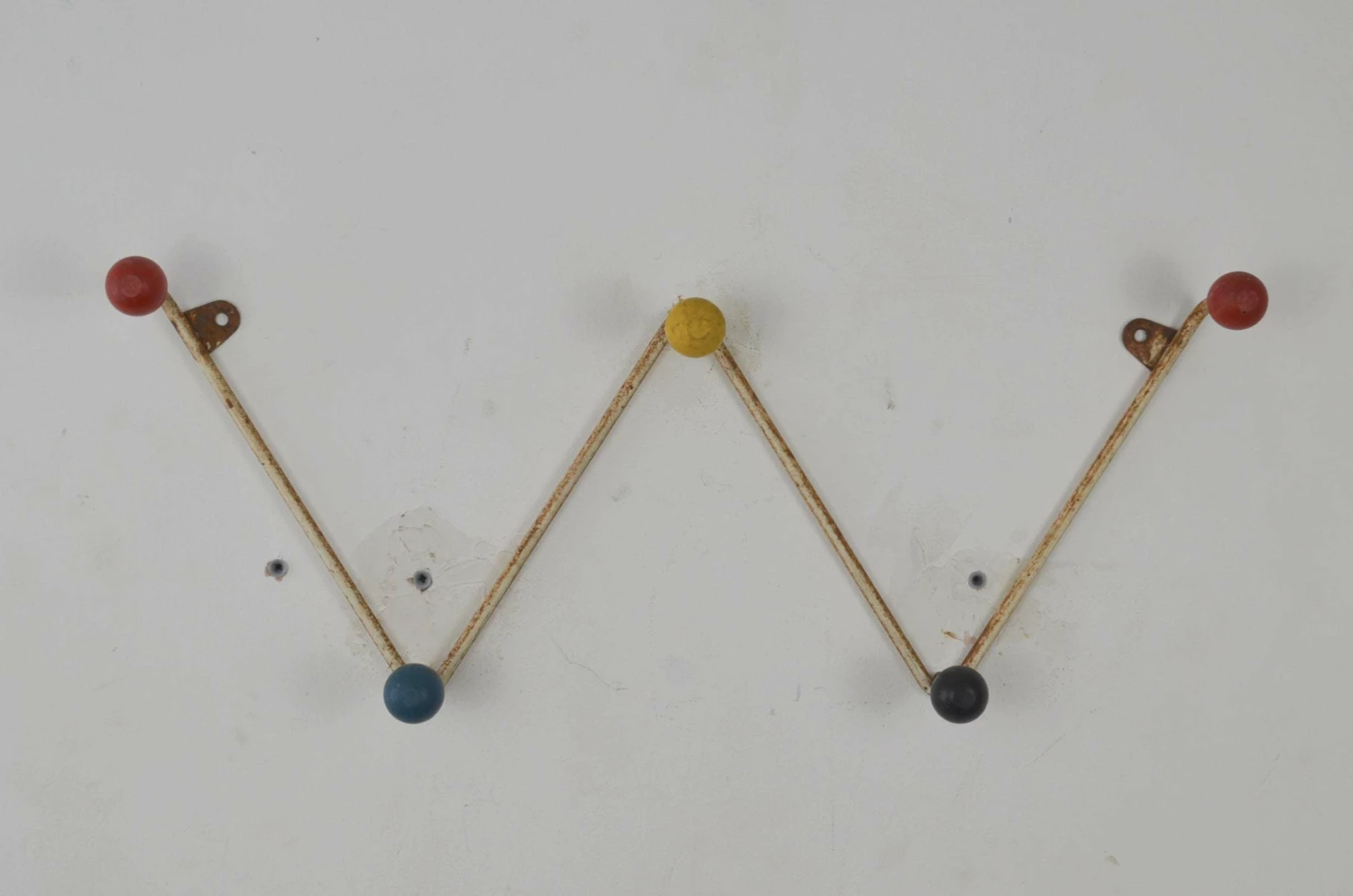 Atomic mid century coat/hat wall mounted rack with fixing points. Original multi coloured ball hangers on a white wire fame.