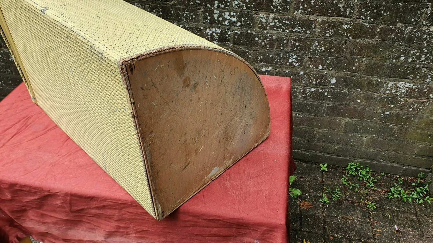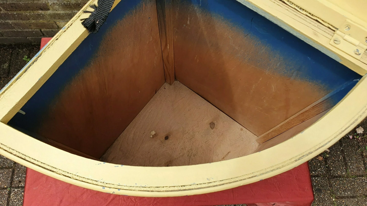 Painted yellow but originally blue. The finish has been com[promised in a number of places with the blue coming through.
