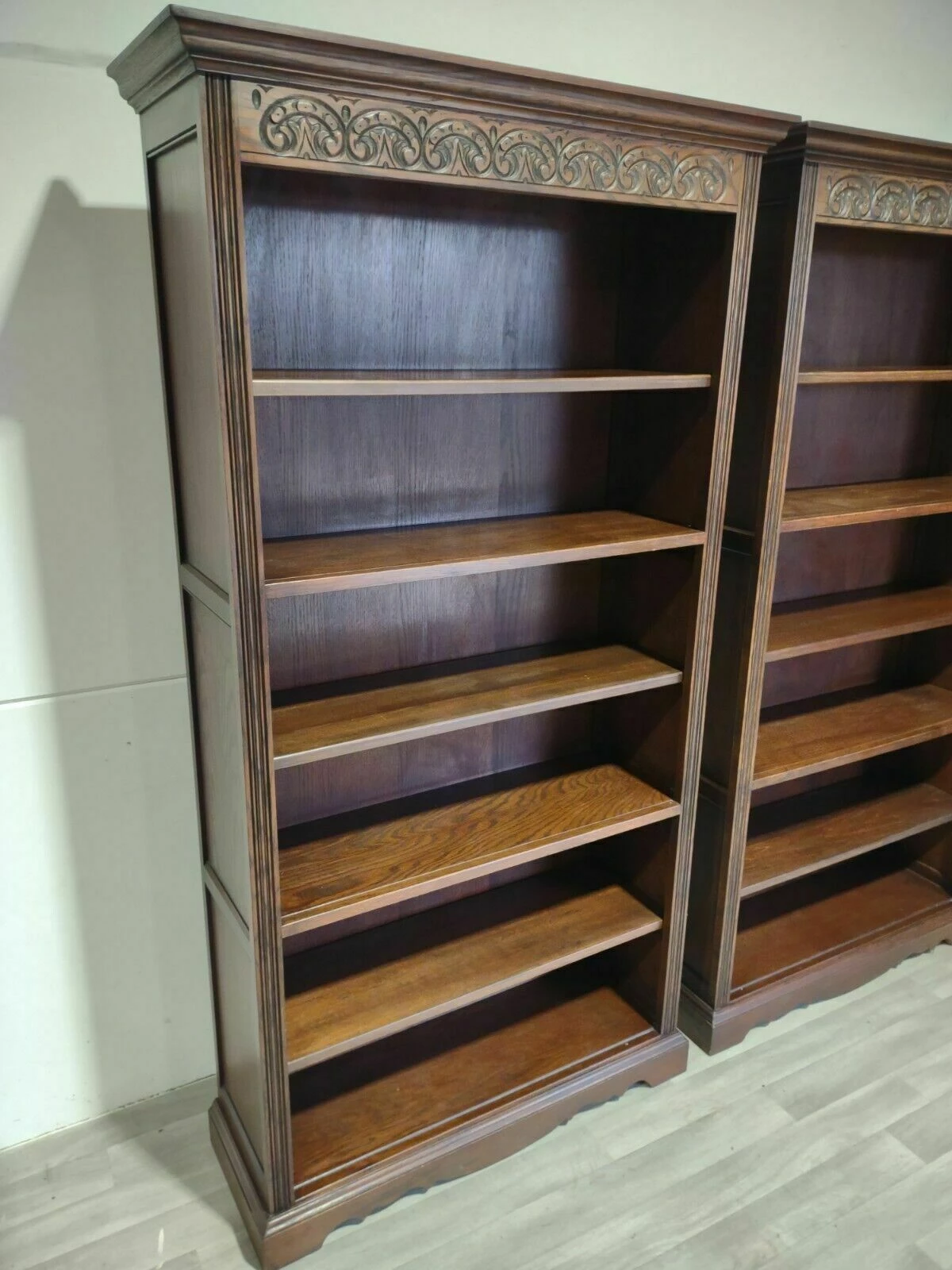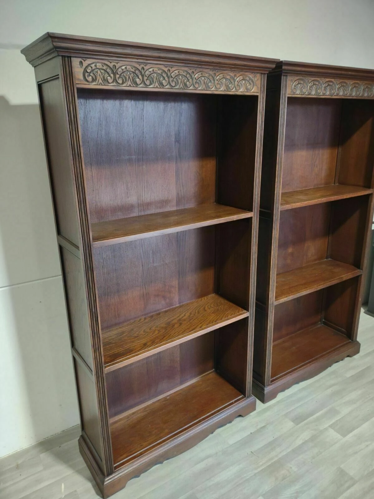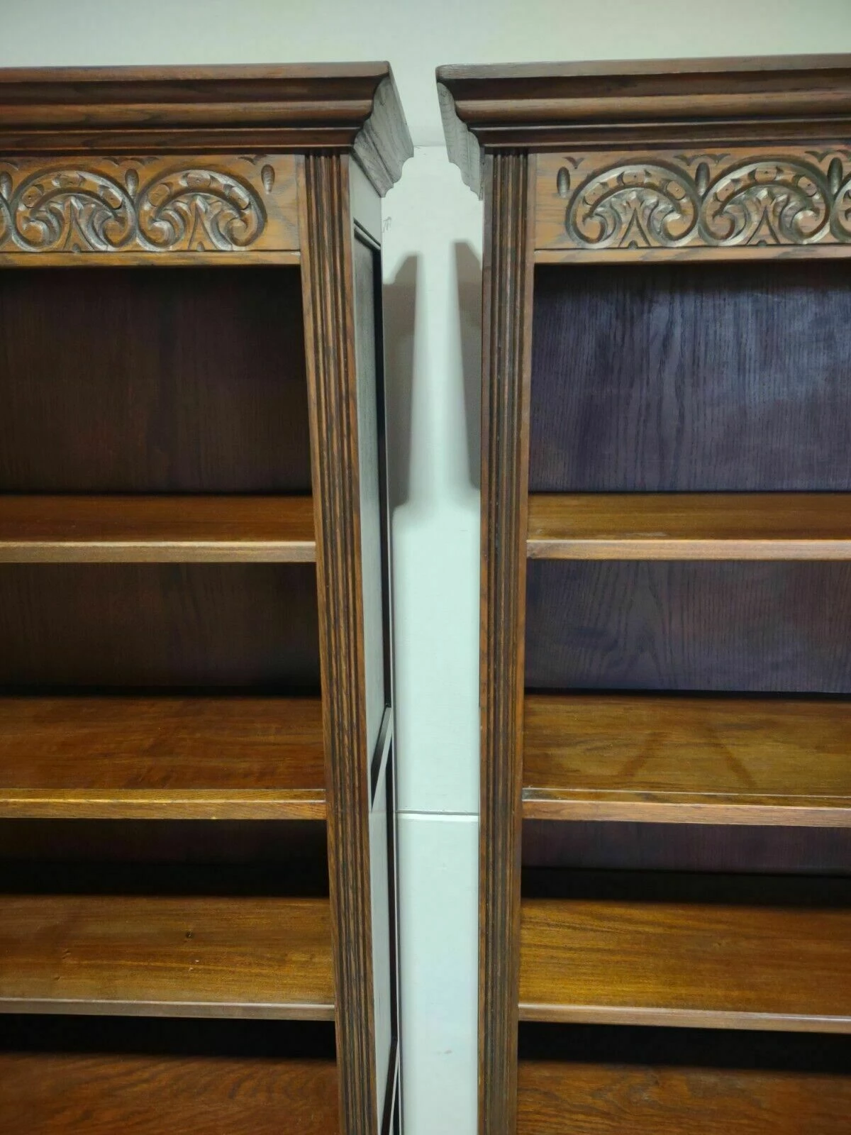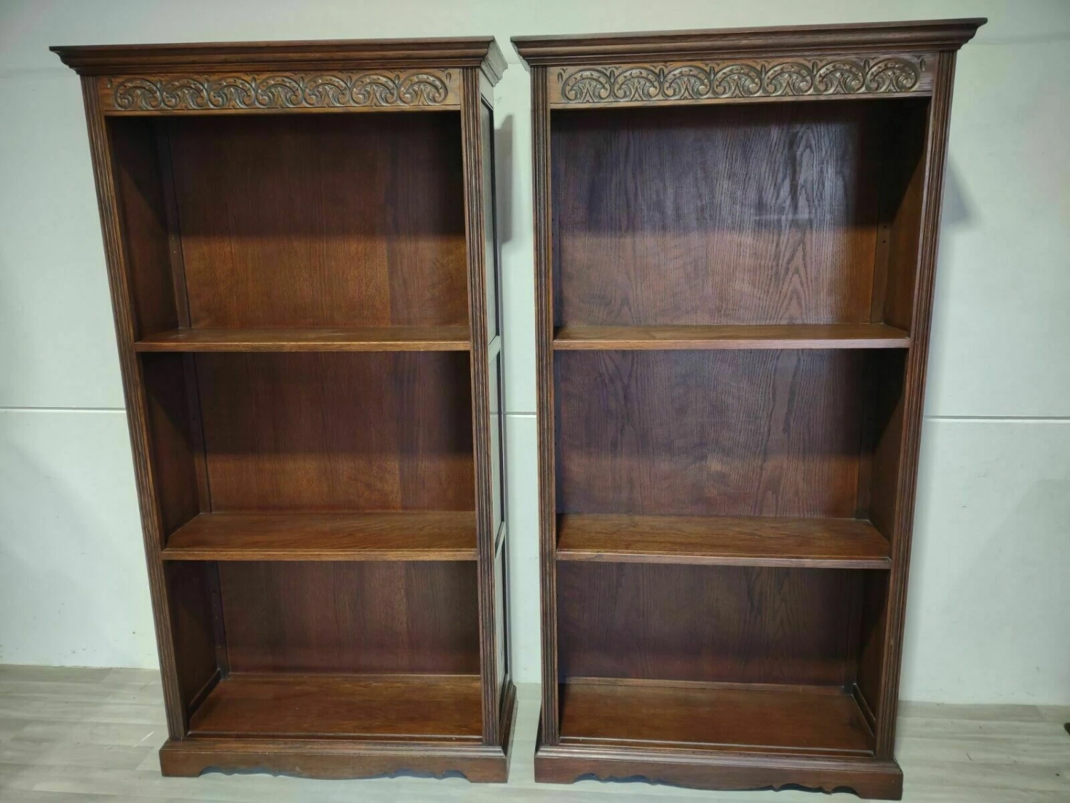 Pair of Old Charm oak bookcases by Wood Bros Furniture, Uk made. Each bookcase has 2 fixed and 3 adjustable shelves.