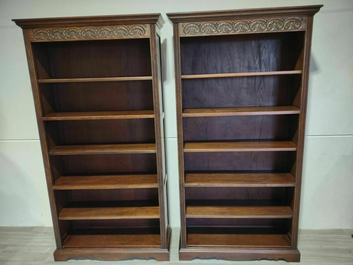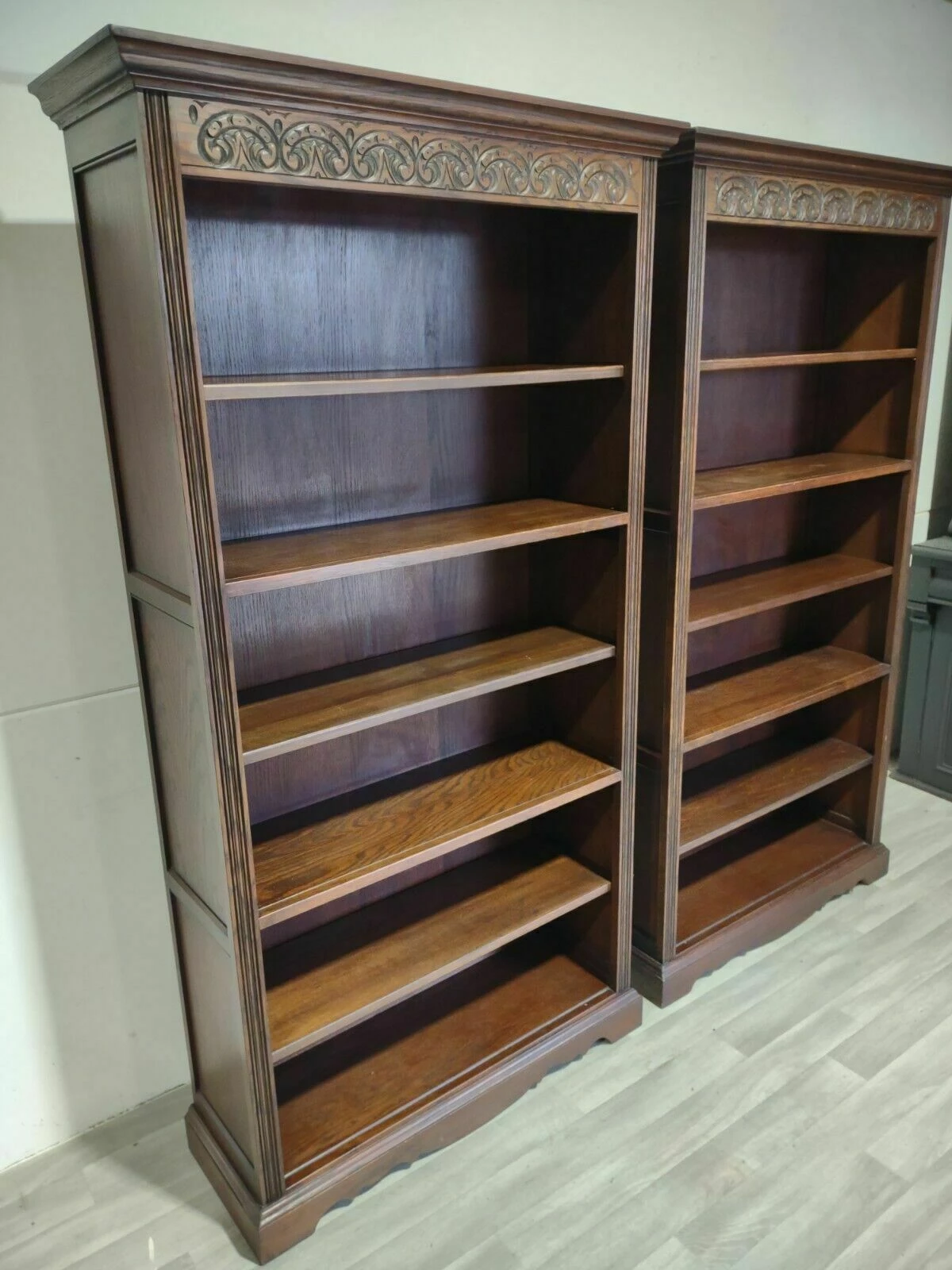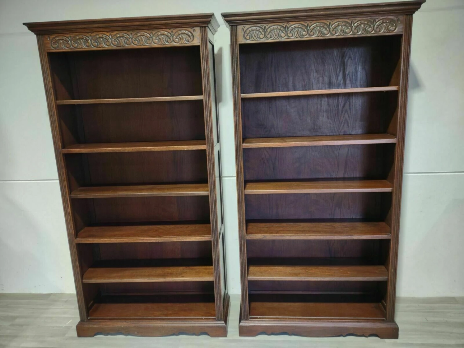 Pair of Old Charm oak bookcases by Wood Bros Furniture, Uk made. Each bookcase has 2 fixed and 3 adjustable shelves.